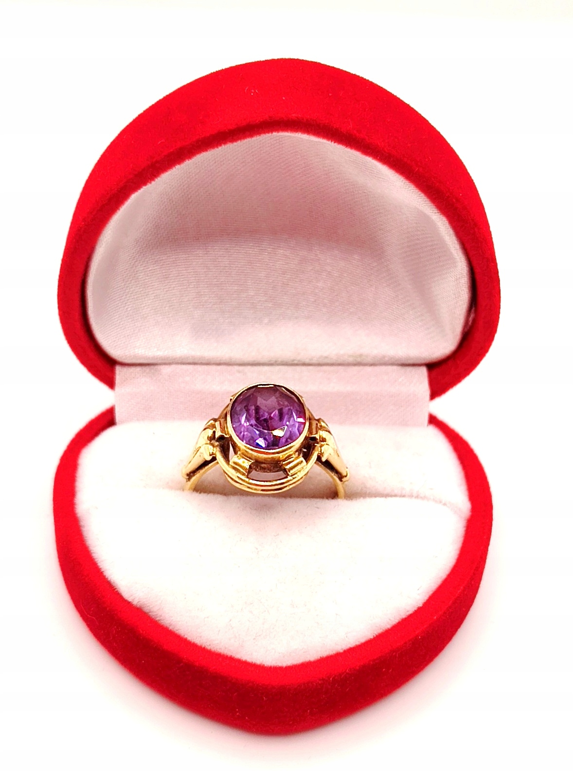 Oferujemy na sprzedaż złoty pierścionek ozdobiony syntetycznym ametystem.