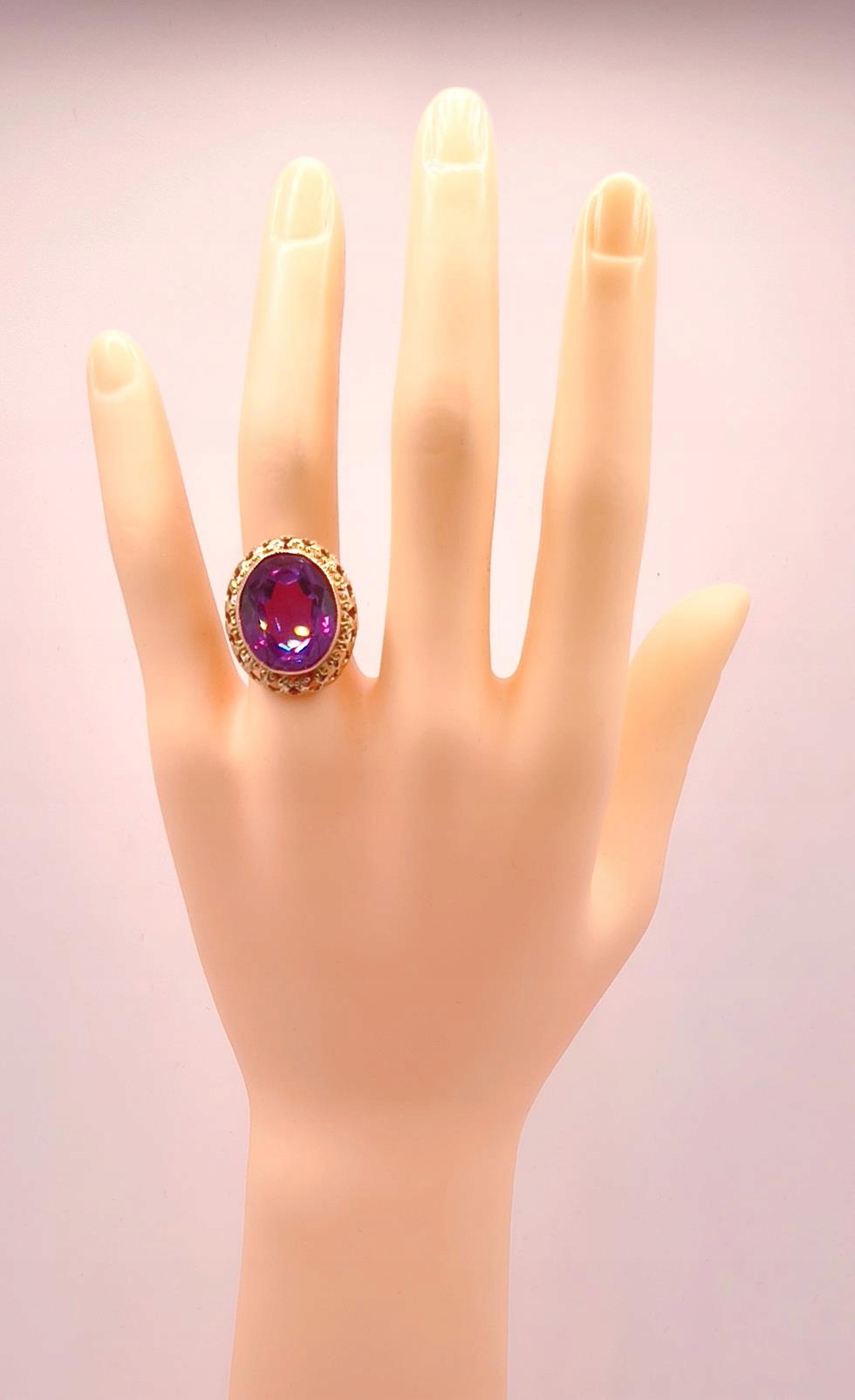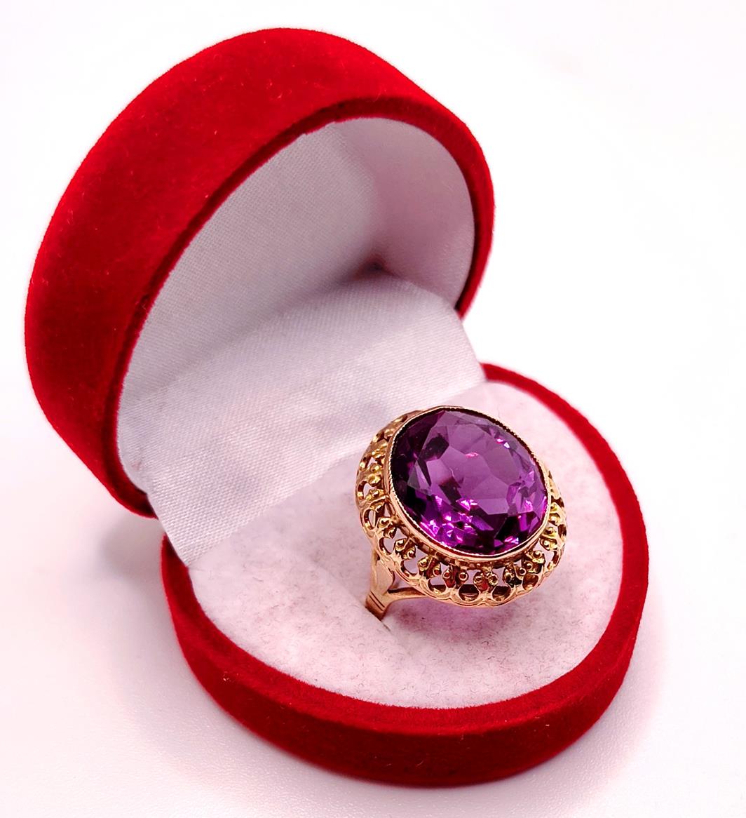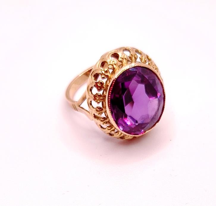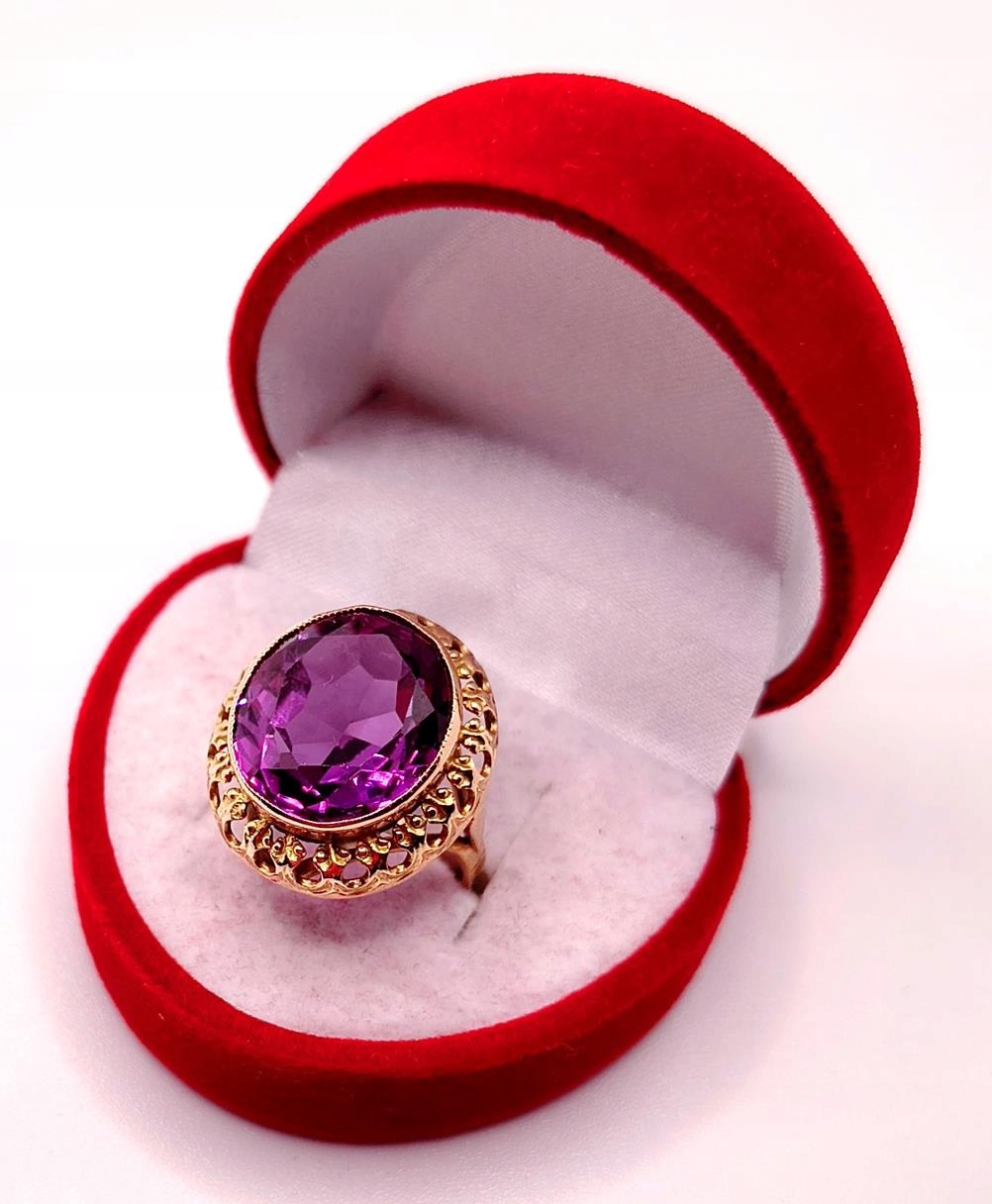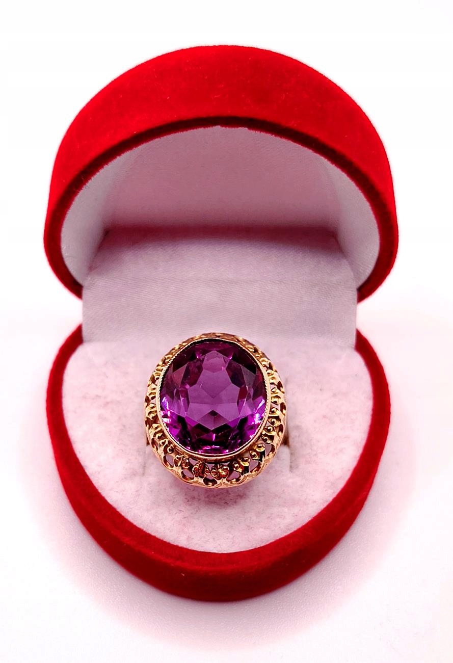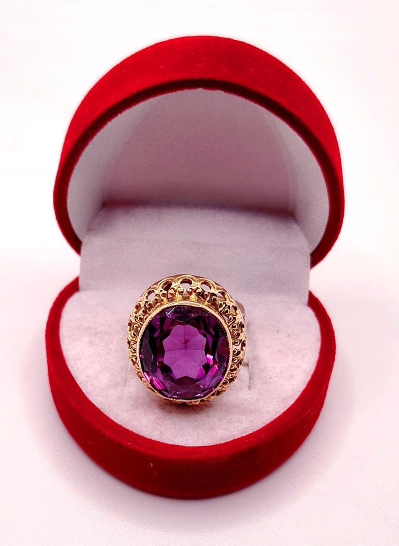 W ofercie sprzedaży posiadamy piękny, złoty pierścionek ozdobiony syntetycznym ametystem.