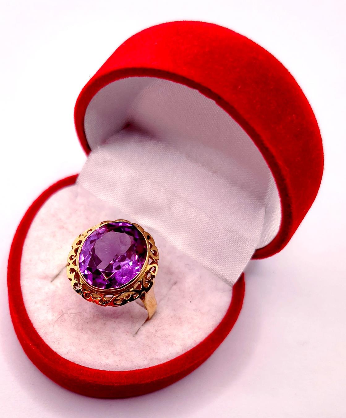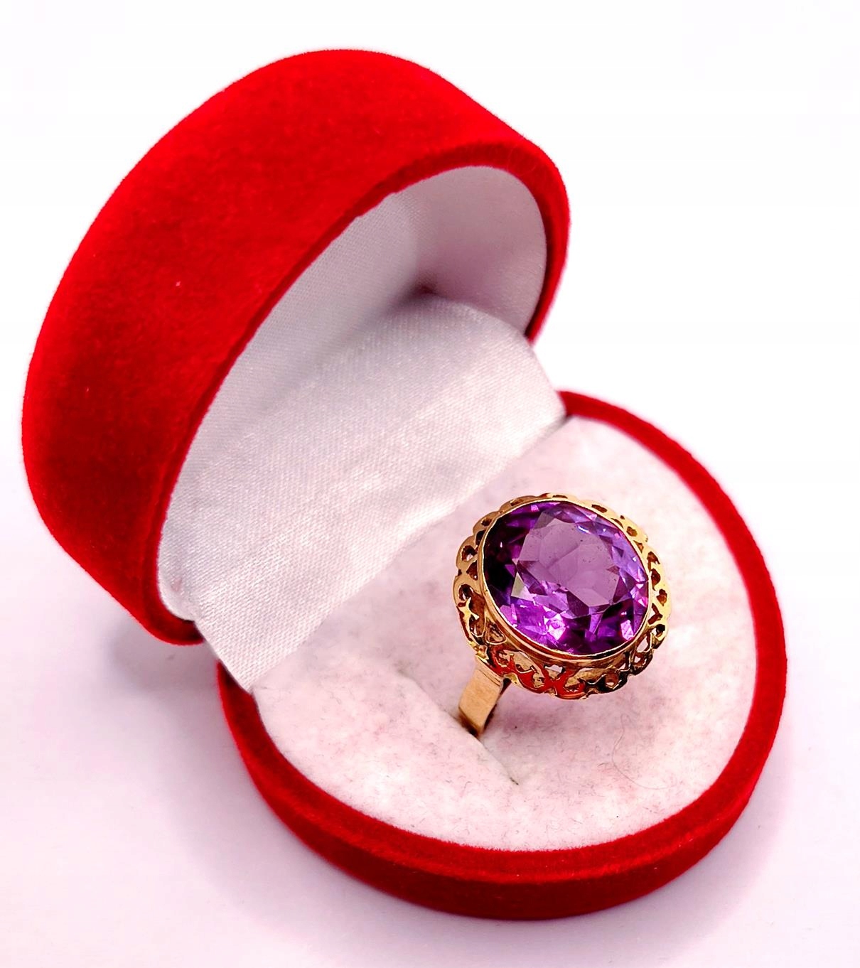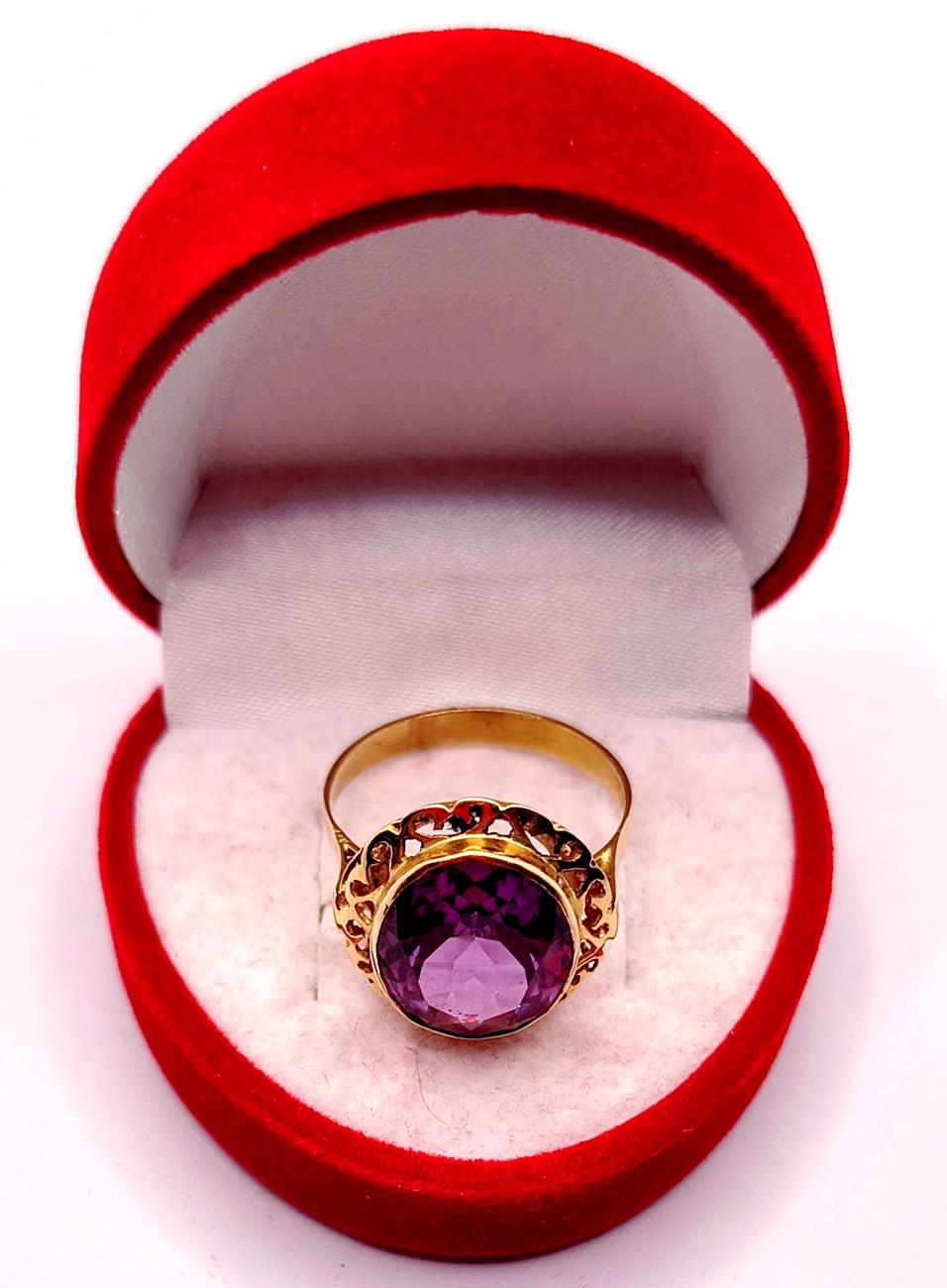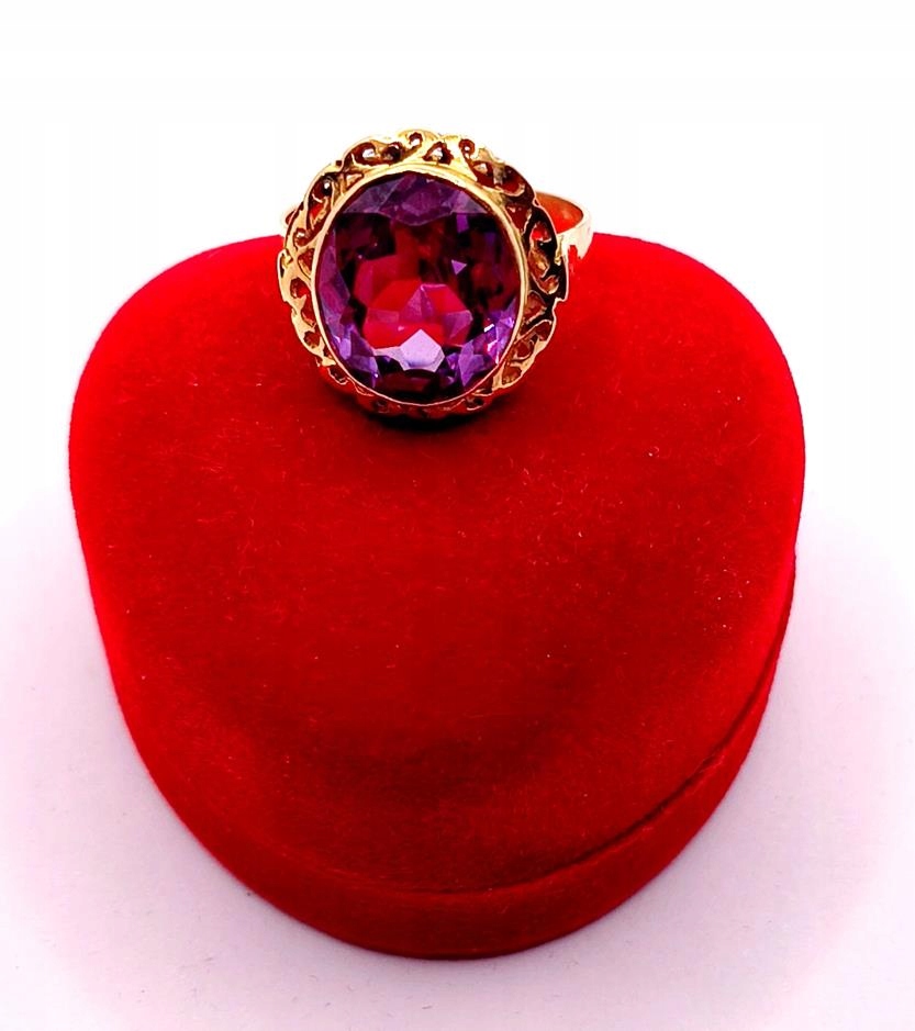 W ofercie sprzedaży posiadamy piękny, złoty pierścionek ozdobiony syntetycznym ametystem.