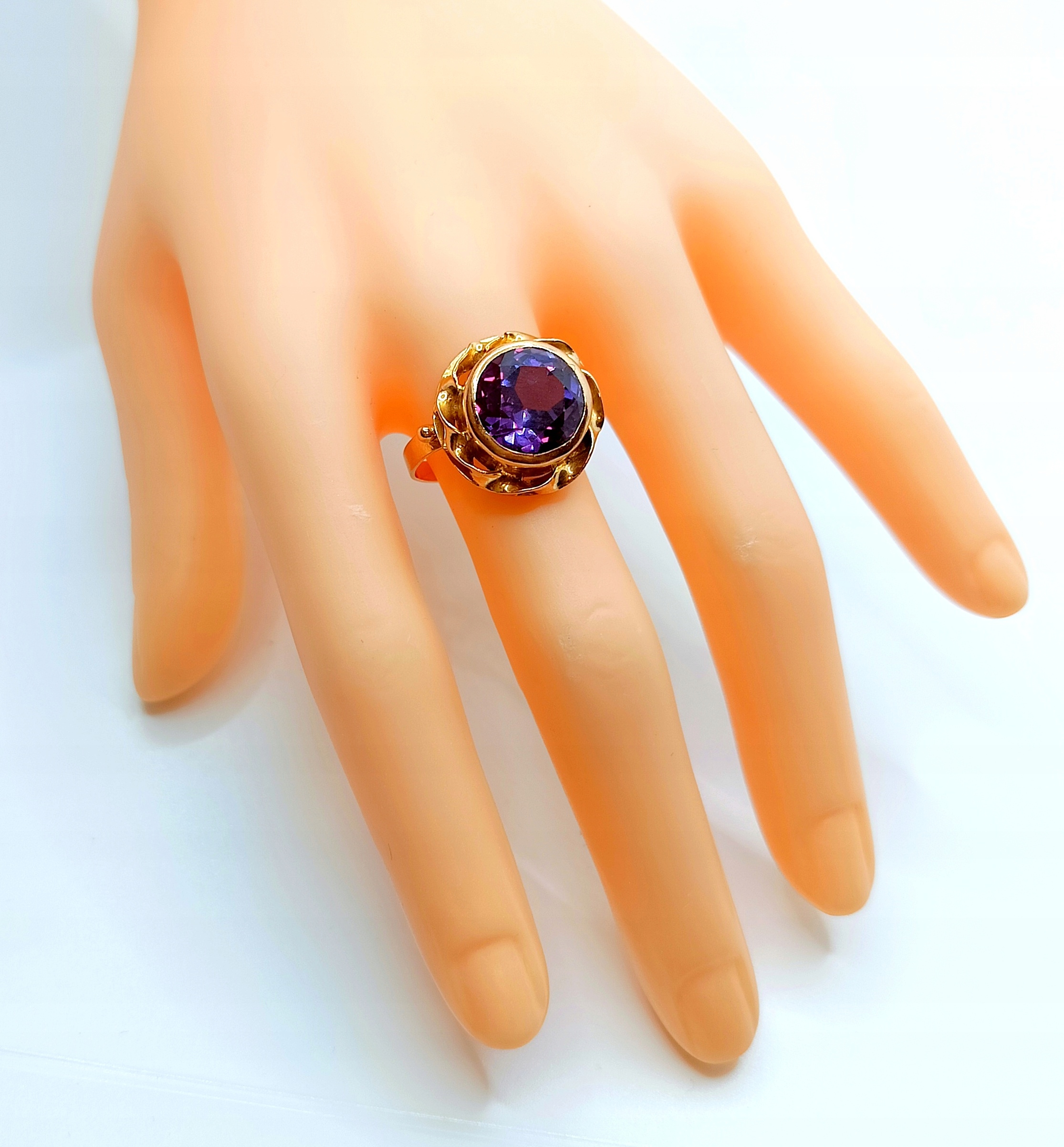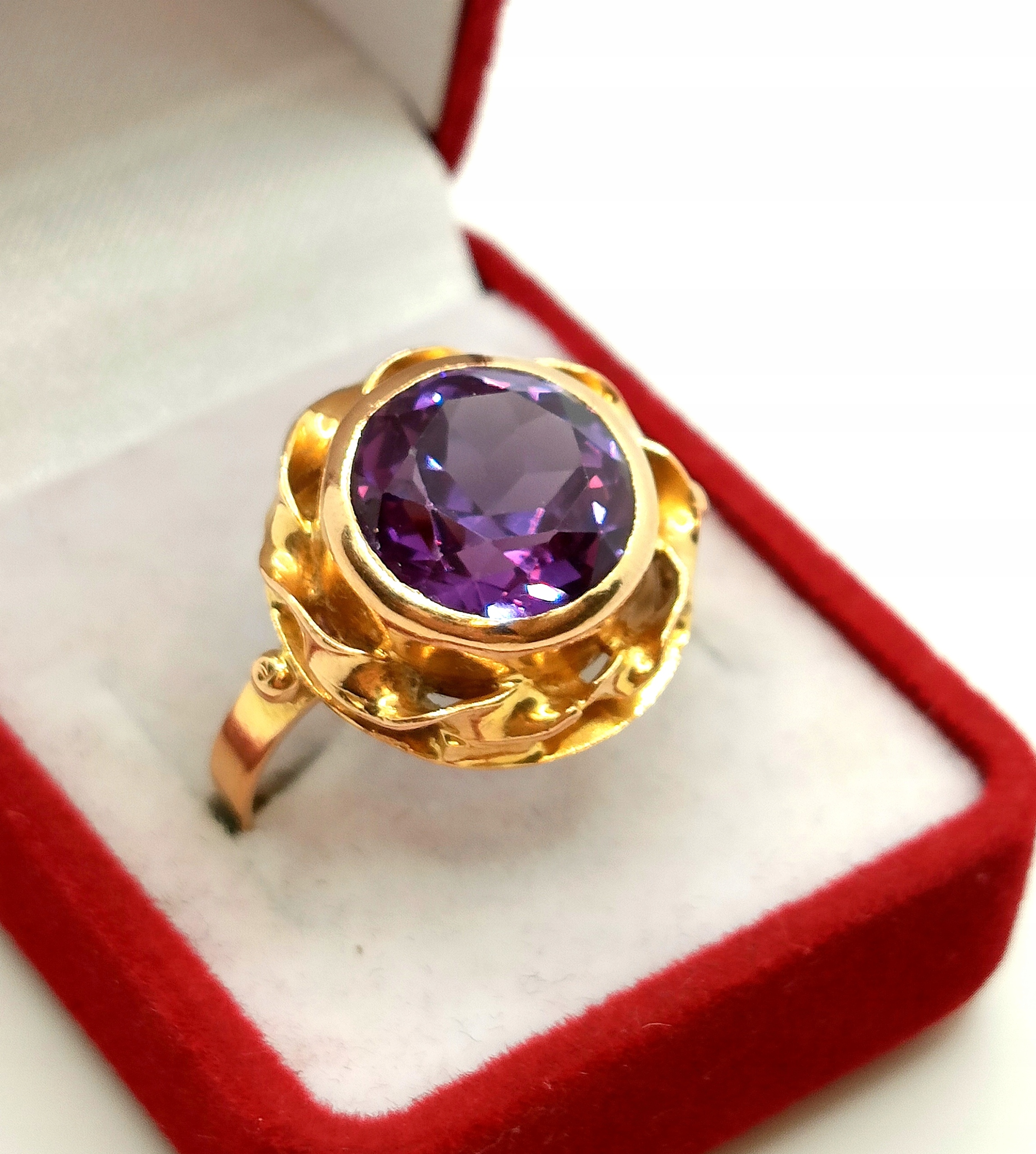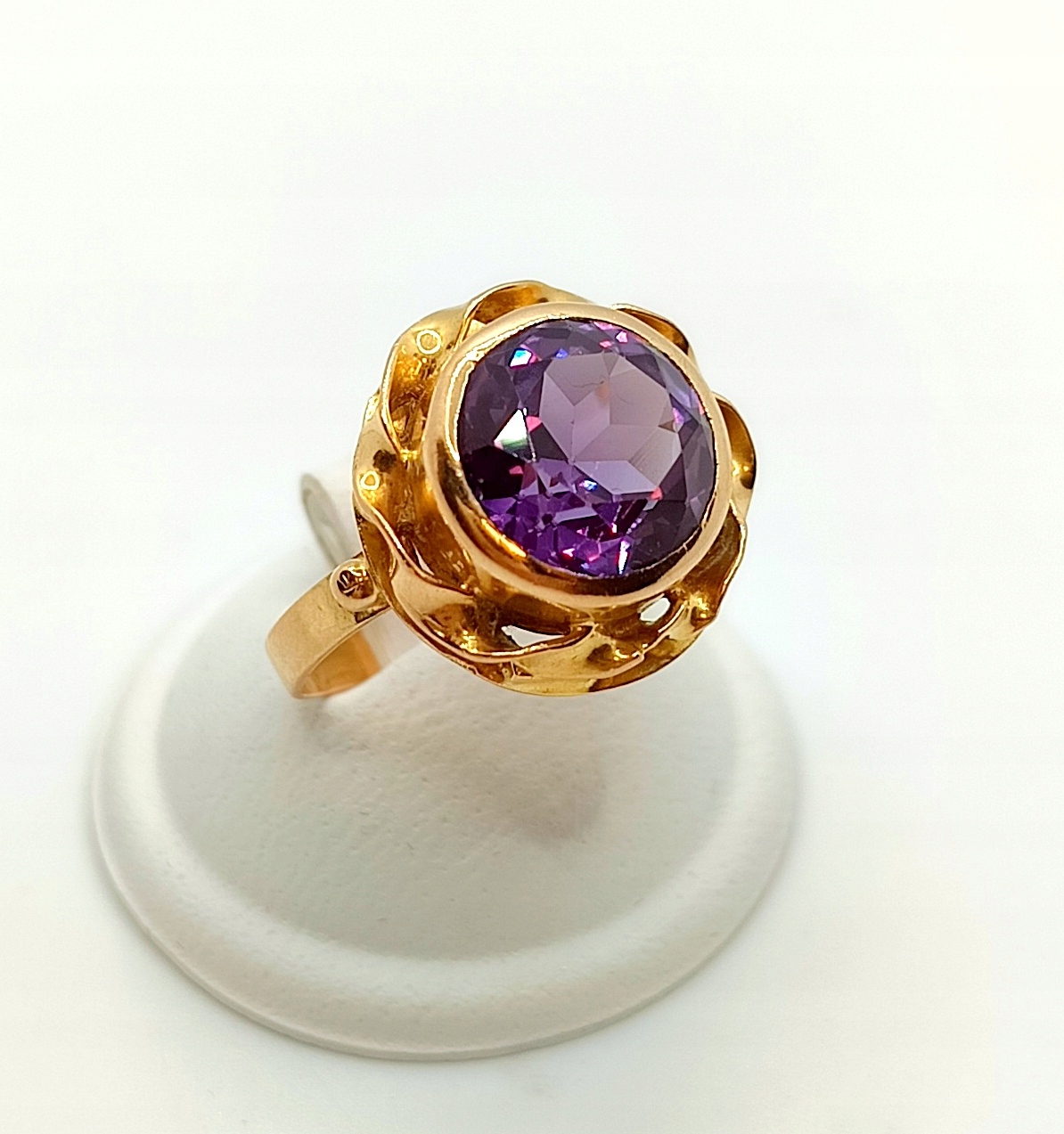 W ofercie na sprzedaż mamy dla Państwa złoty pierścionek ozdobiony okrągłym ametystem osadzonym na pięknie plecionym, złotym koszyczku.