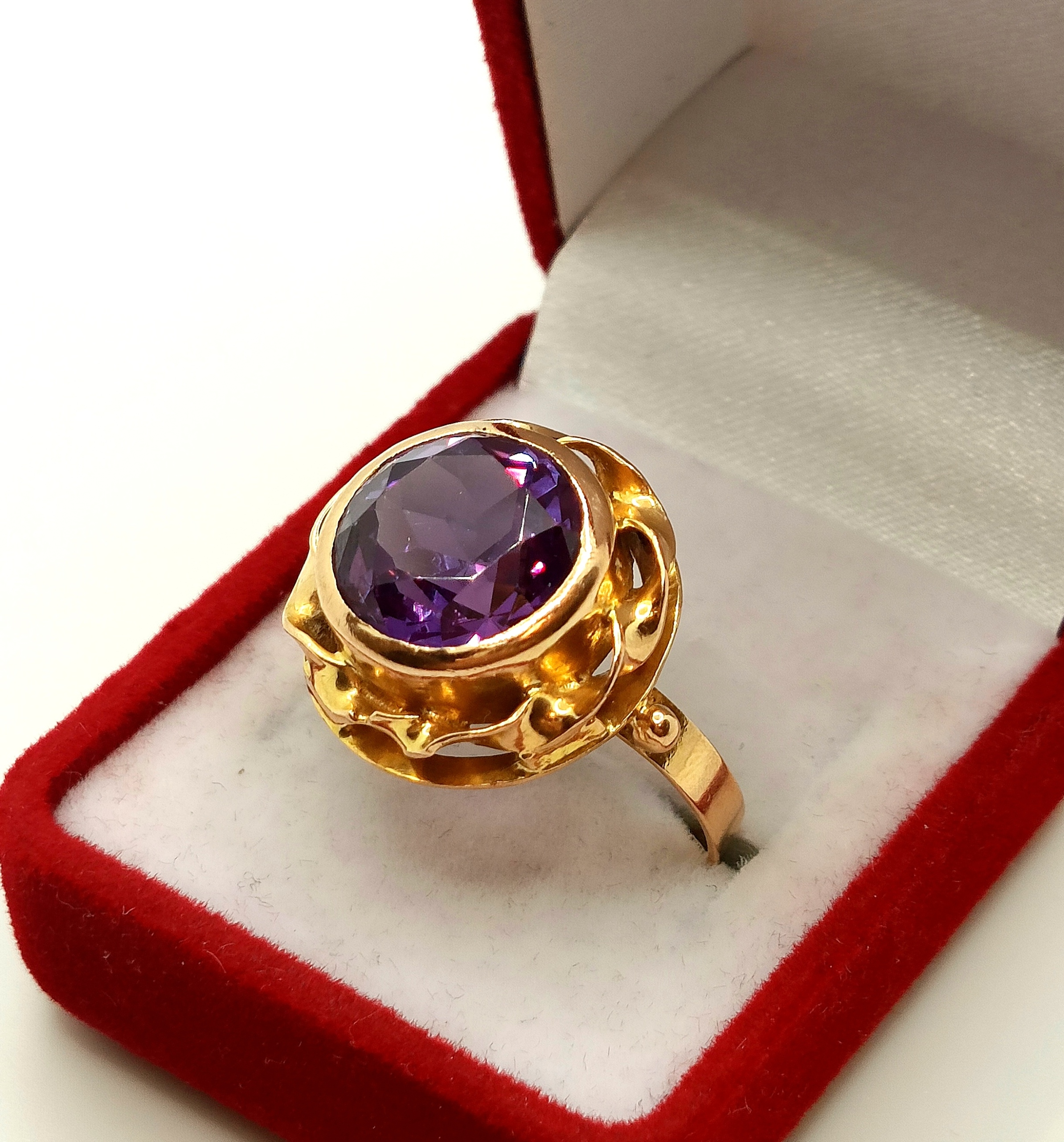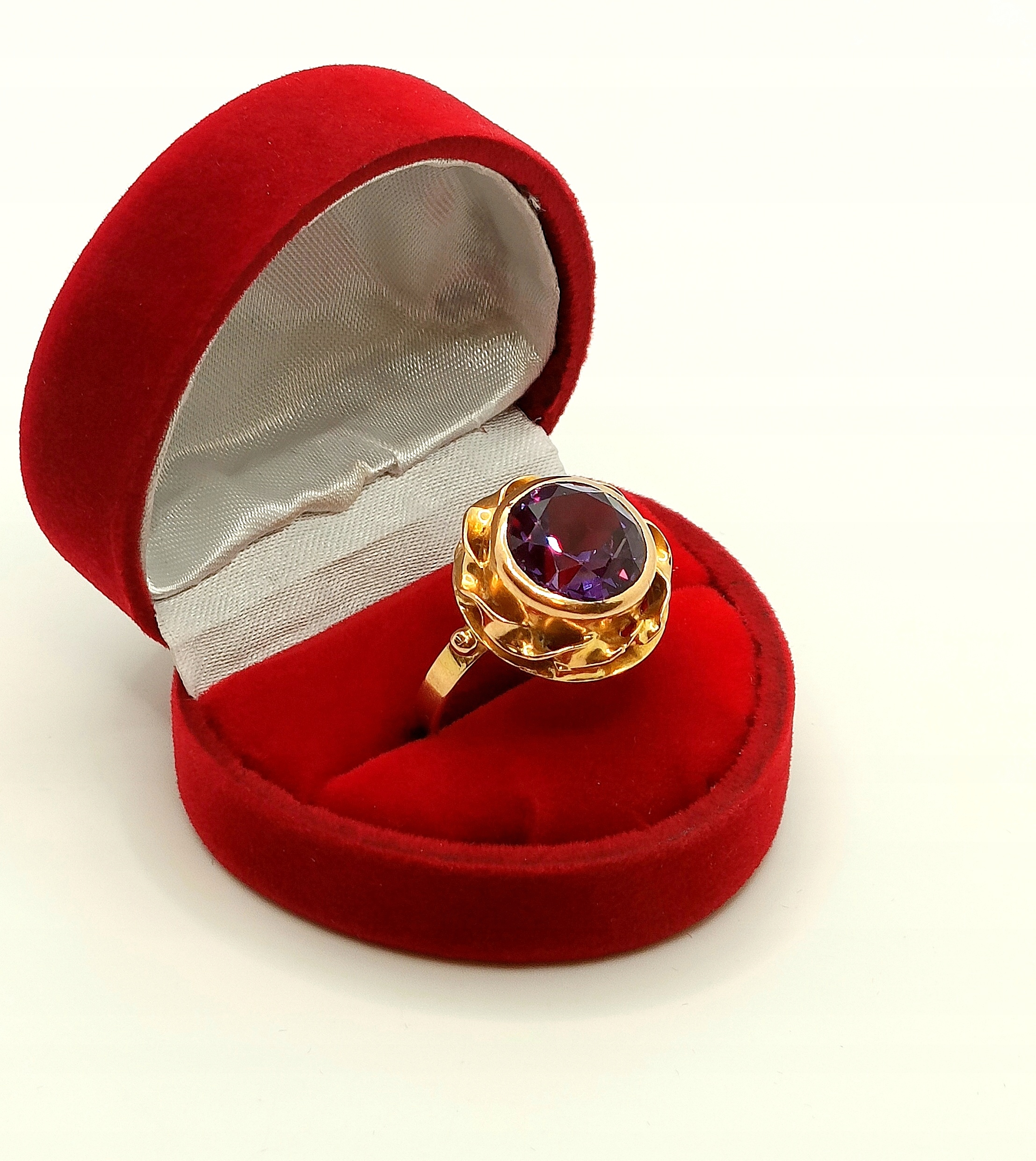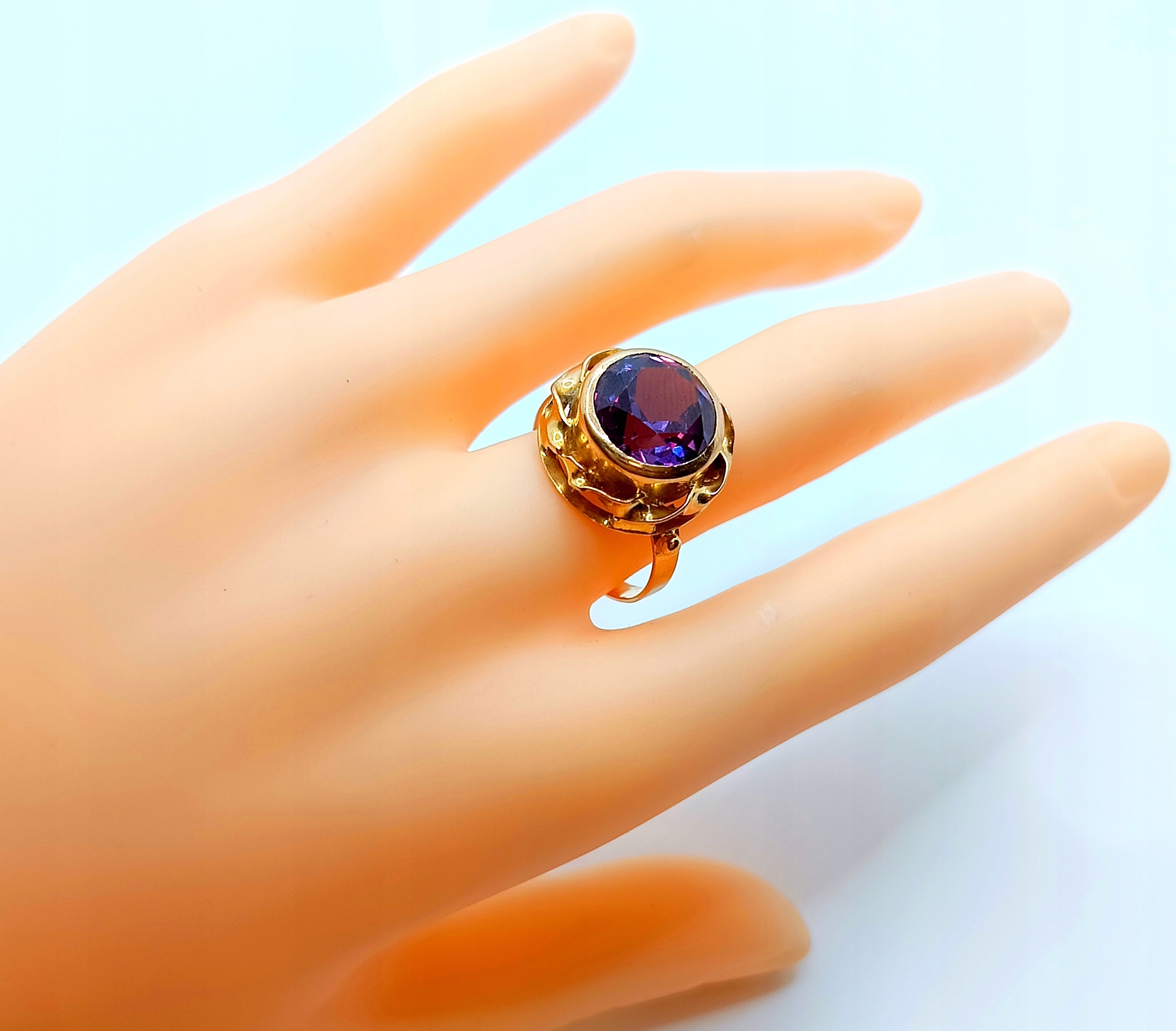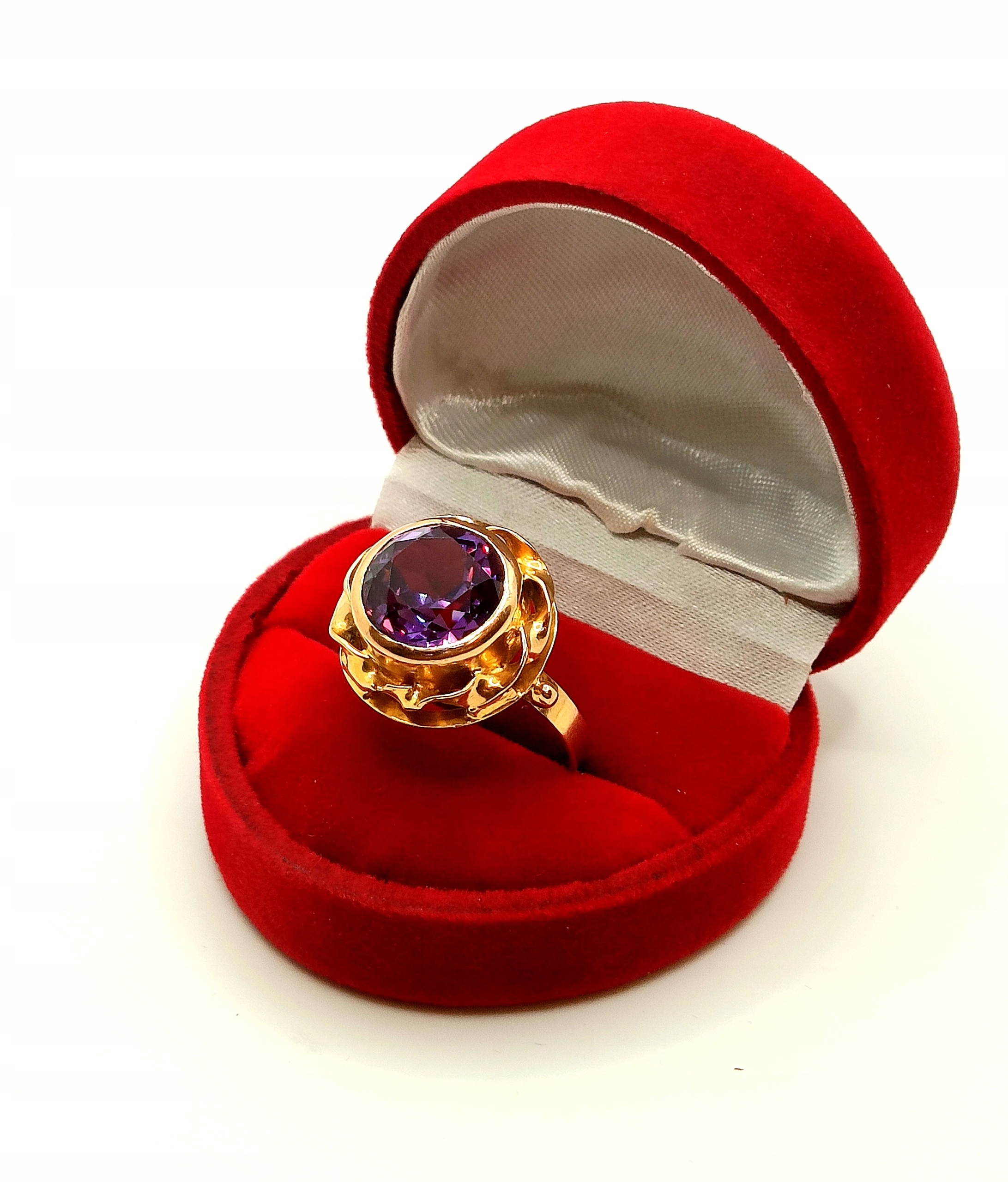 W ofercie na sprzedaż mamy dla Państwa złoty pierścionek ozdobiony okrągłym ametystem osadzonym na pięknie plecionym, złotym koszyczku.