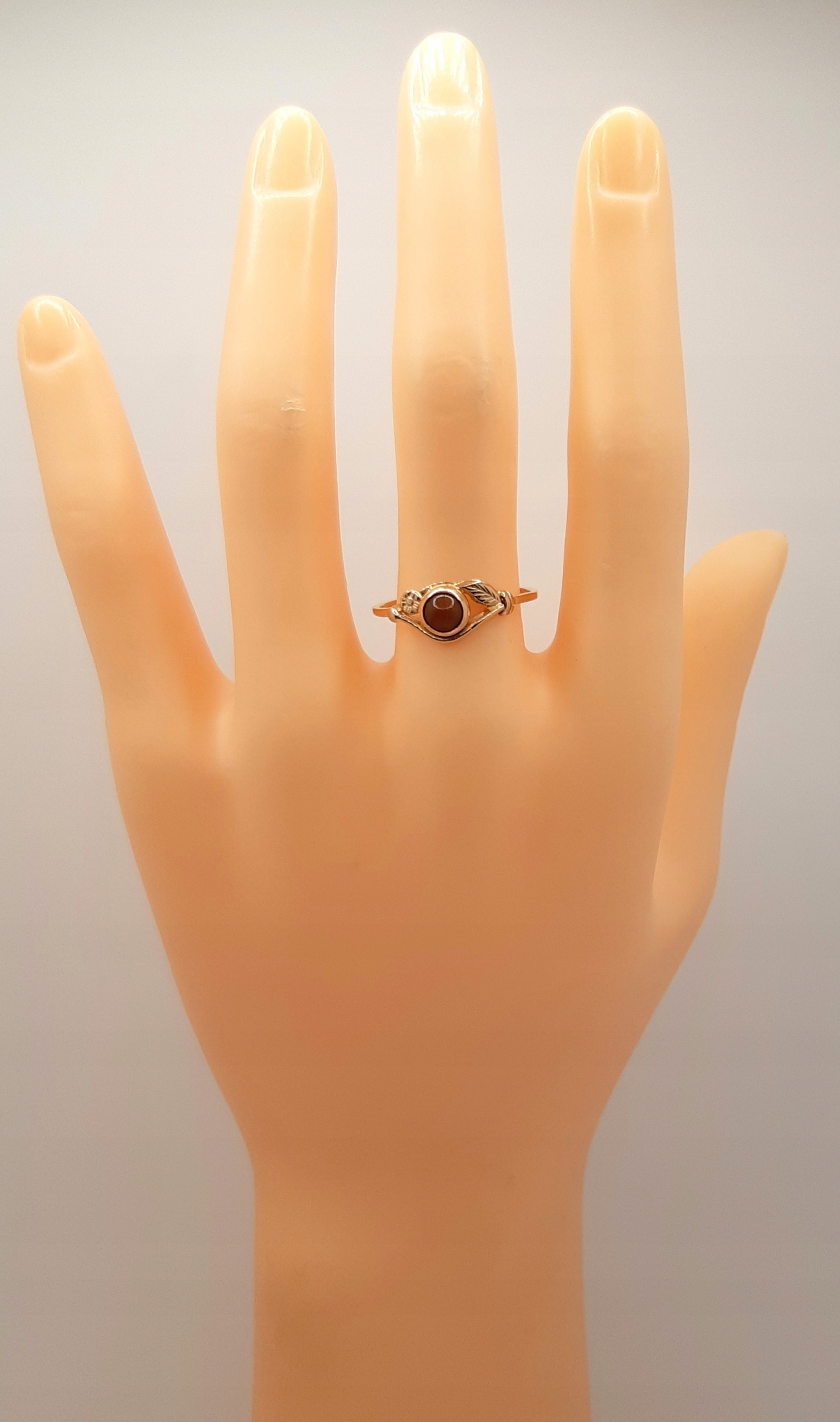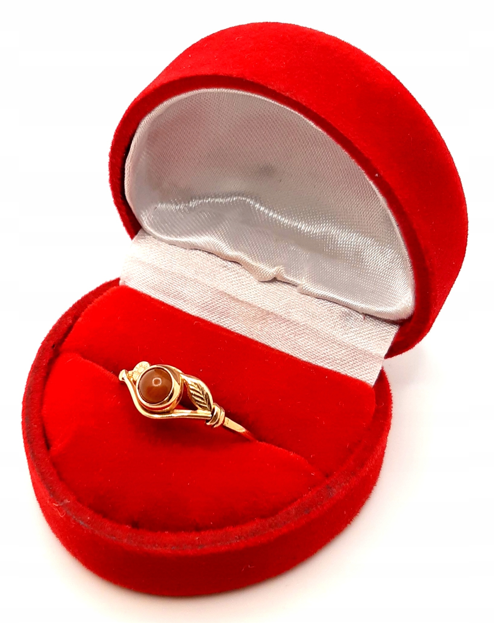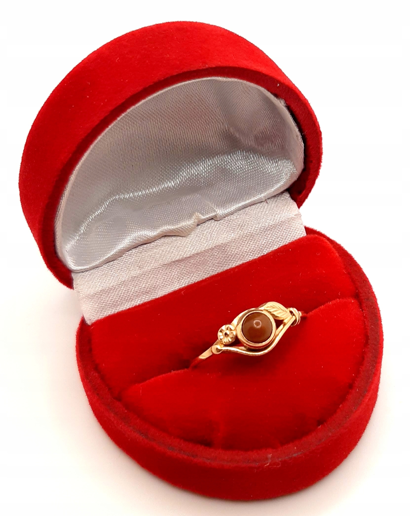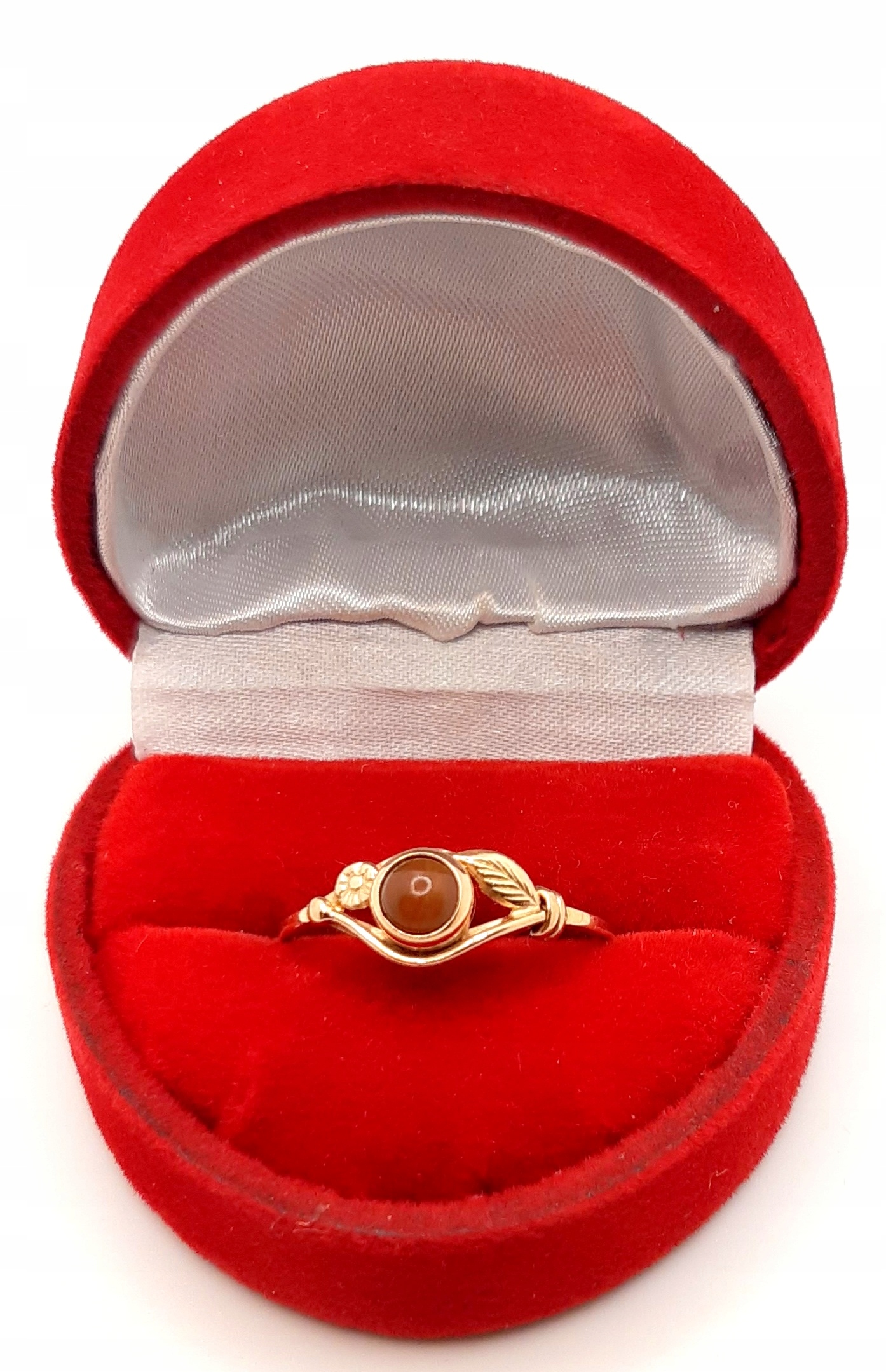 Oferujemy na sprzedaż piękny, złoty pierścionek ozdobiony brązowym kamieniem.