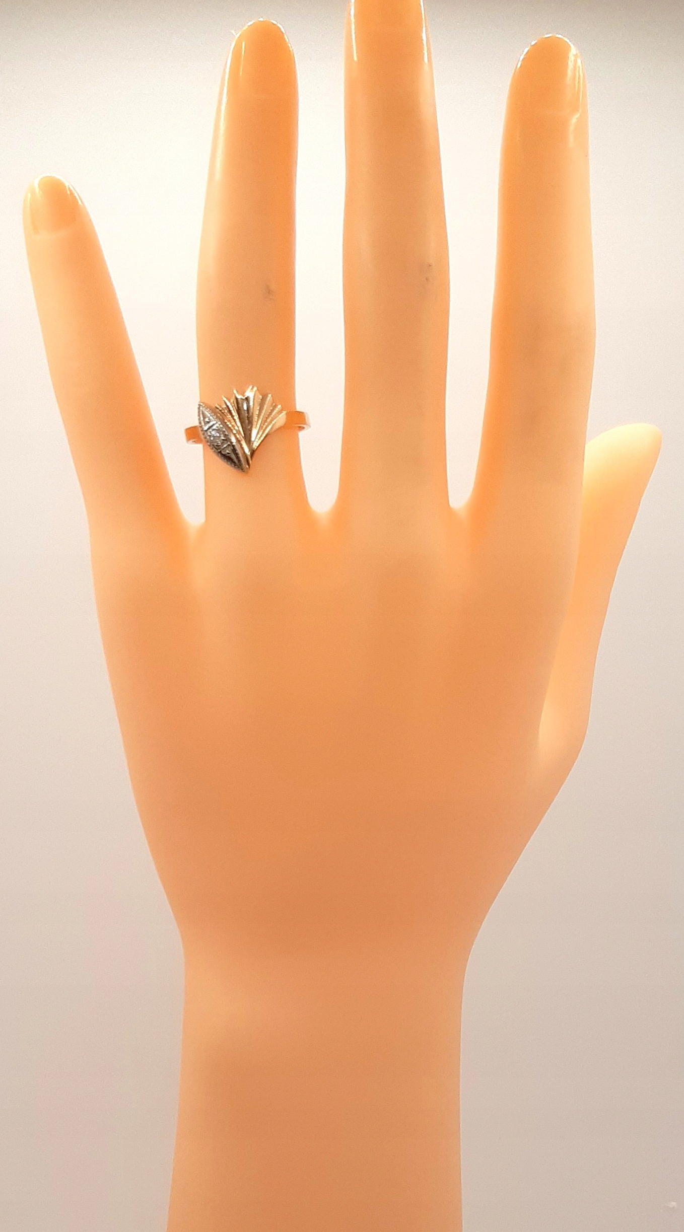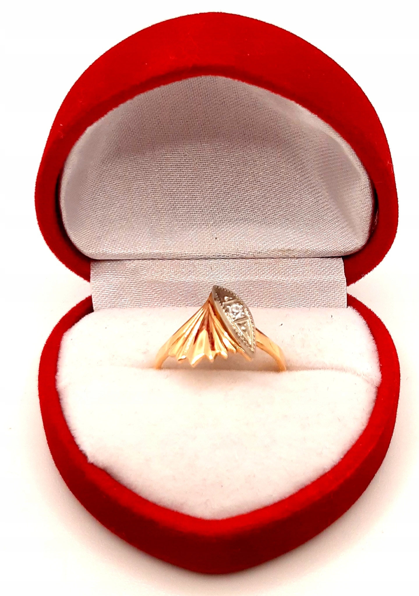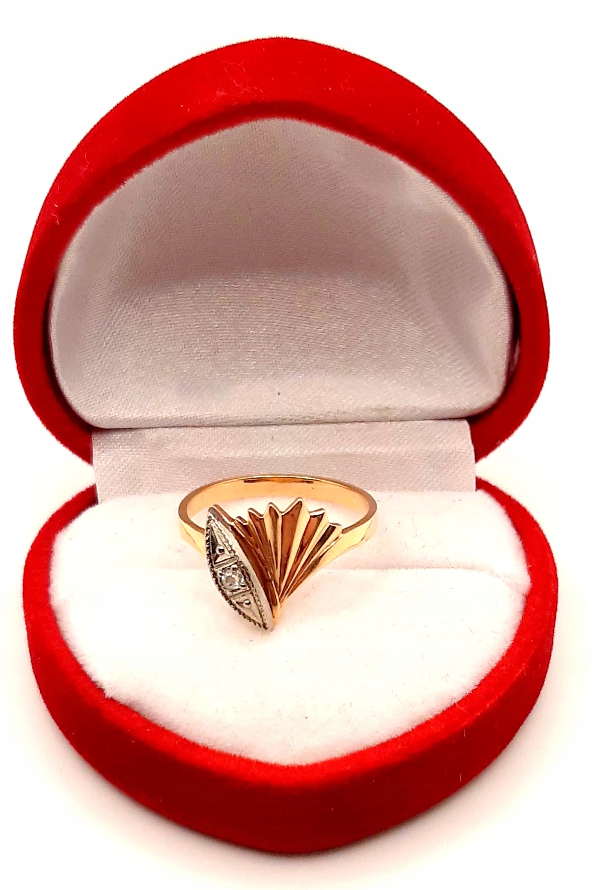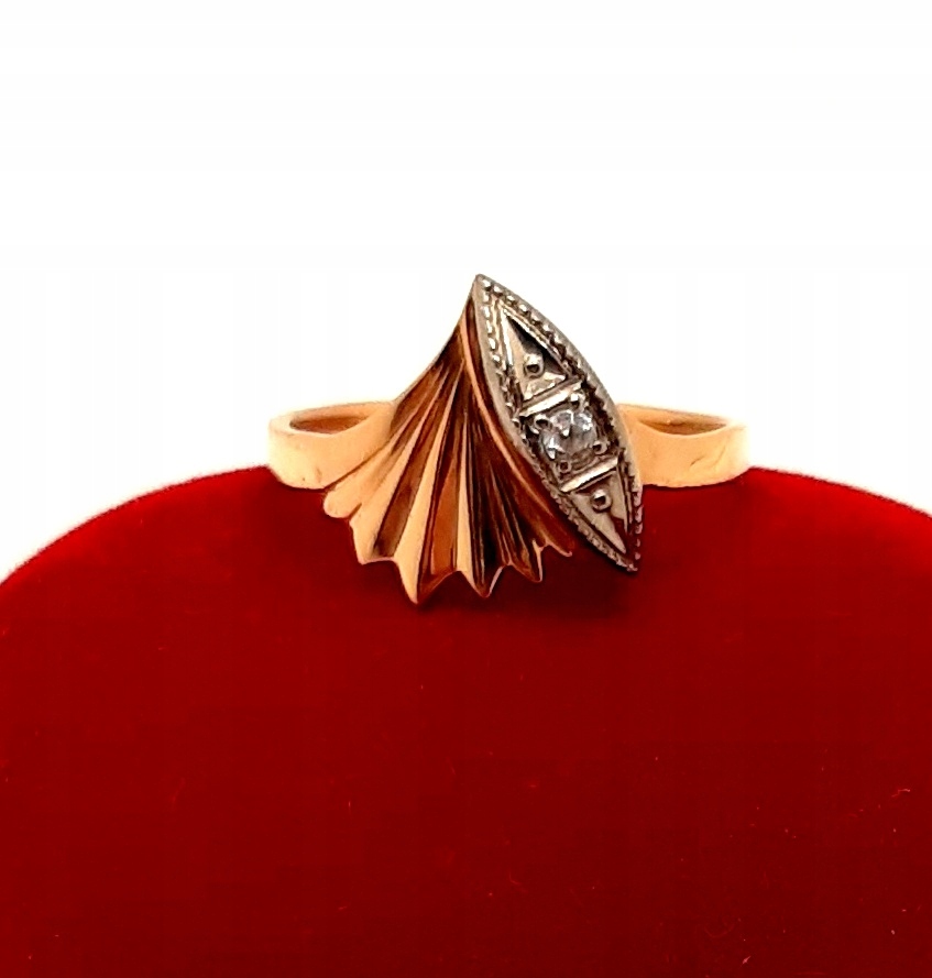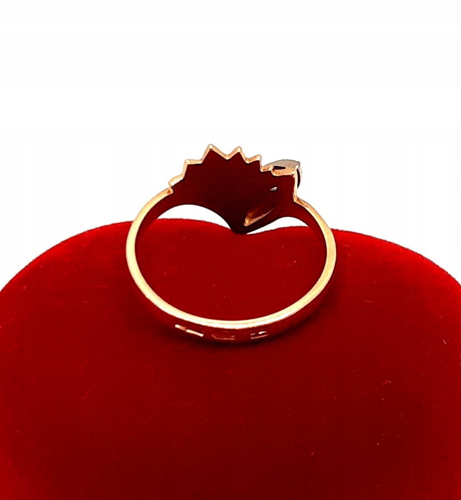 W ofercie na sprzedaż mamy dla państwa złoty pierścionek z ozdobą przypominającą muszlę z cyrkonią.