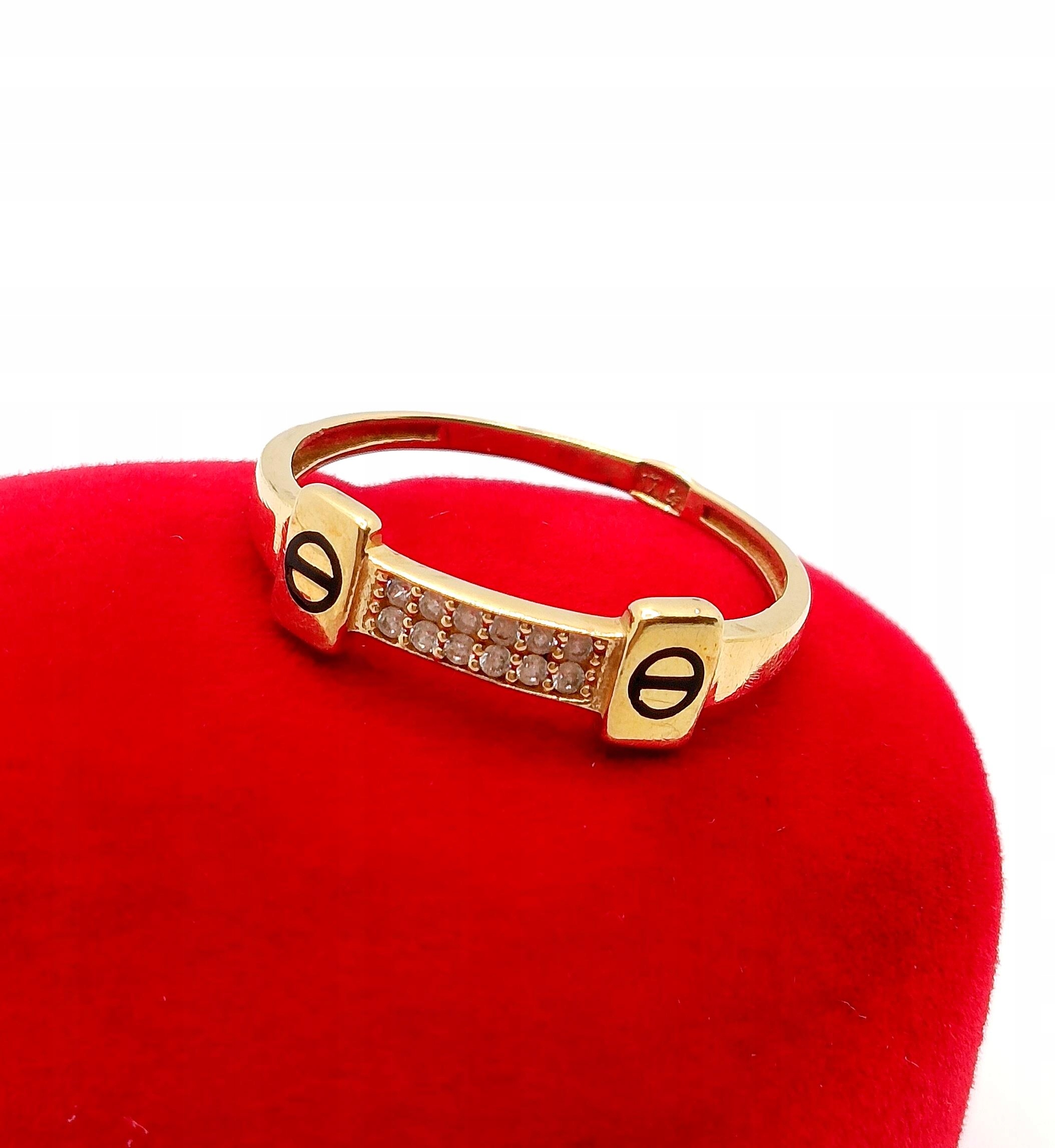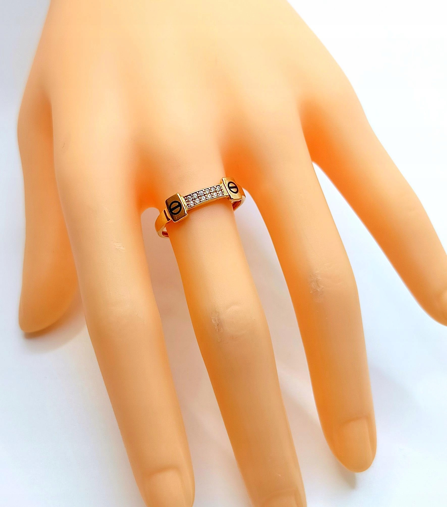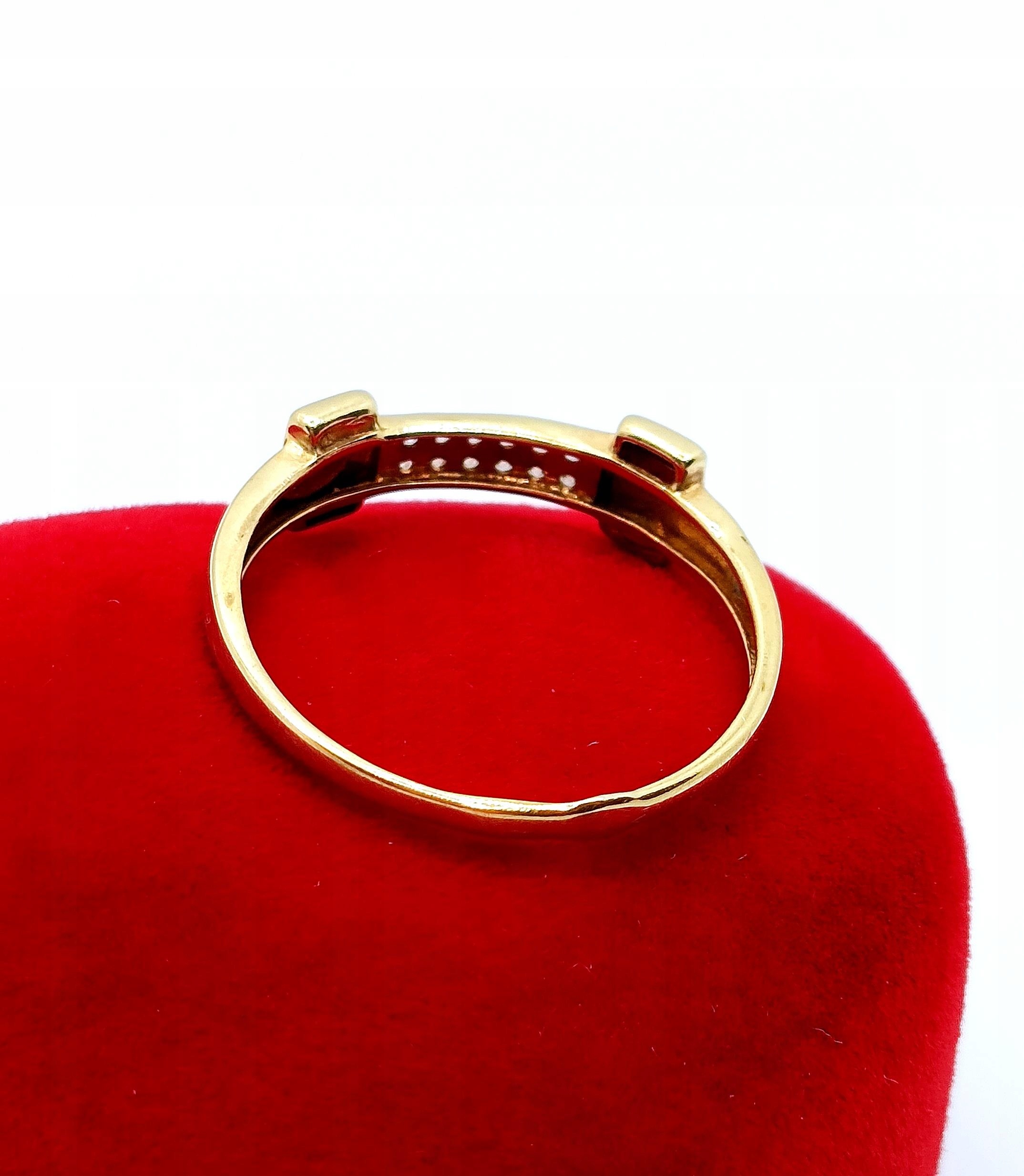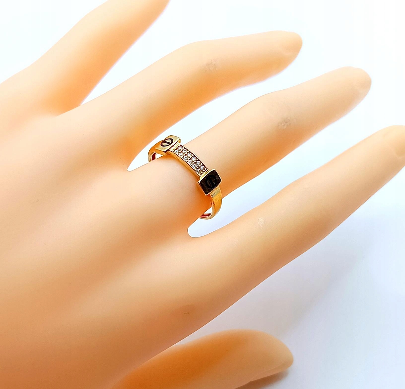 Oferujemy na sprzedaż złoty pierścionek w formie obrączki. Zdobiona cyrkoniami oraz symetrycznymi wzorami z czarnej emalii.