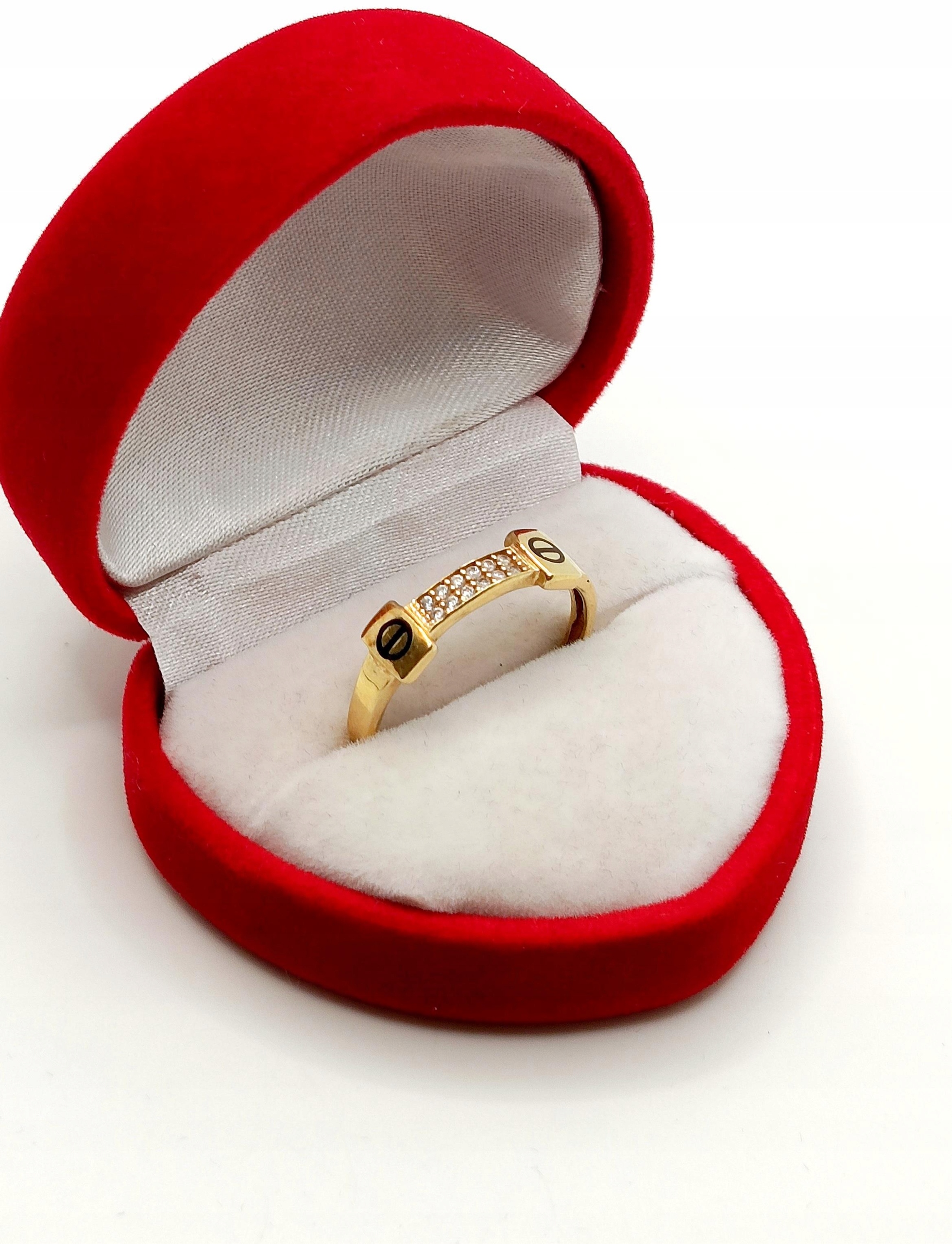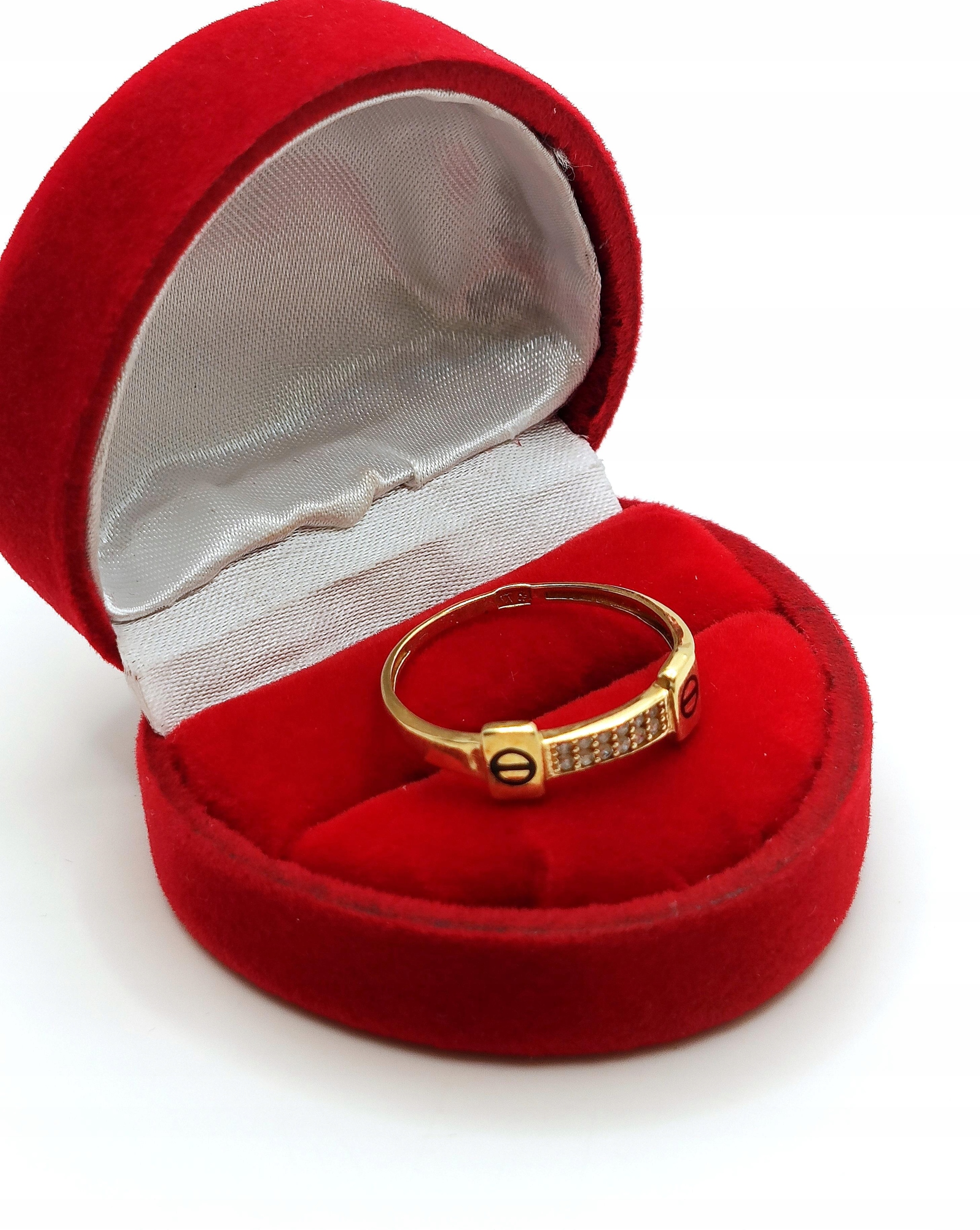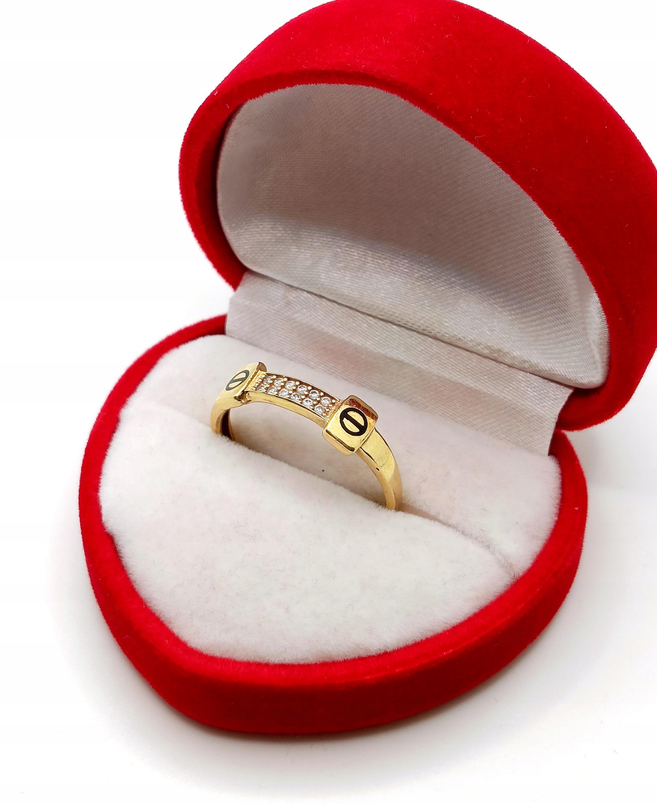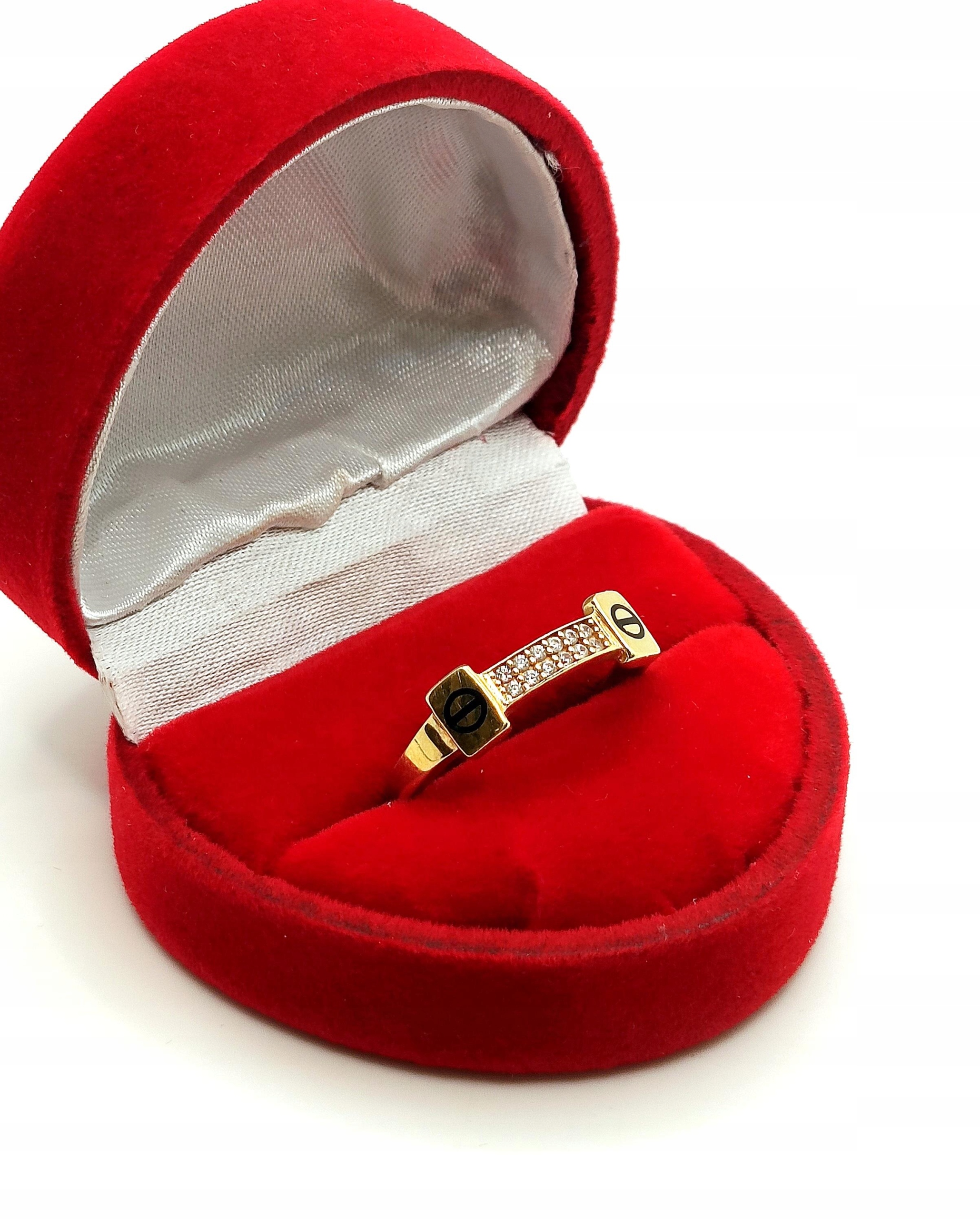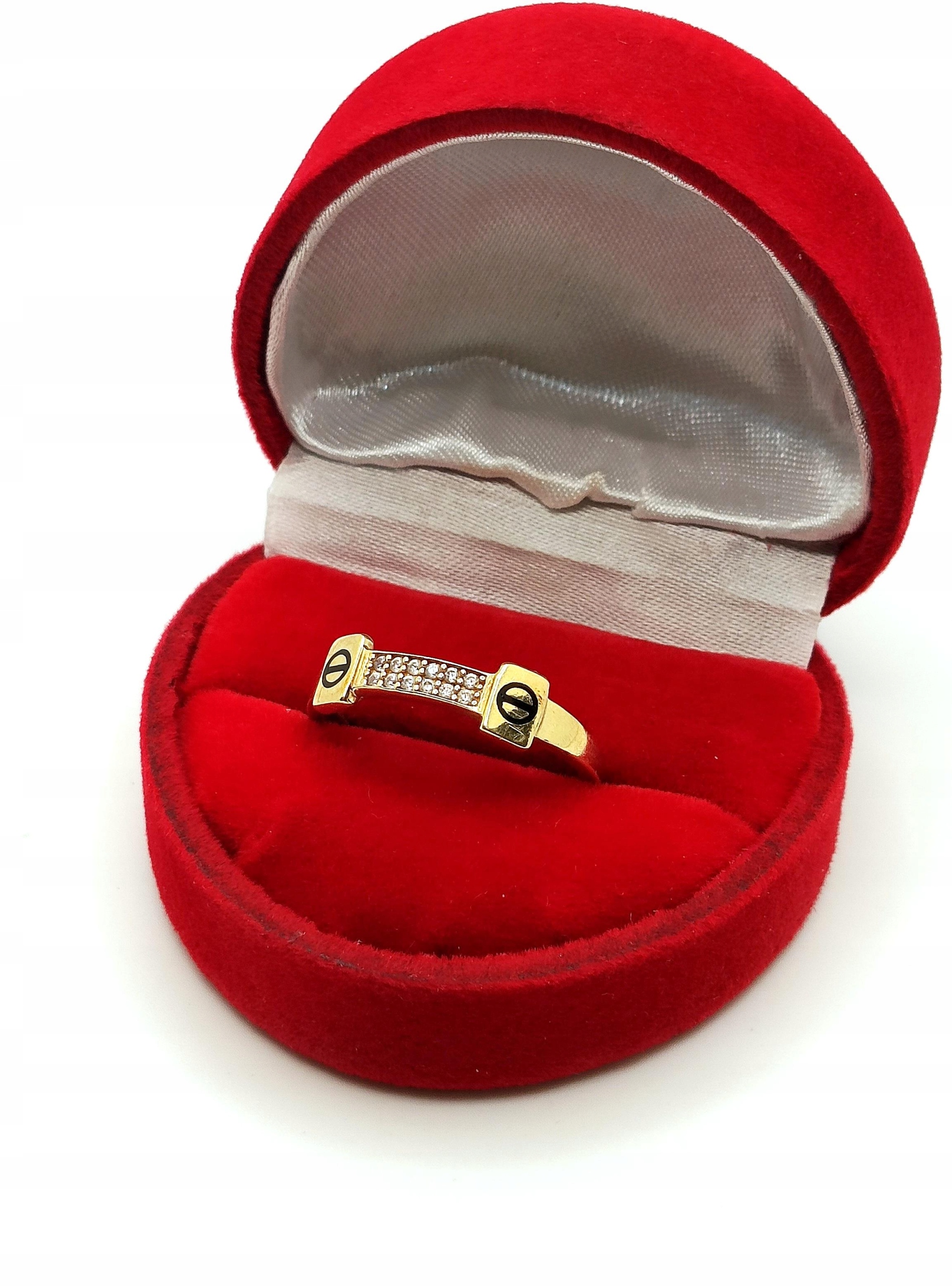 Oferujemy na sprzedaż złoty pierścionek w formie obrączki. Zdobiona cyrkoniami oraz symetrycznymi wzorami z czarnej emalii.