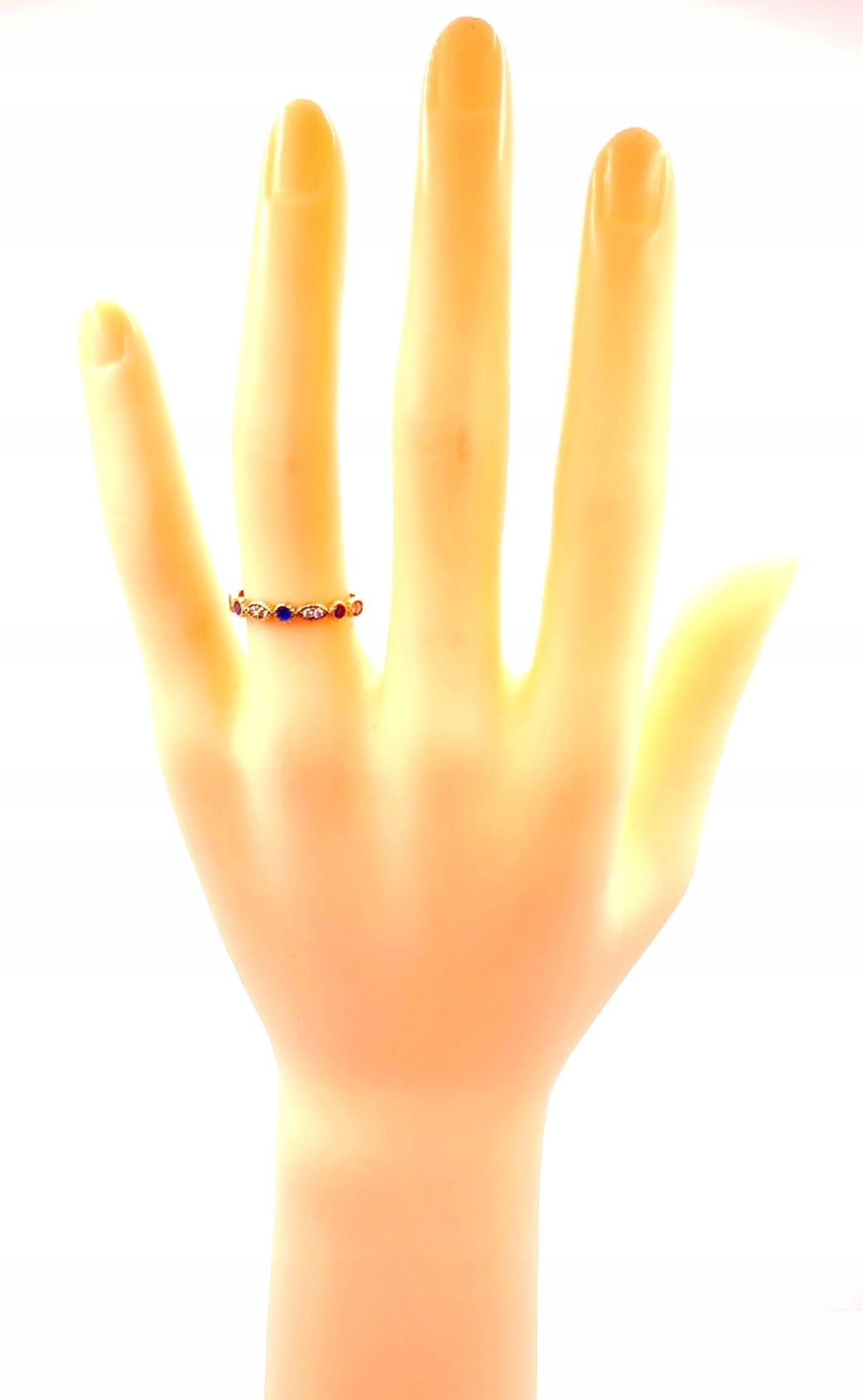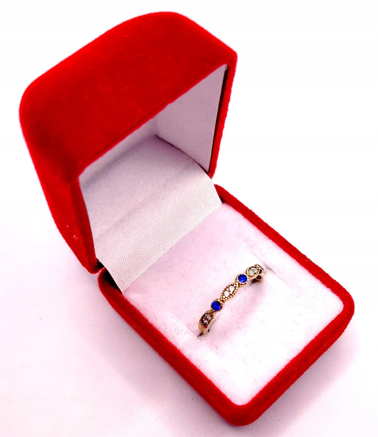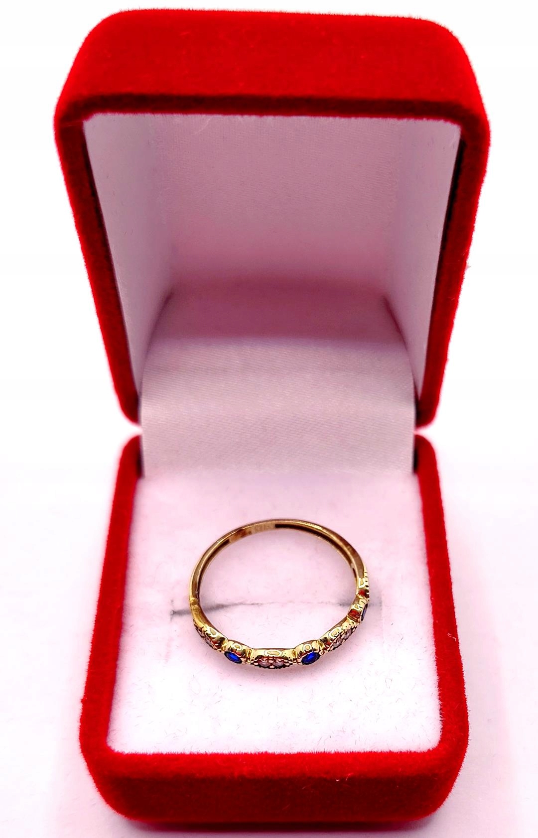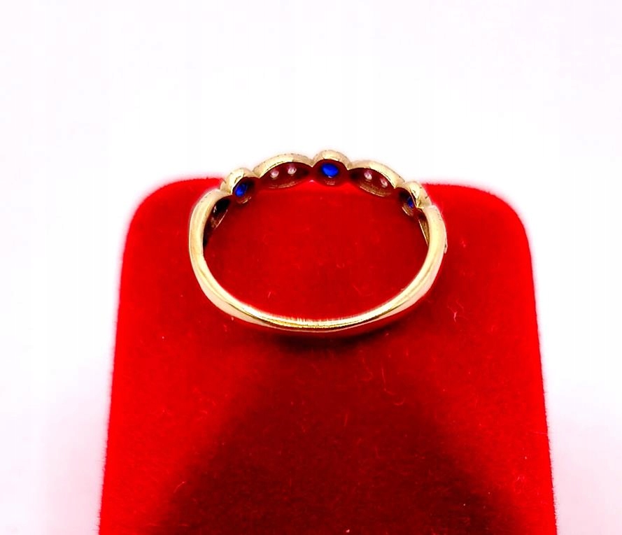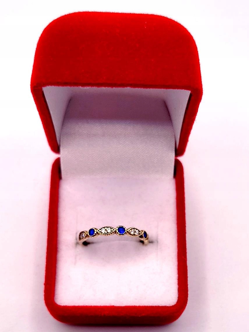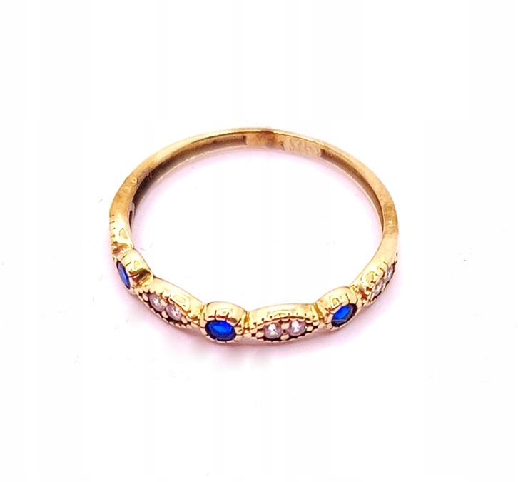 W ofercie sprzedaży posiadamy piękny, złoty pierścionek ozdobiony białymi i szafirowymi cyrkoniami.