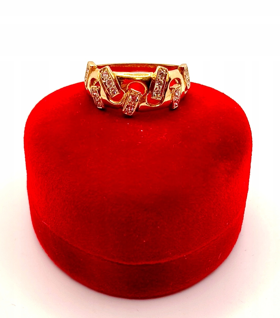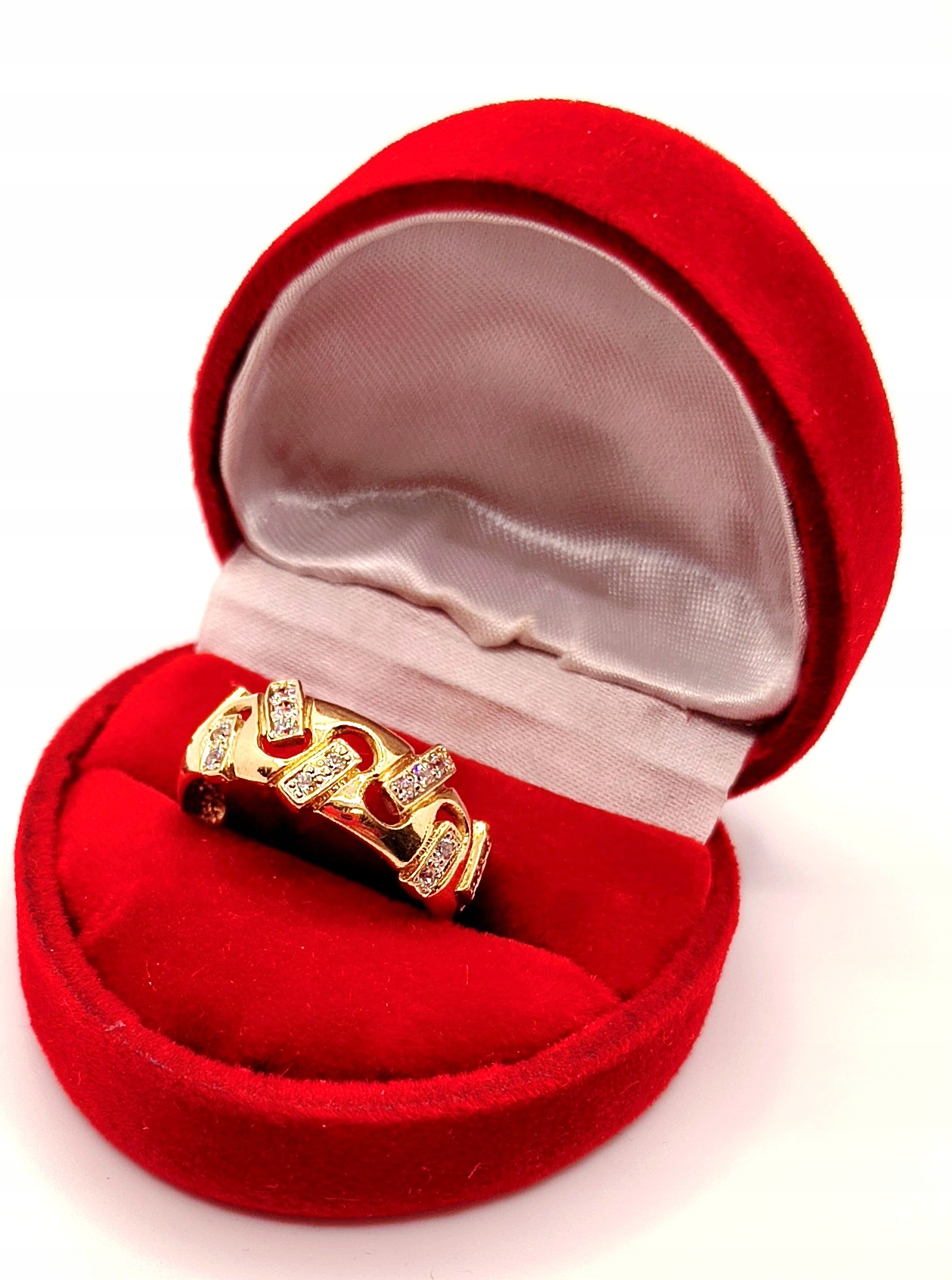 Oferujemy na sprzedaż piękny, złoty pierścionek ozdobiony cyrkoniami.