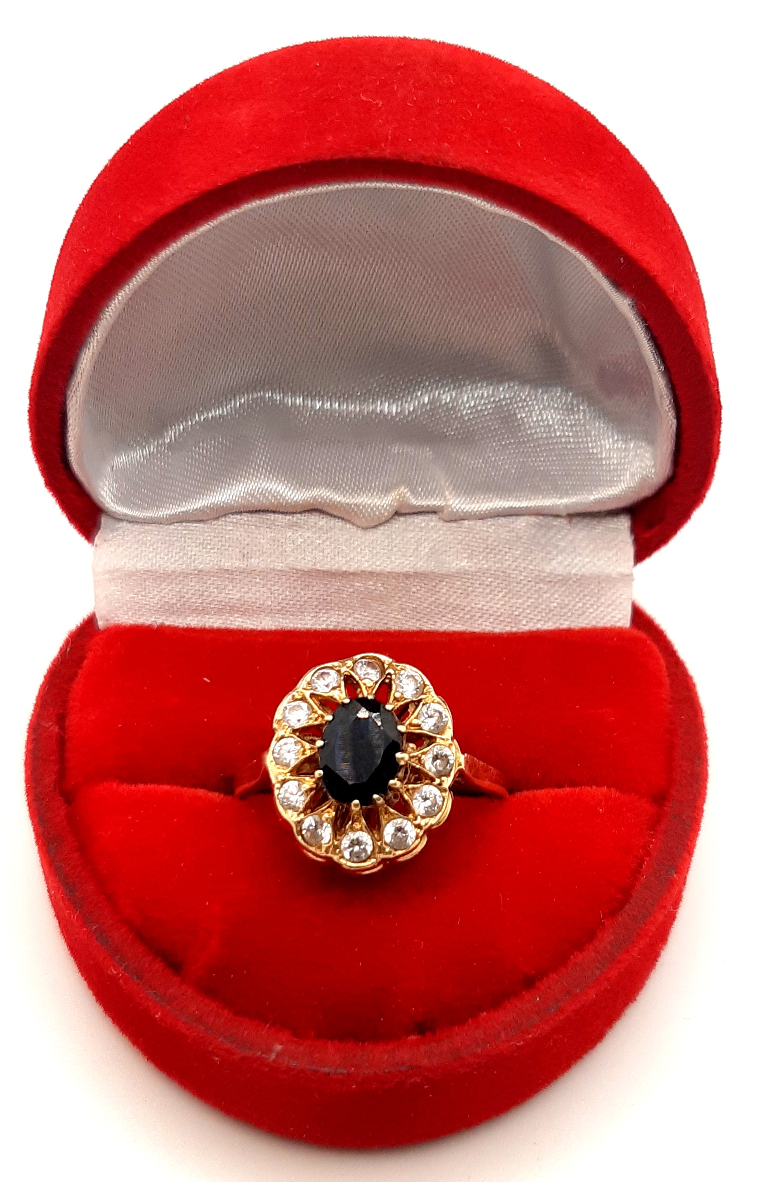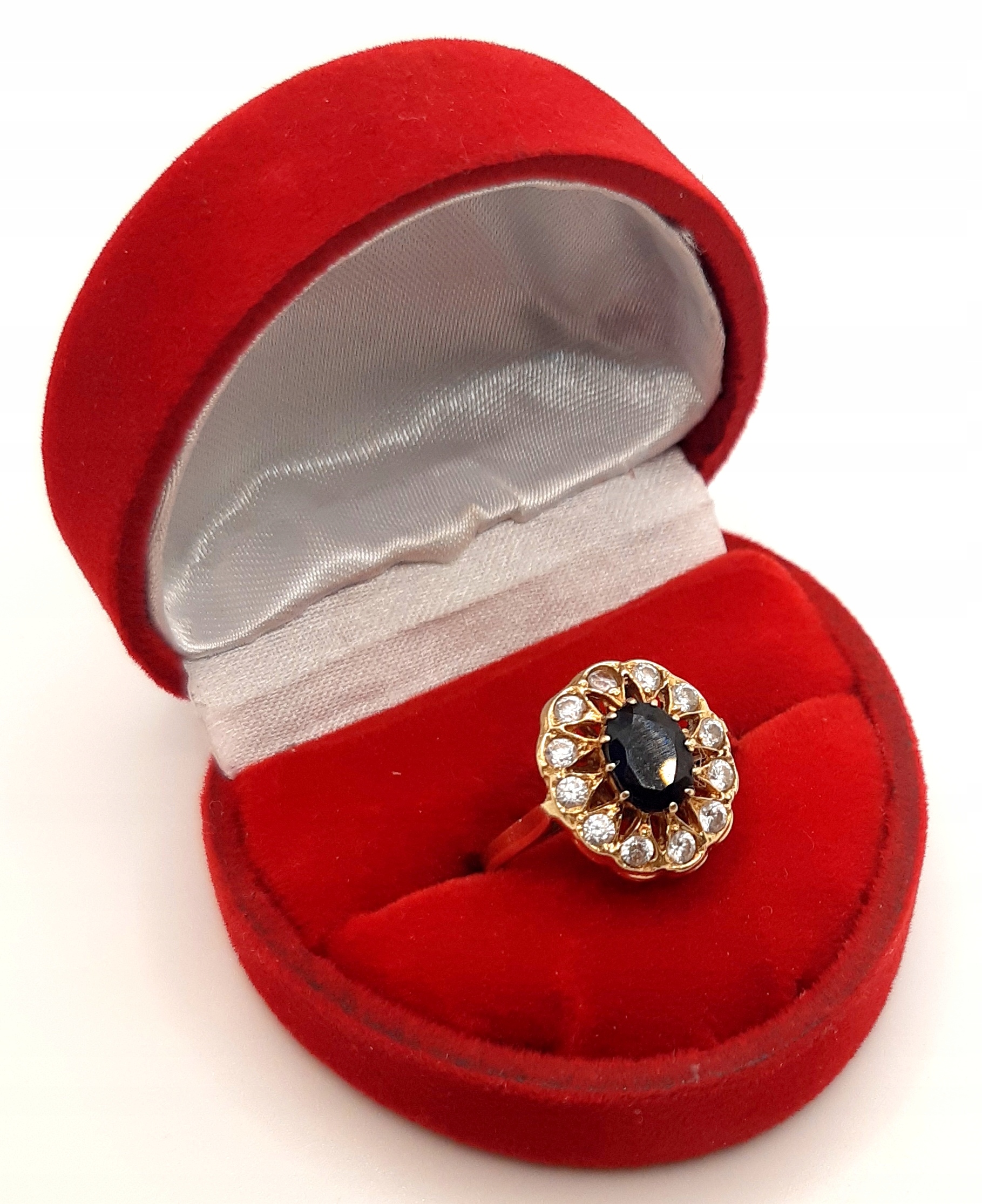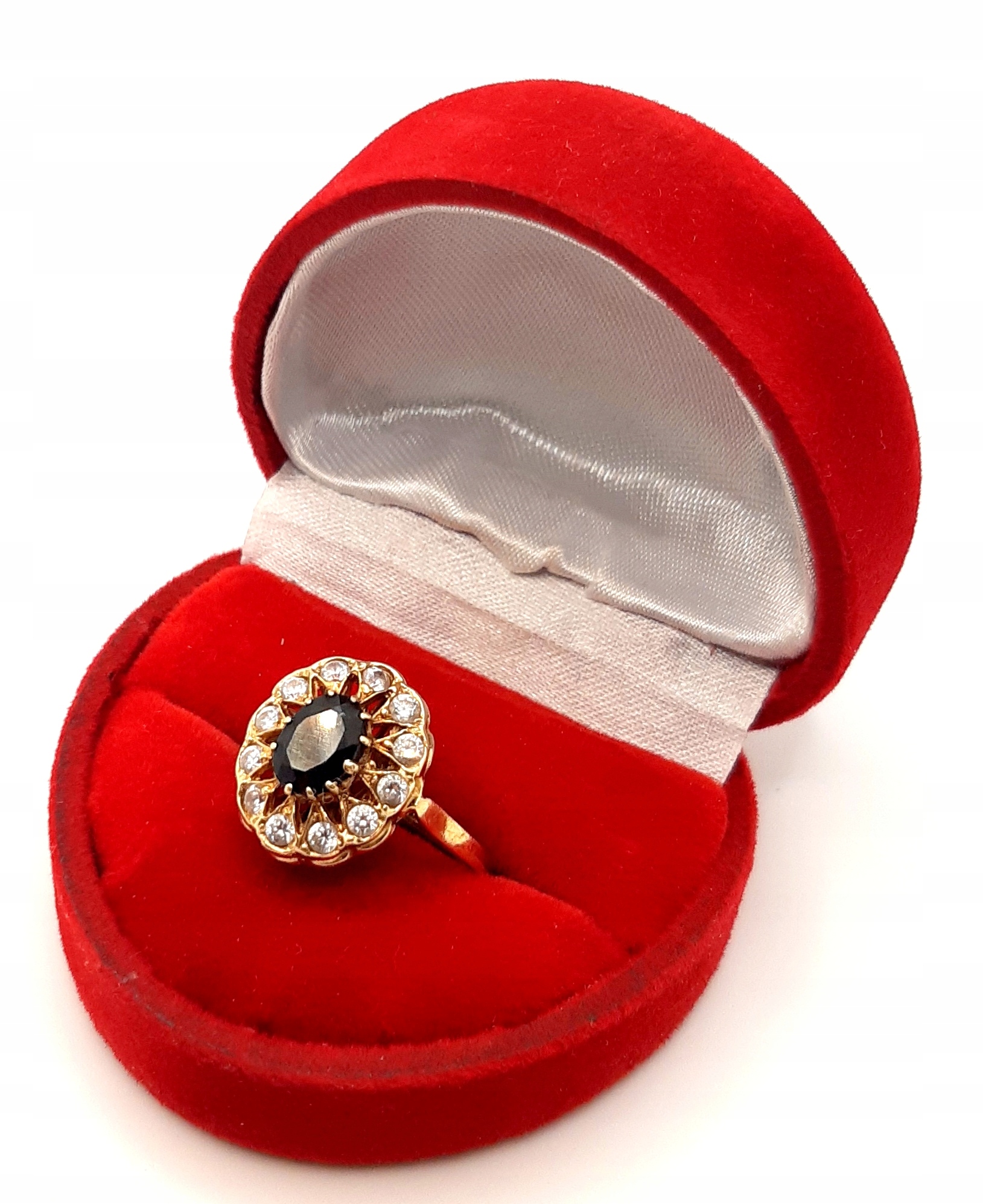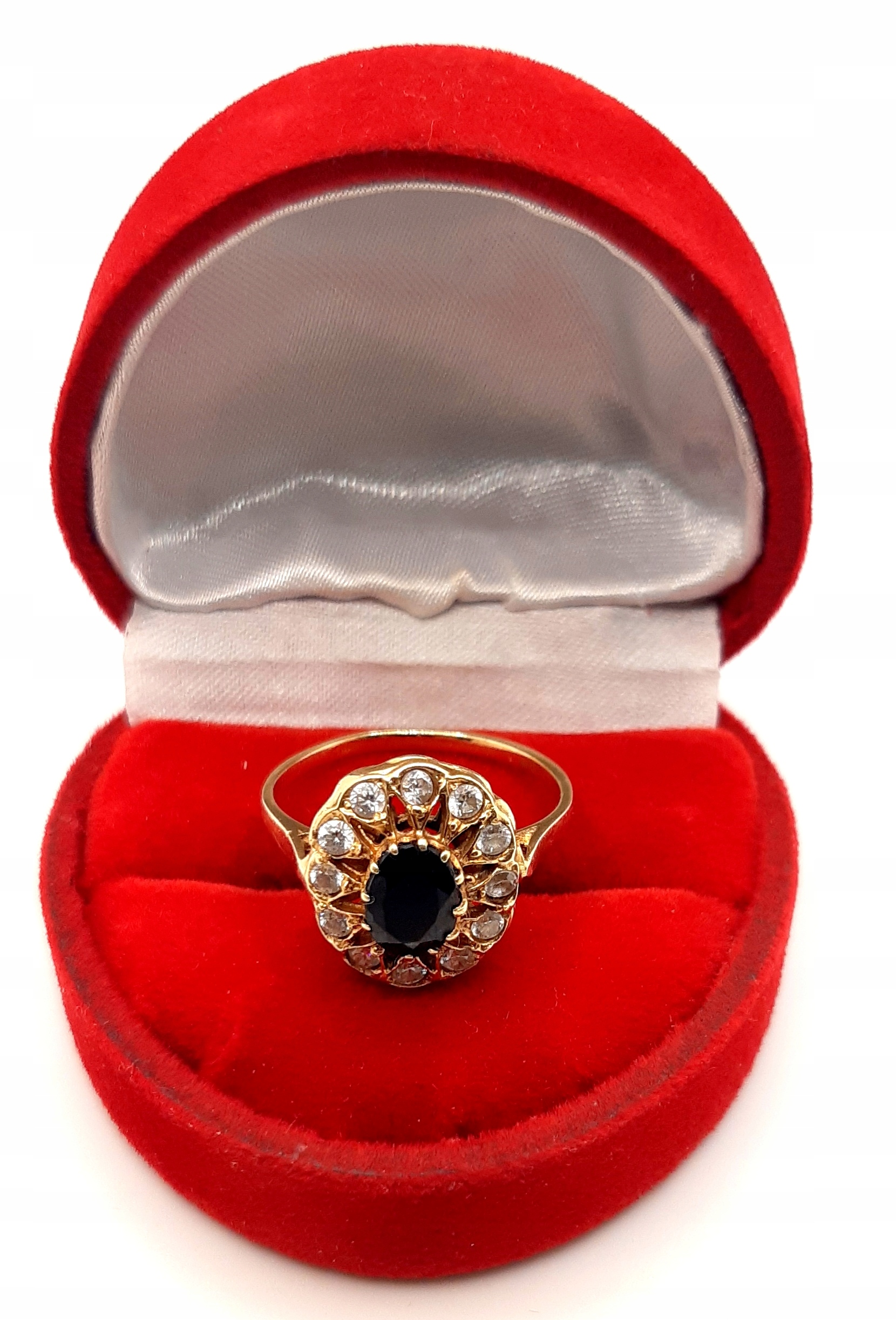 W ofercie na sprzedaż mamy dla państwa piękny, złoty pierścionek ozdobiony czarną i białymi cyrkoniami.