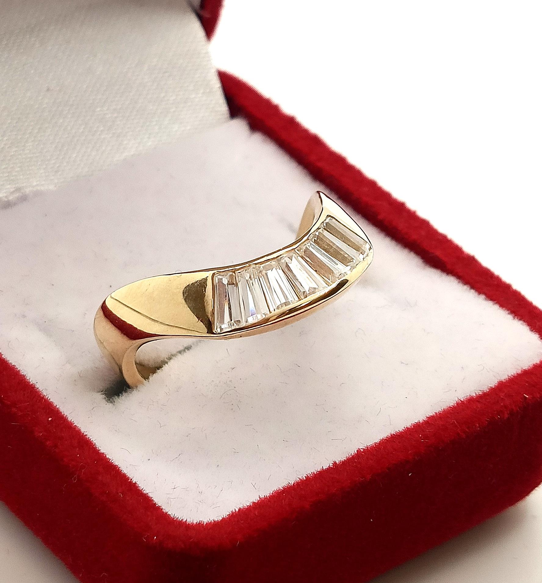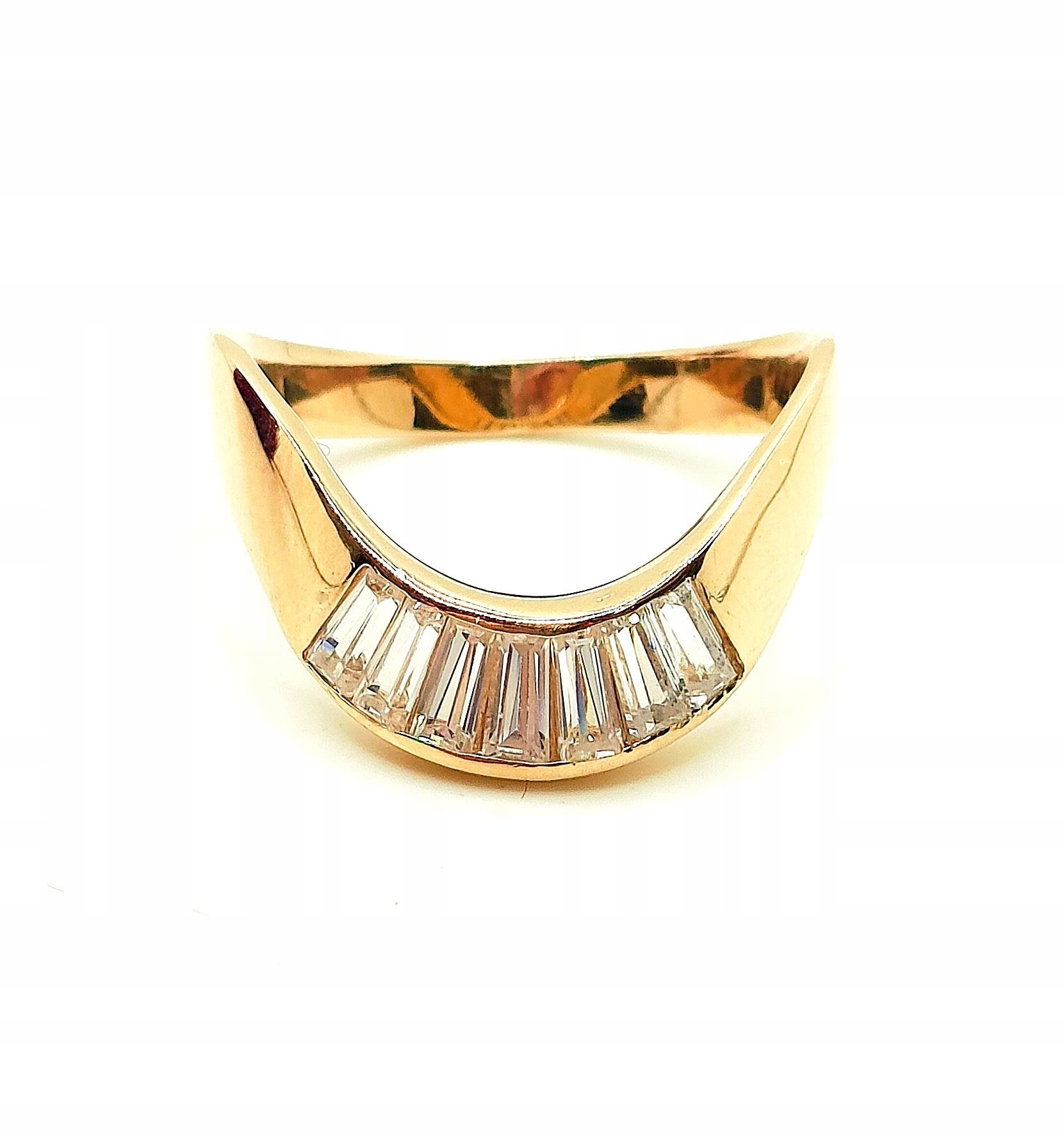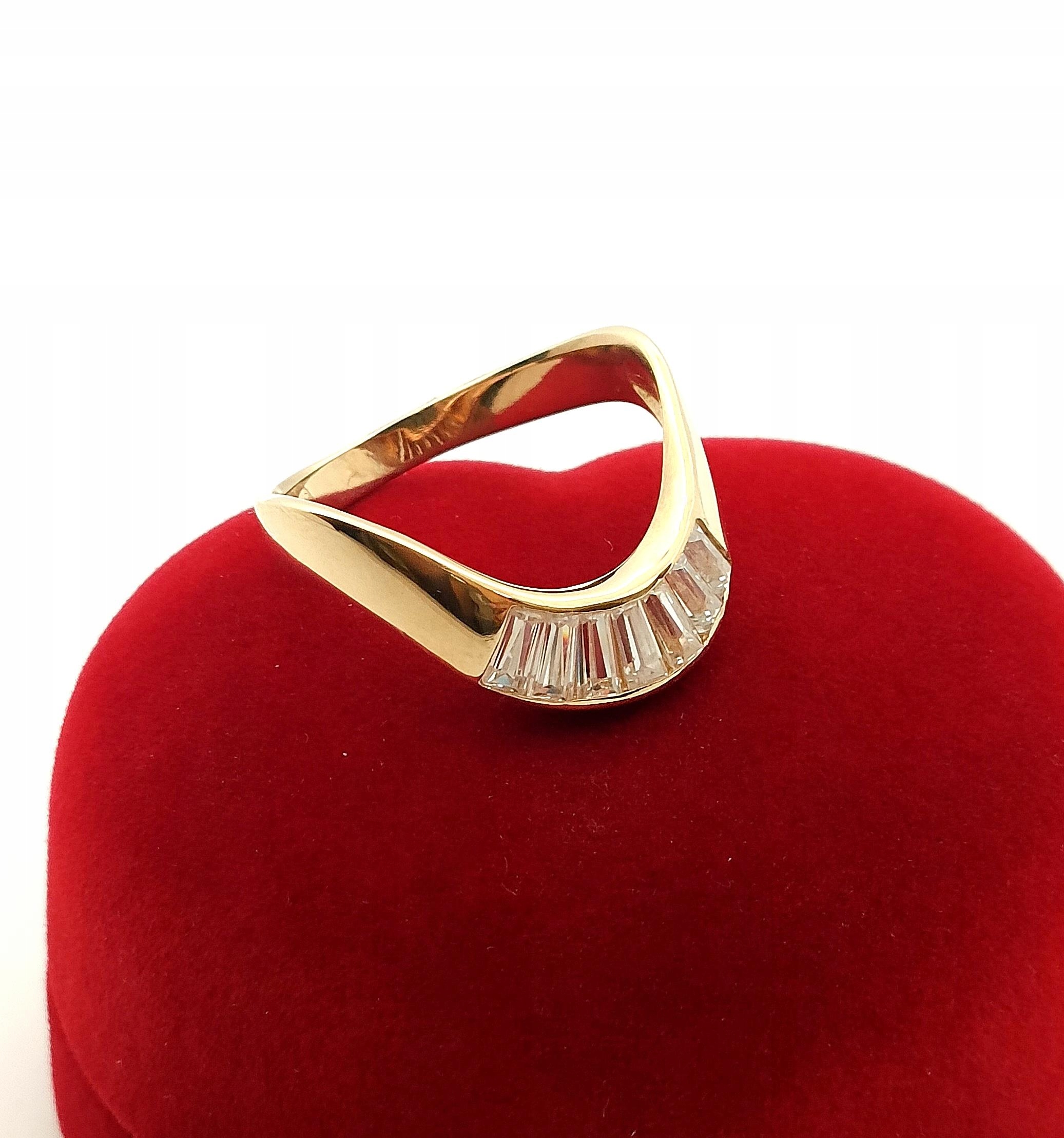 W ofercie na sprzedaż mamy dla państwa złoty, asymetryczny pierścionek ozdobiony cyrkoniami.