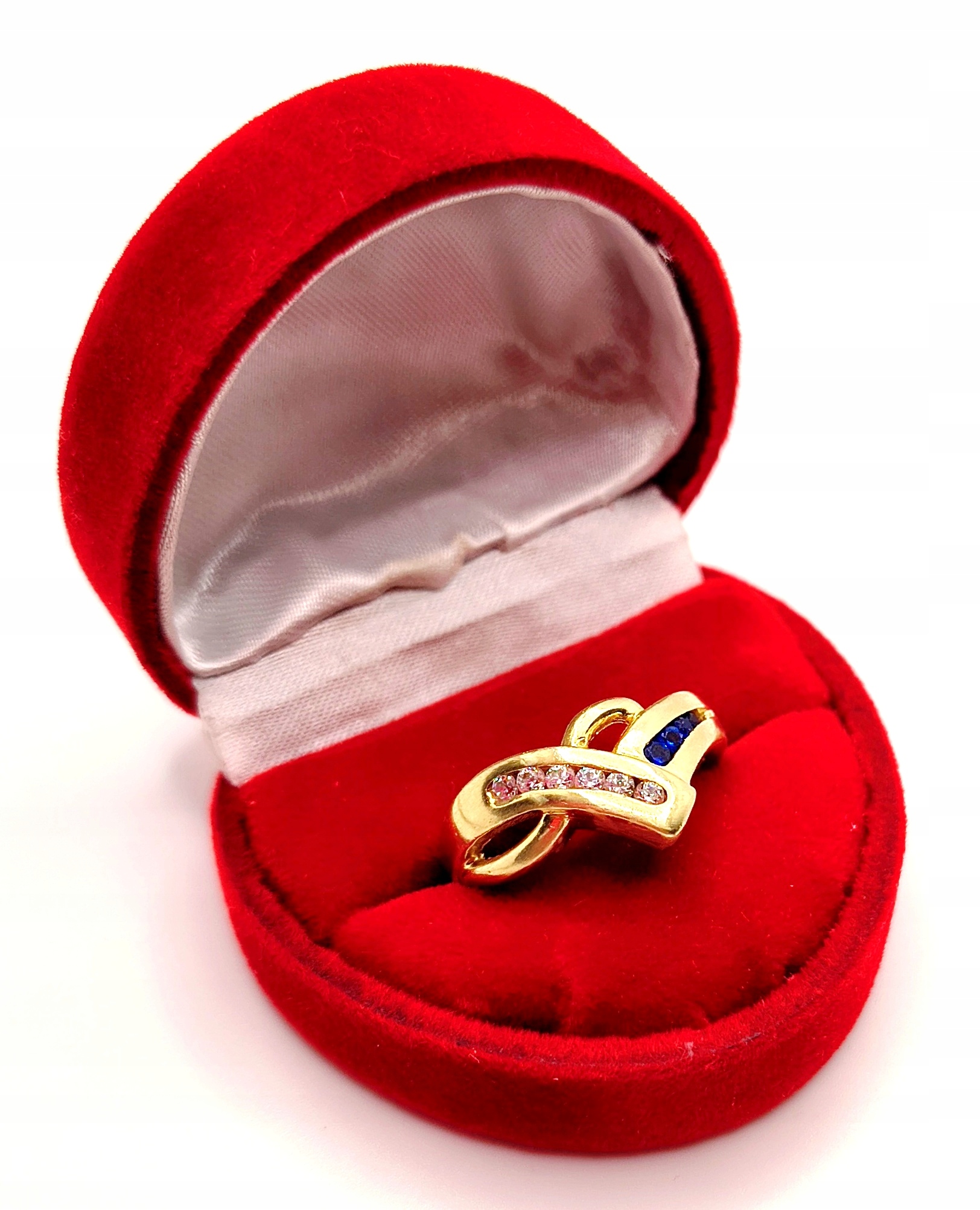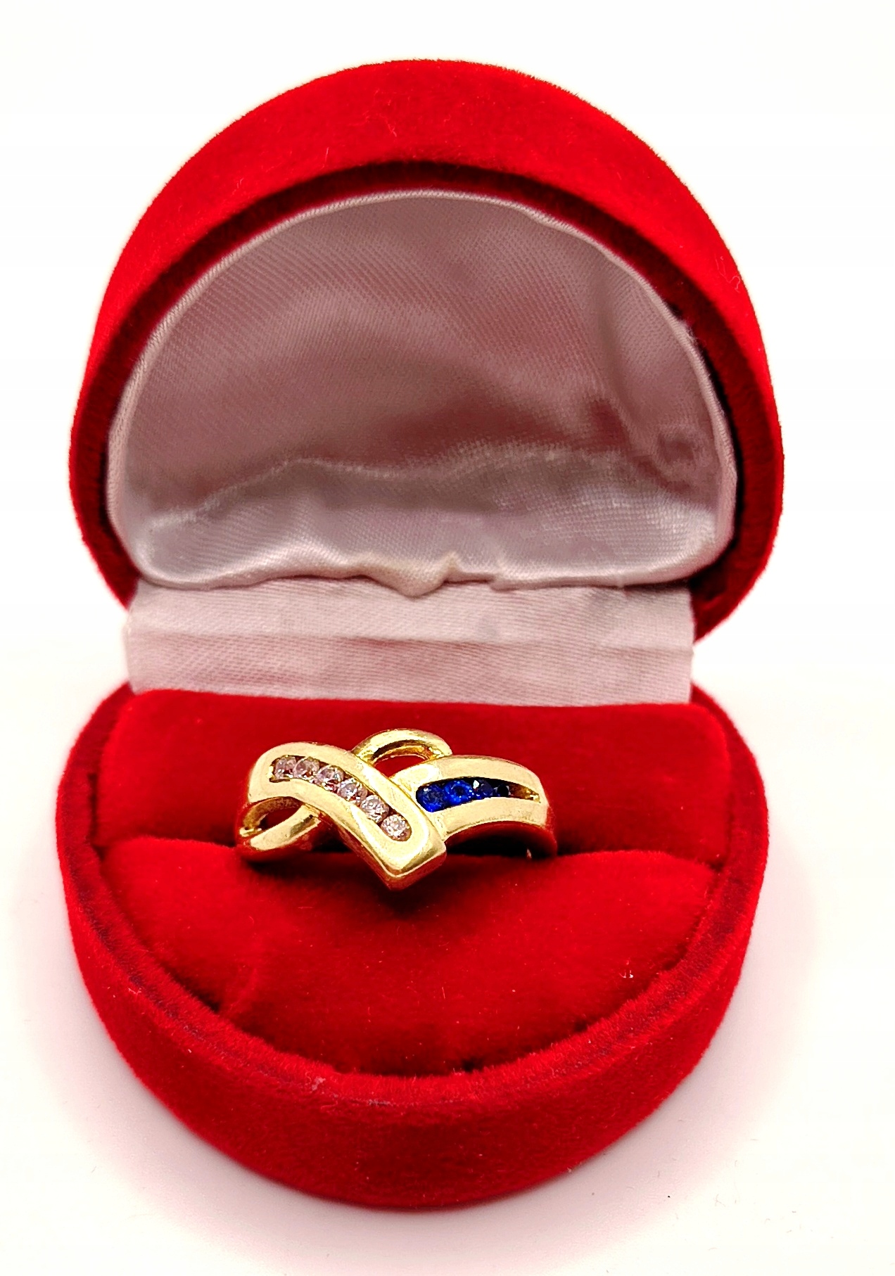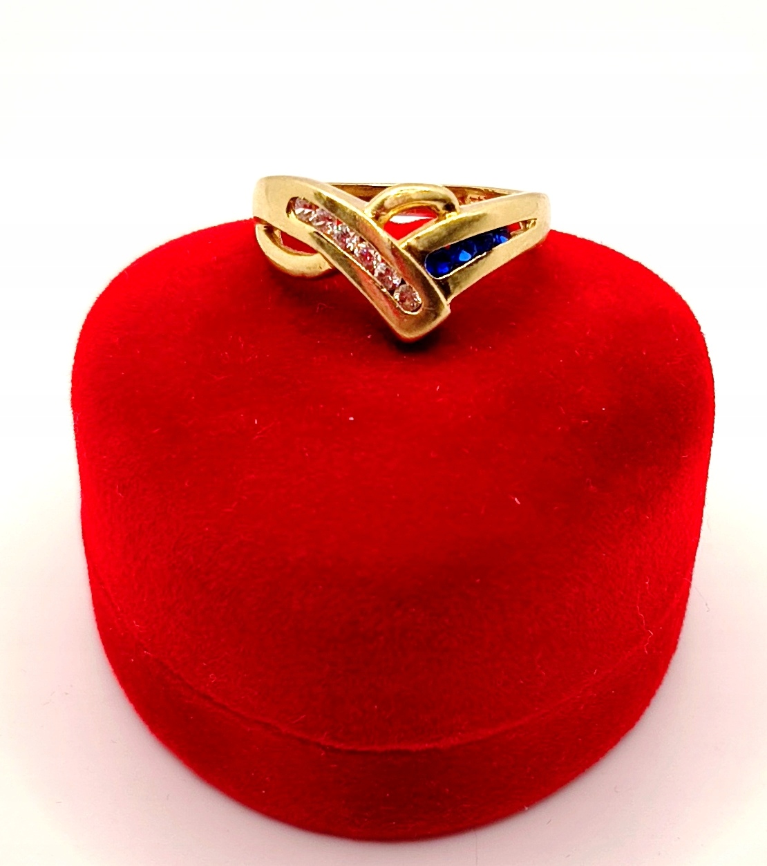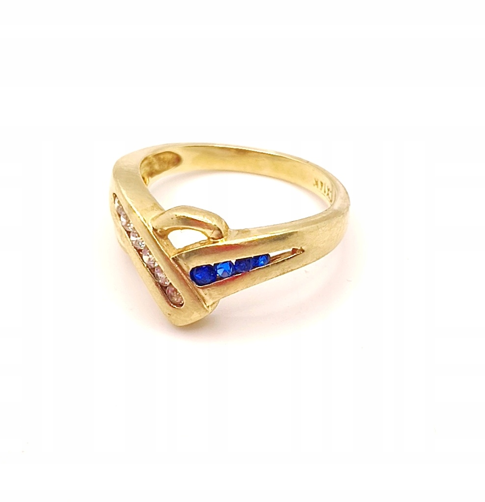 W ofercie na sprzedaż mamy dla Państwa piękny, złoty pierścionek ozdobiony białymi i szafirowymi cyrkoniami.