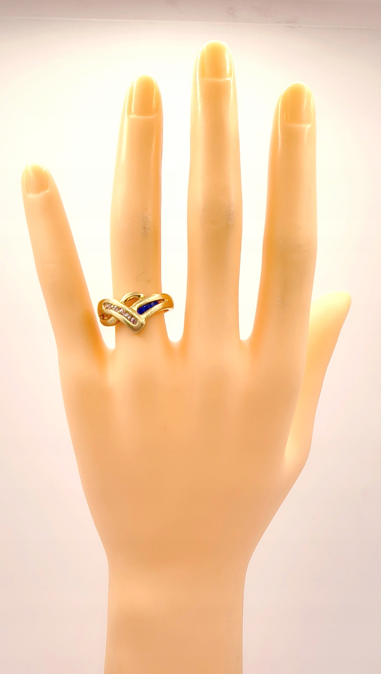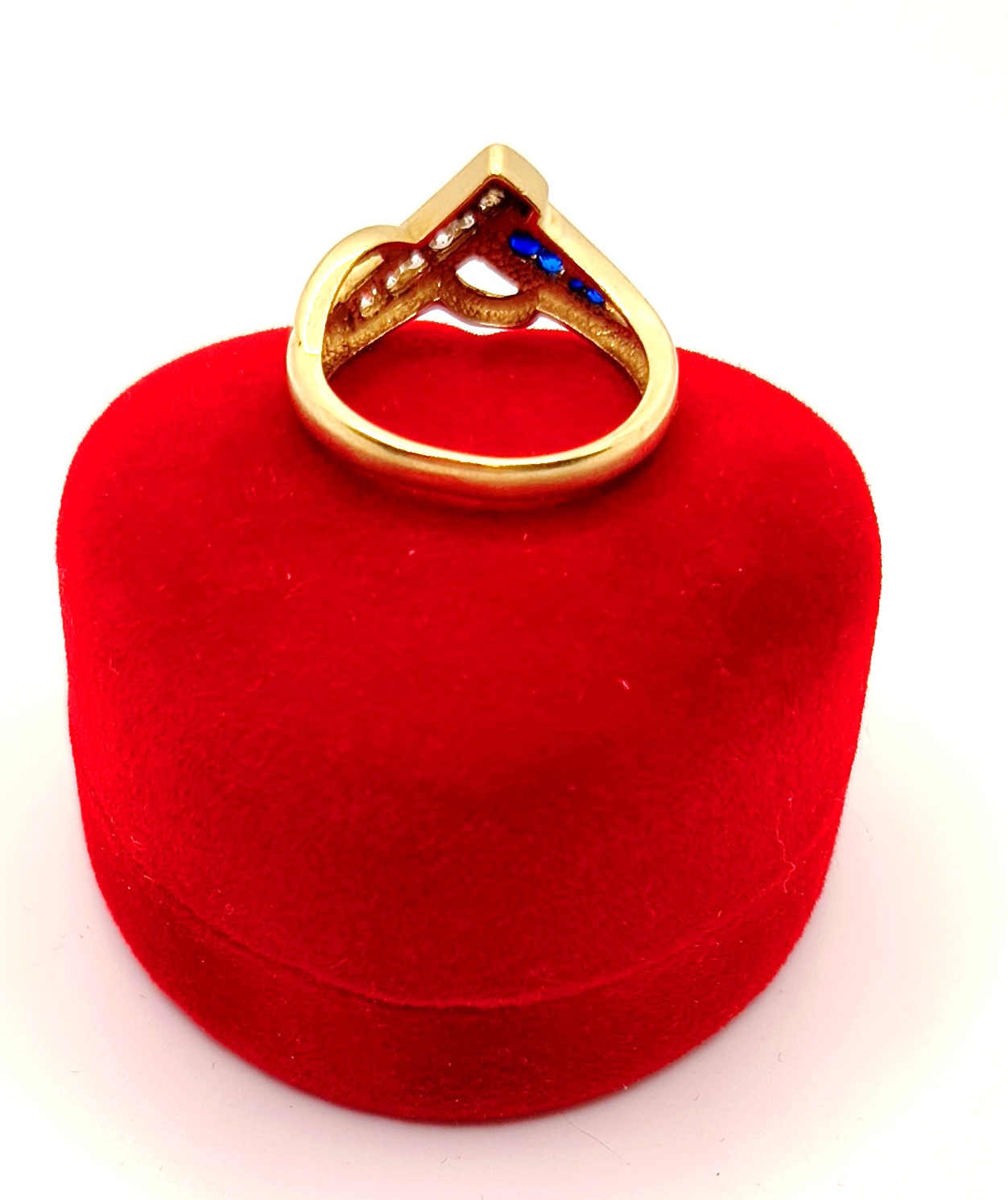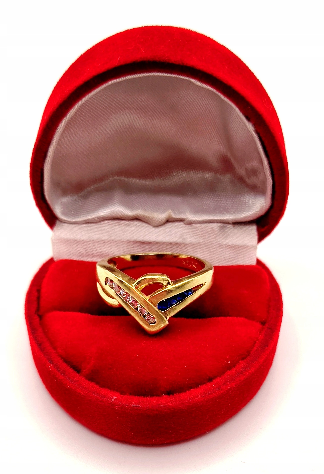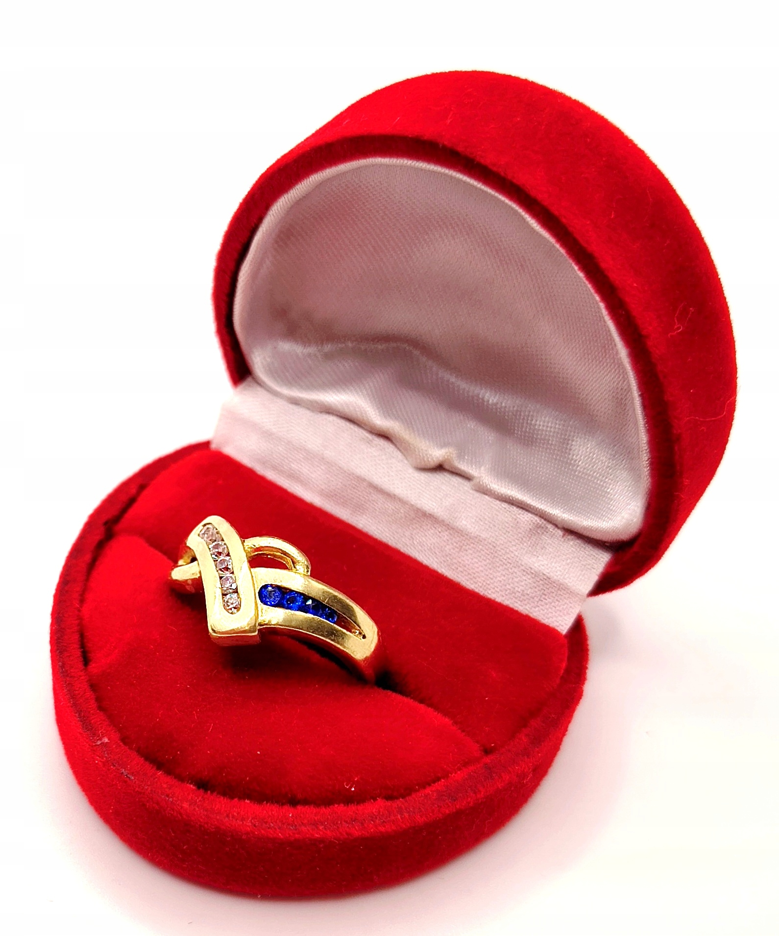 W ofercie na sprzedaż mamy dla Państwa piękny, złoty pierścionek ozdobiony białymi i szafirowymi cyrkoniami.