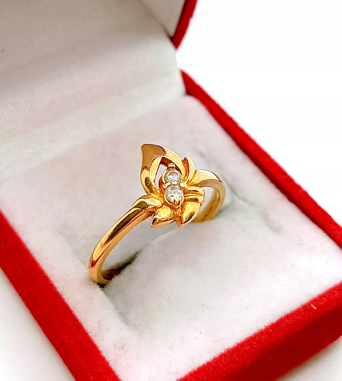 W ofercie na sprzedaż mamy dla państwa złoty pierścionek przedstawiający geometryczny kwiatek zdobiony cyrkoniami. Cyrkonie osadzone w złocie, nie klejone.