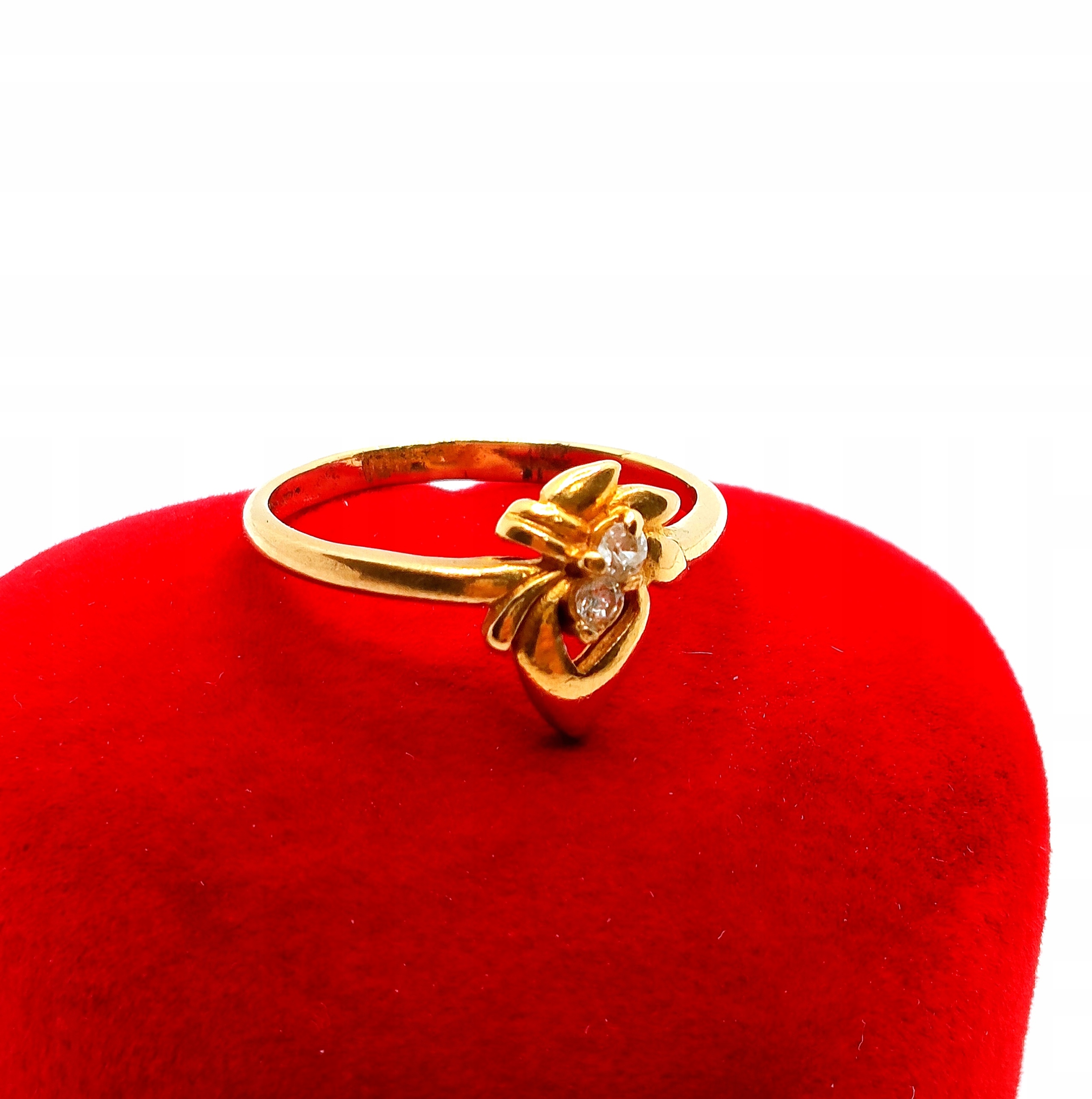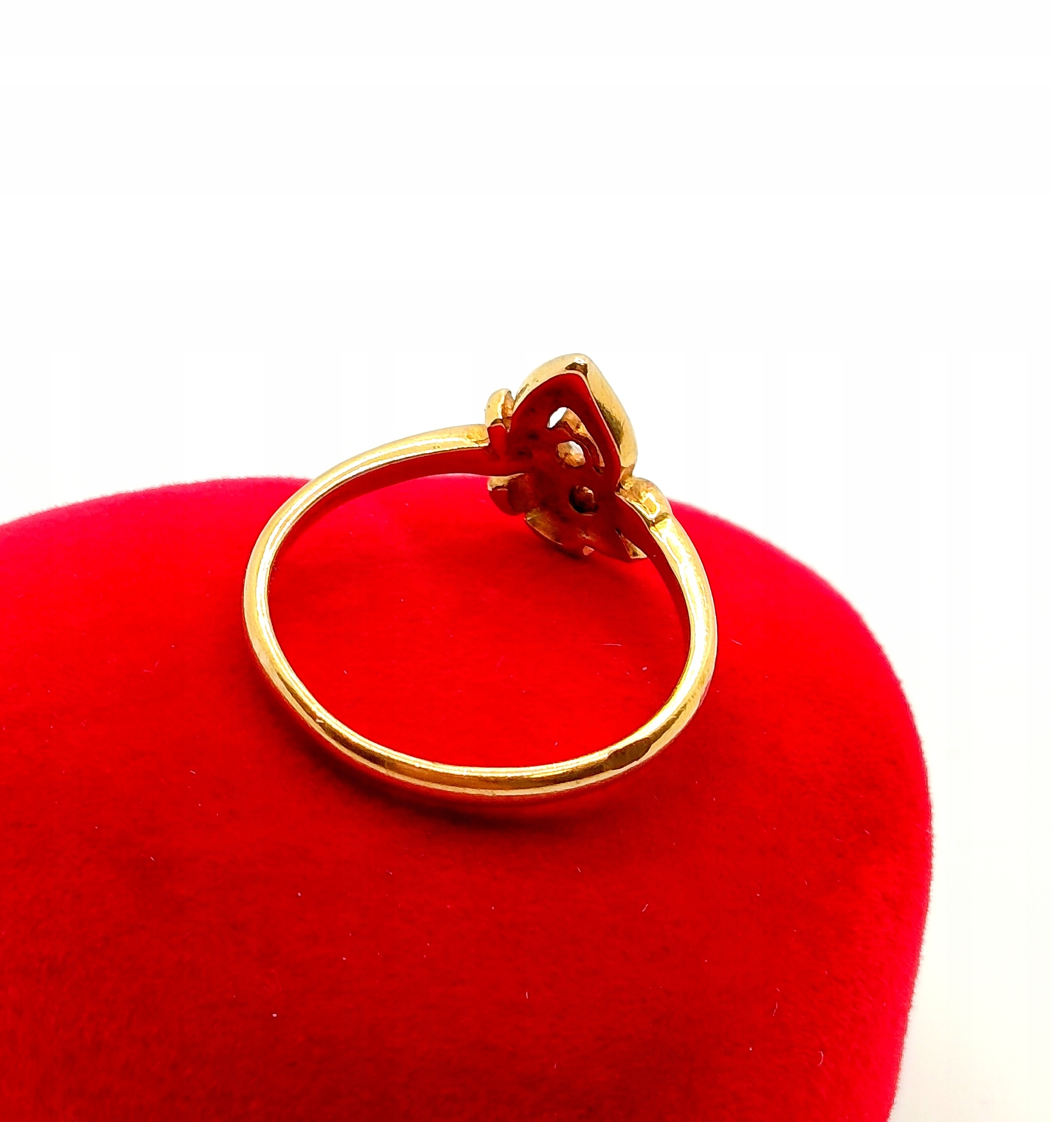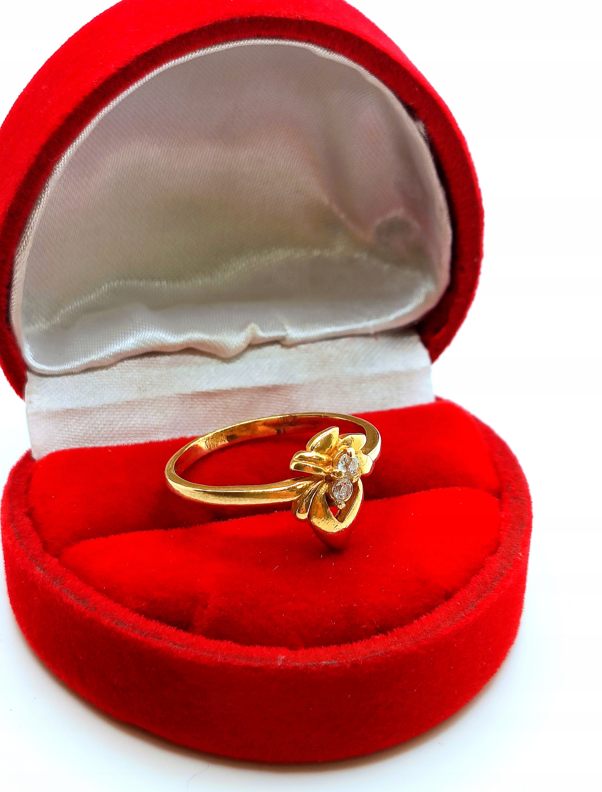 W ofercie na sprzedaż mamy dla państwa złoty pierścionek przedstawiający geometryczny kwiatek zdobiony cyrkoniami. Cyrkonie osadzone w złocie, nie klejone.
