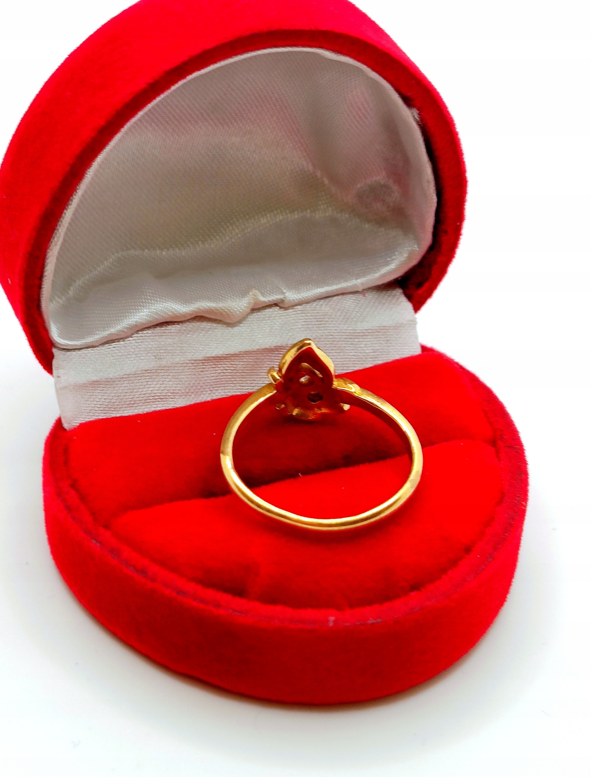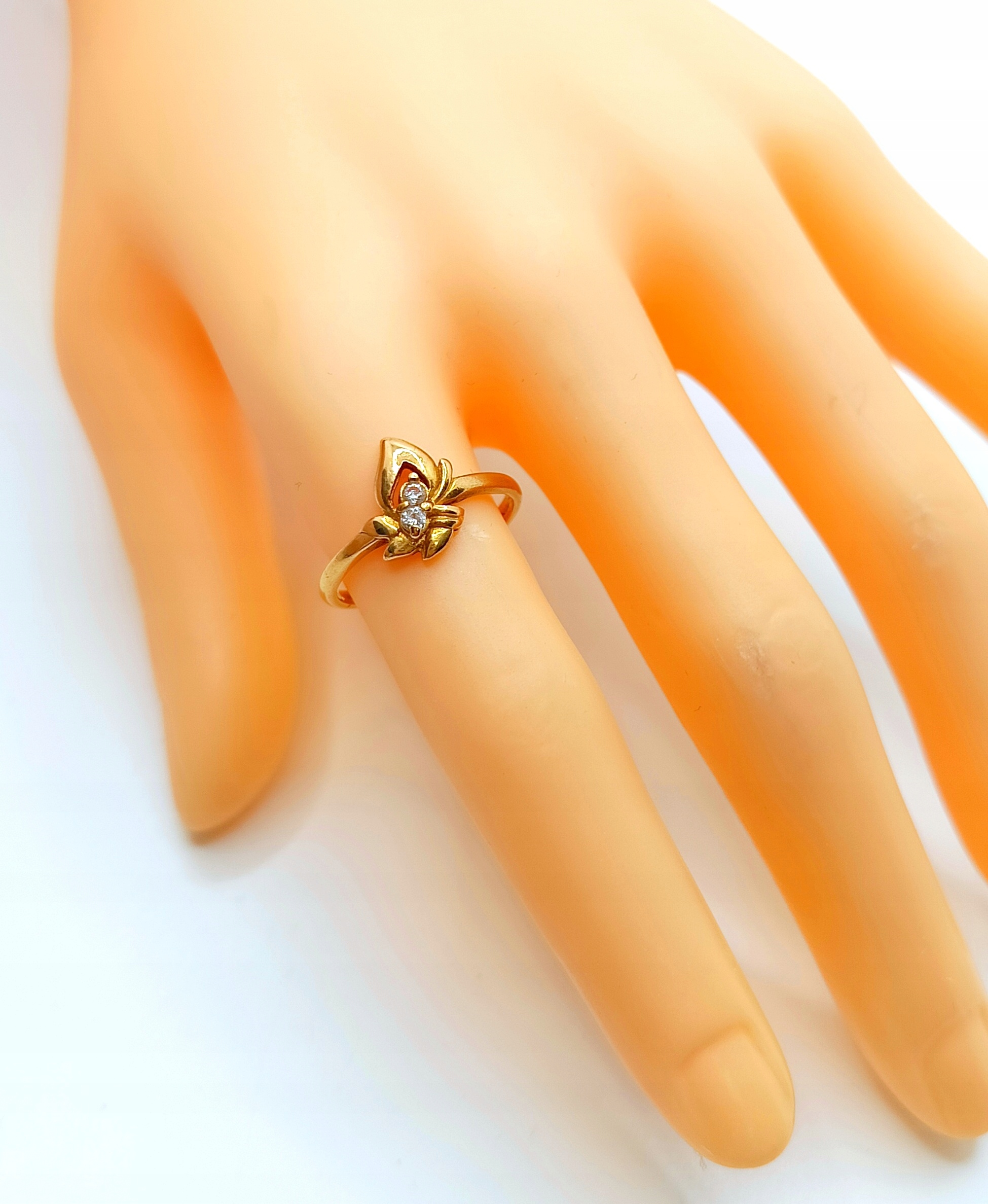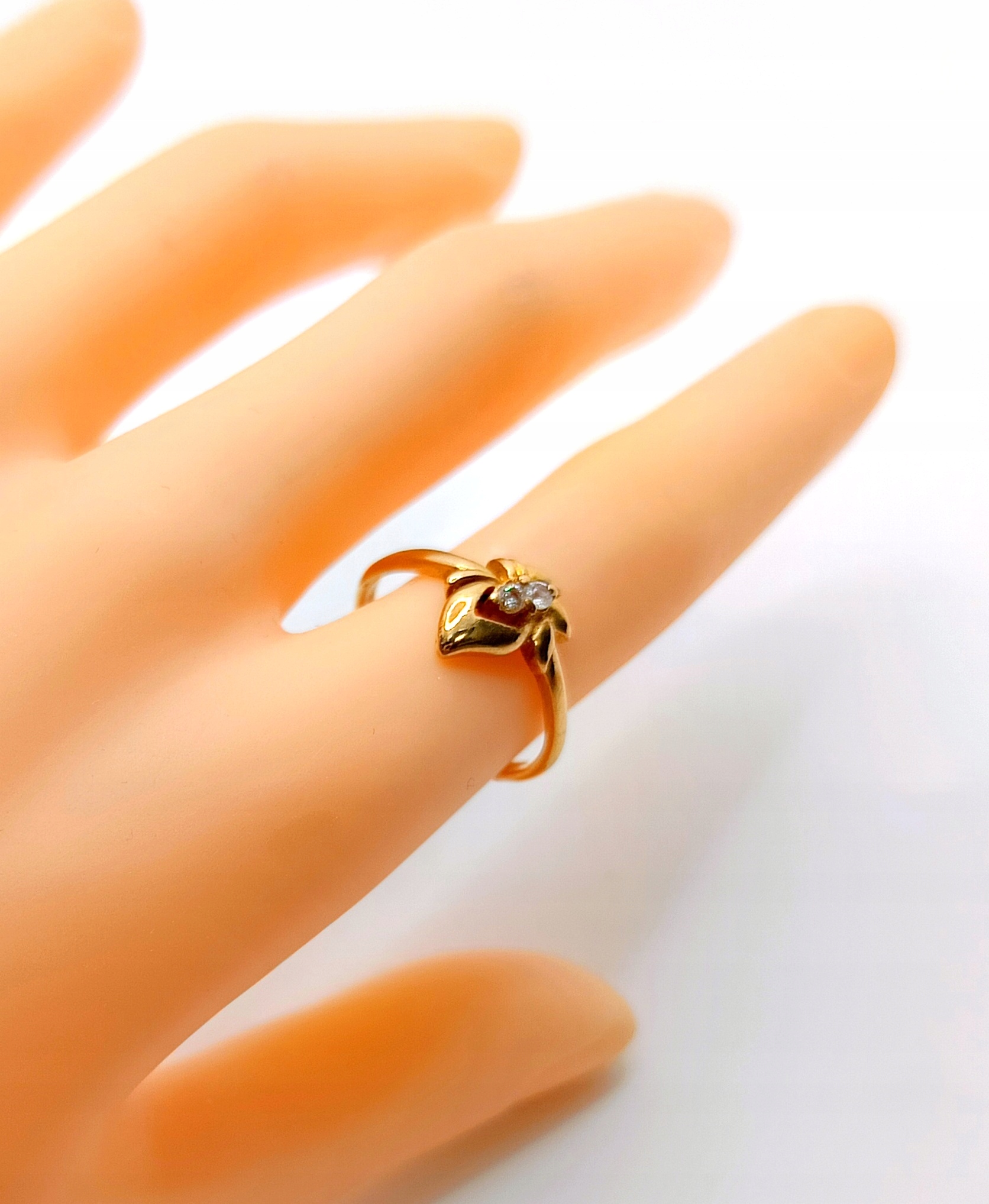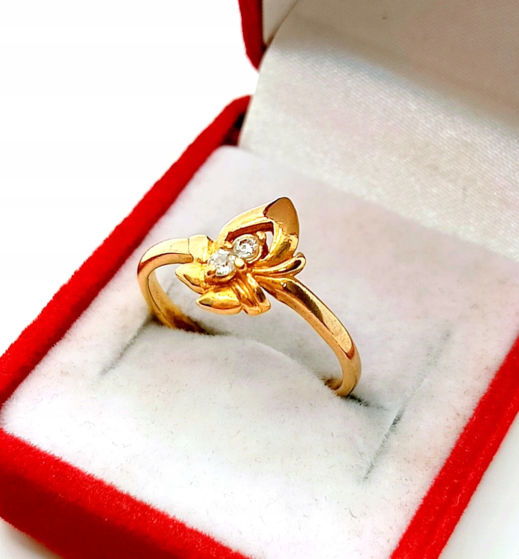 W ofercie na sprzedaż mamy dla państwa złoty pierścionek przedstawiający geometryczny kwiatek zdobiony cyrkoniami. Cyrkonie osadzone w złocie, nie klejone.