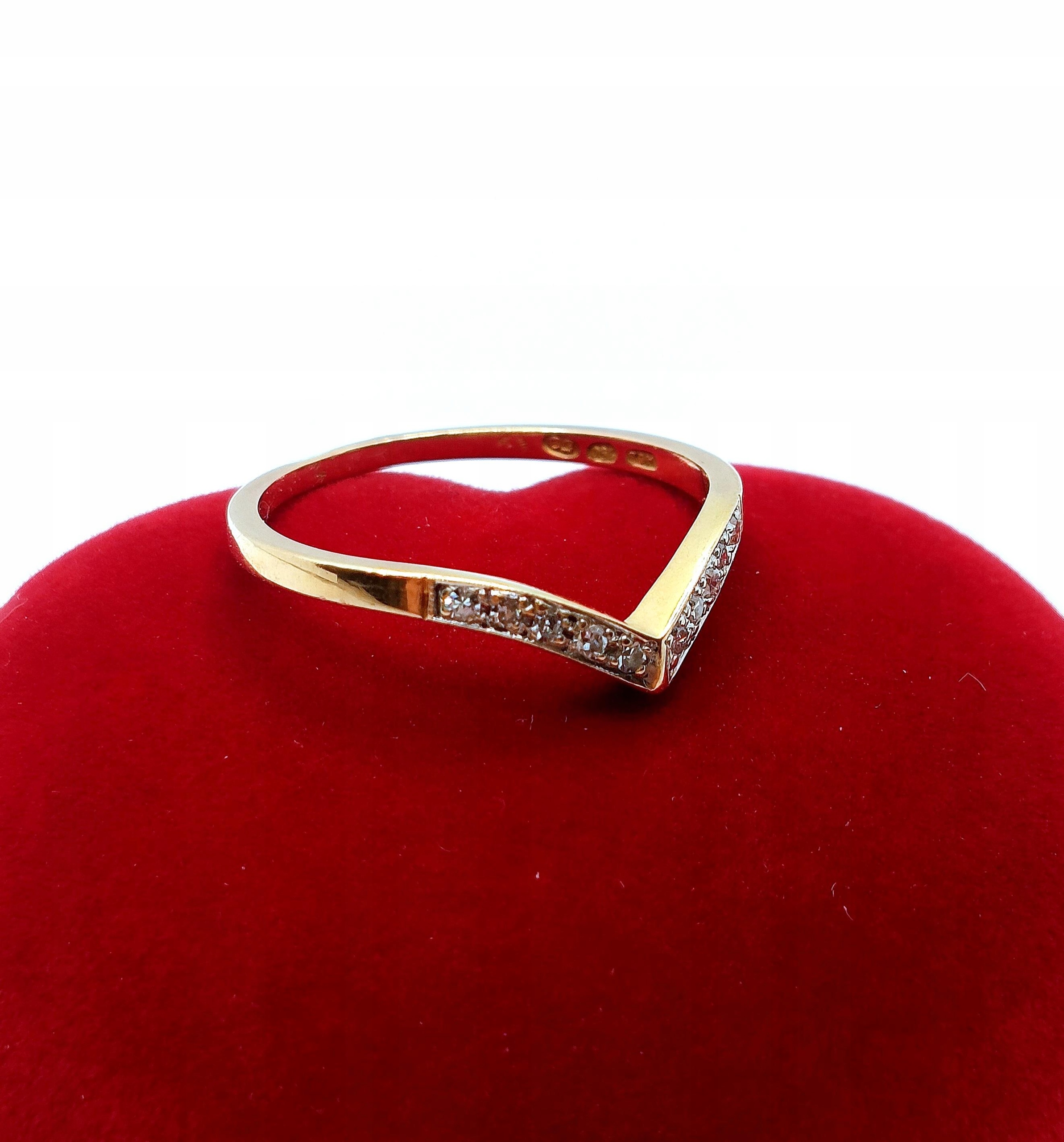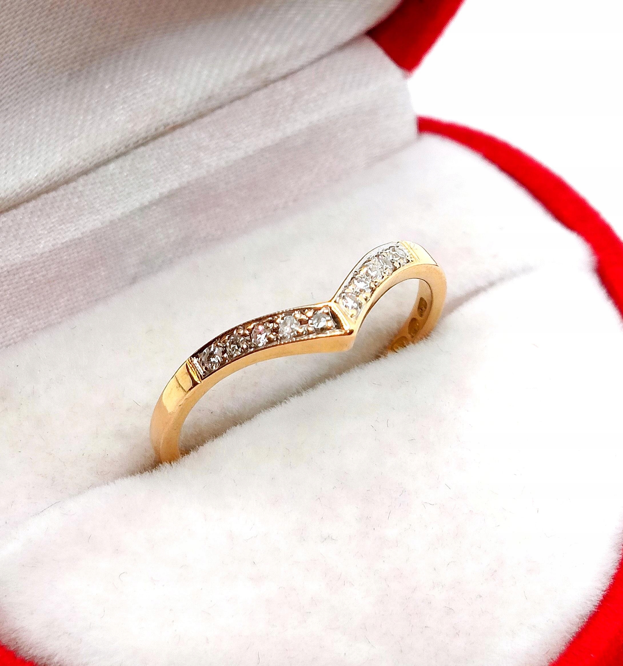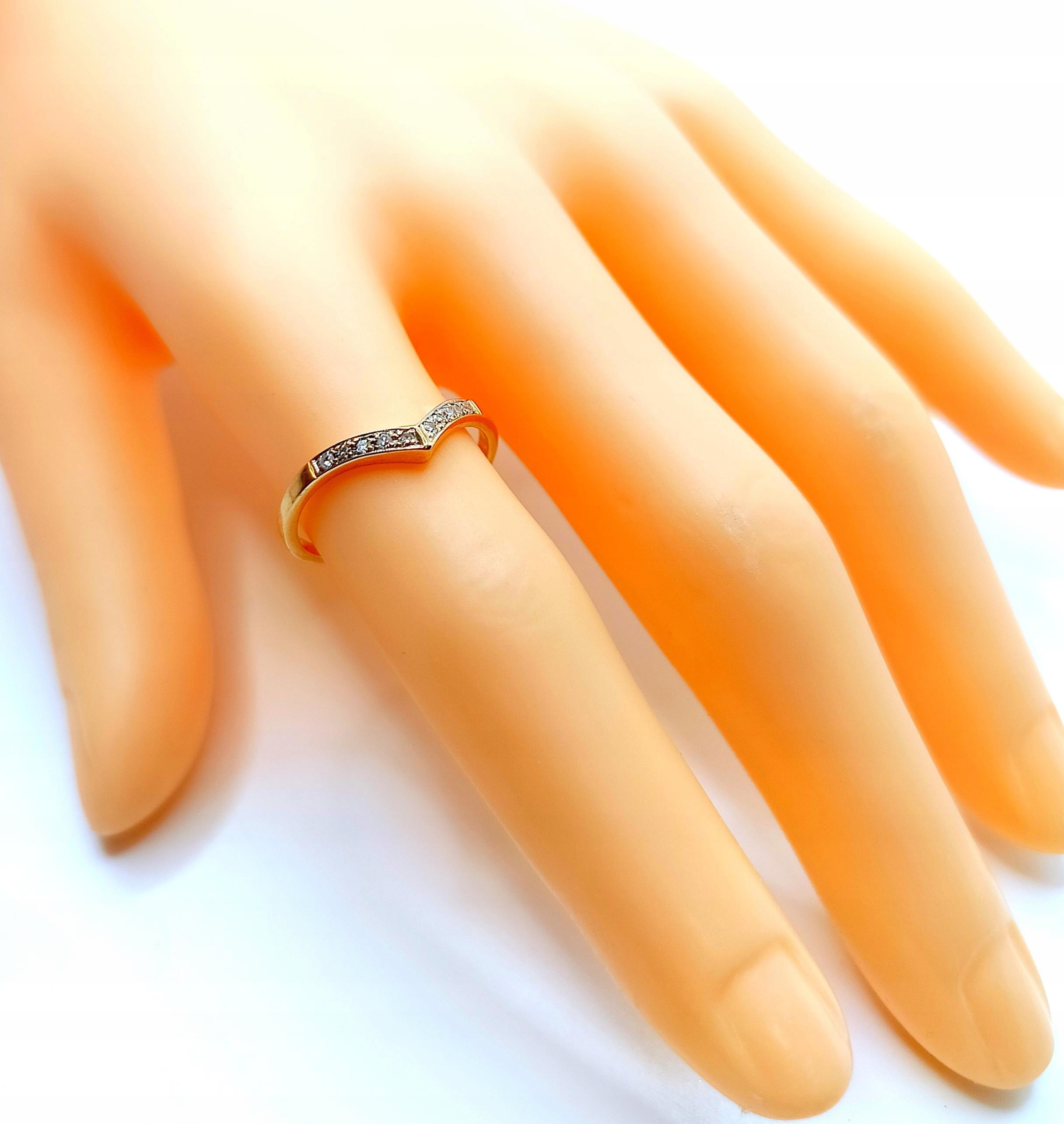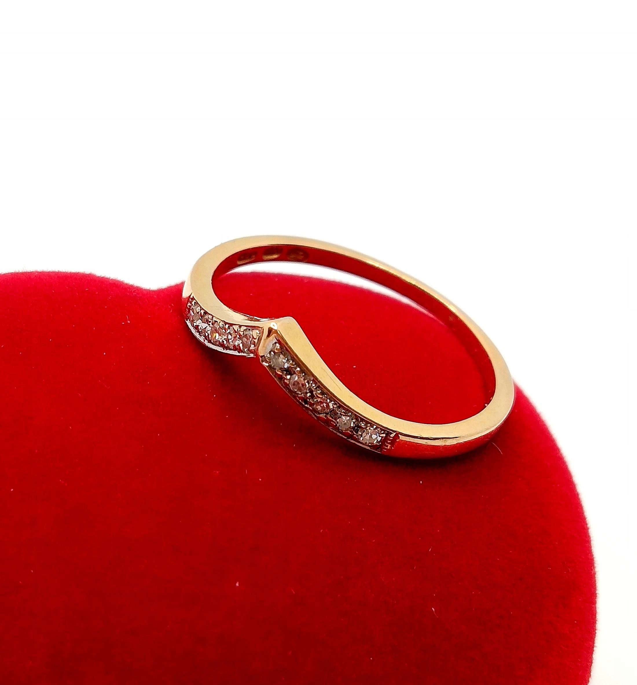 W ofercie na sprzedaż mamy dla Państwa złoty pierścionek lekko wygięty na kształt diademu , oszroniony 8mioma diamentami.