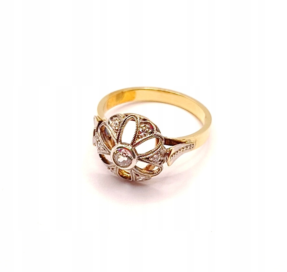 Pierścionek w całości wykonany z żółtego złota próby 585 i srebra próby 800.