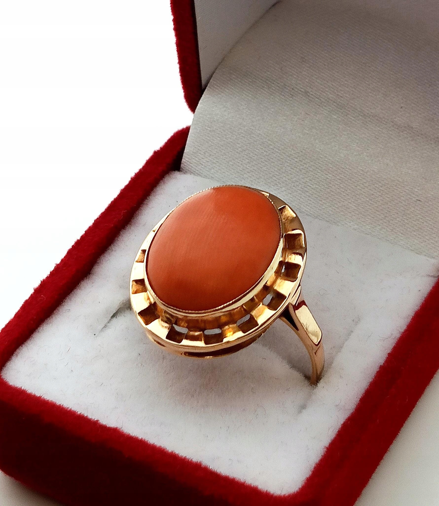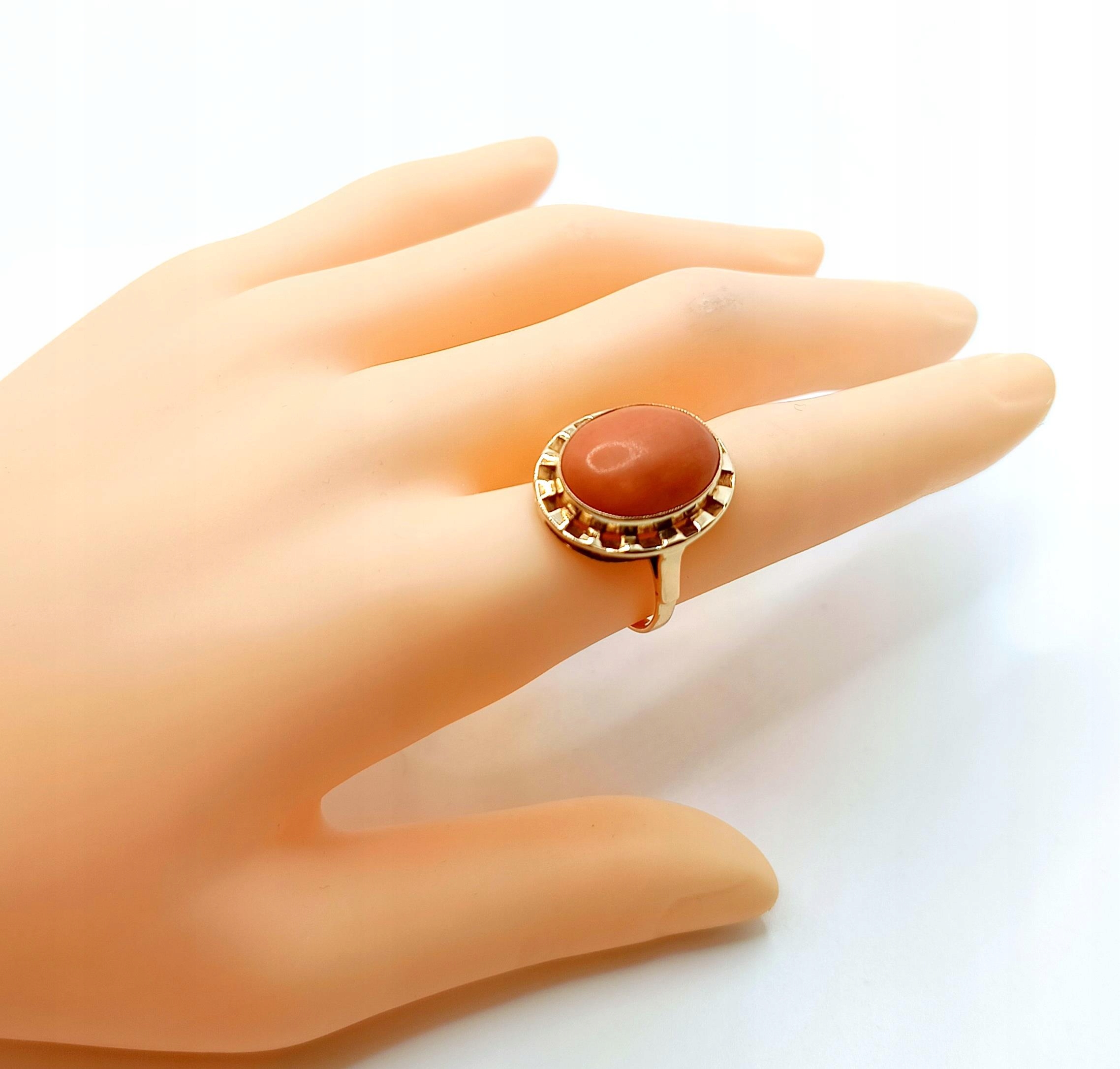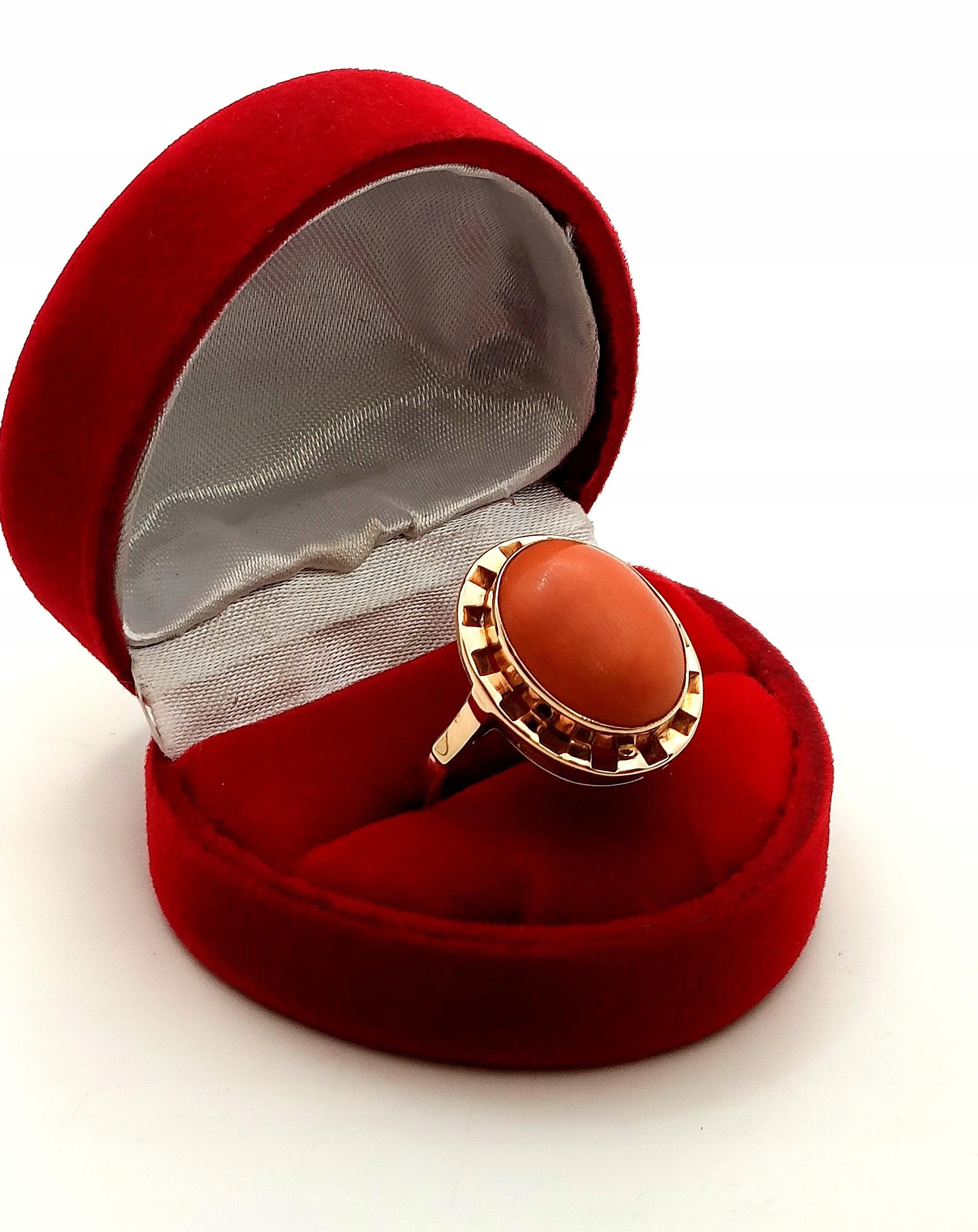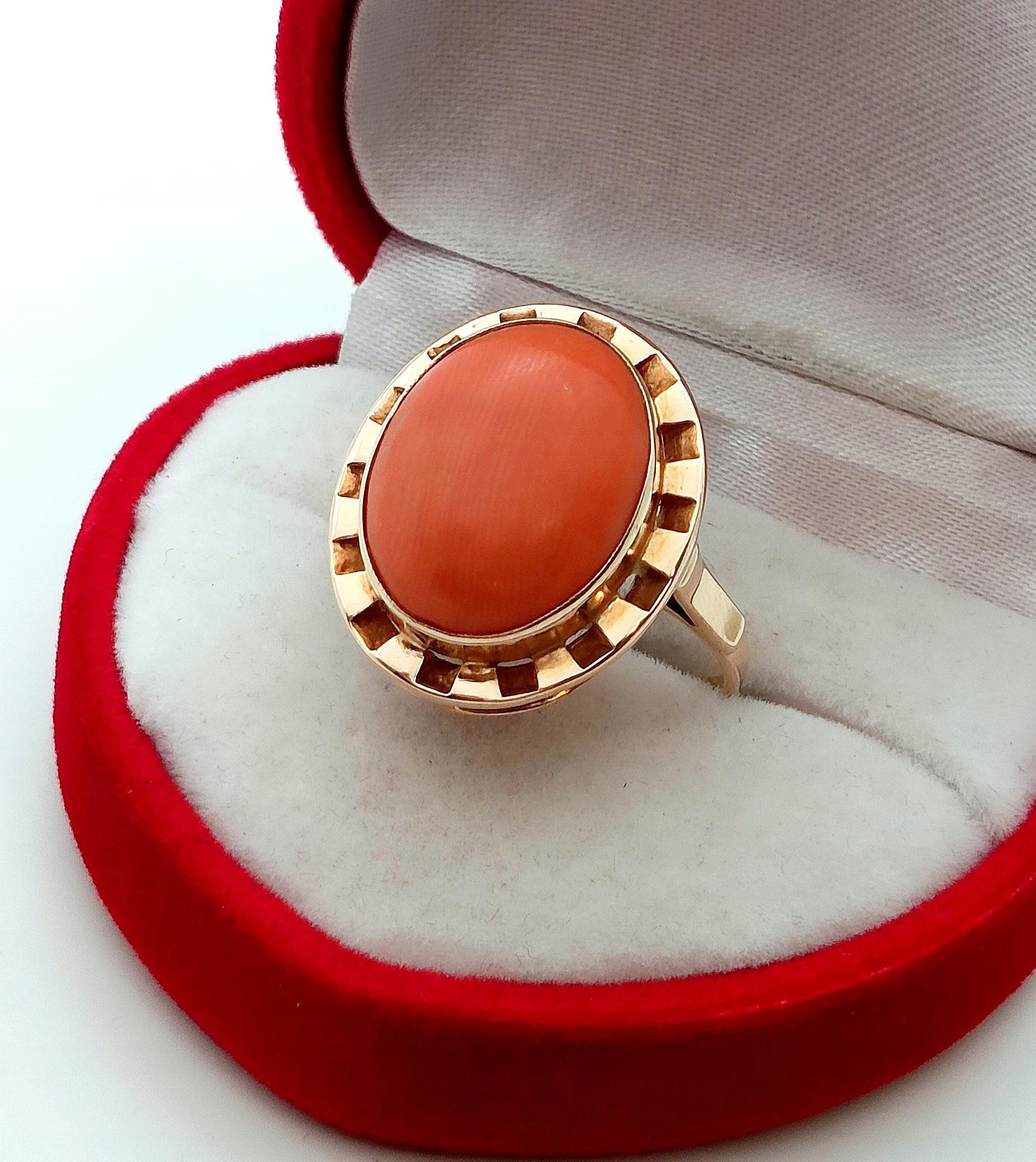 Oferujemy na sprzedaż złoty pierścionek zdobiony owalnym Koralem. Wokół Korala złoto z ząbkowanym wykończeniem.