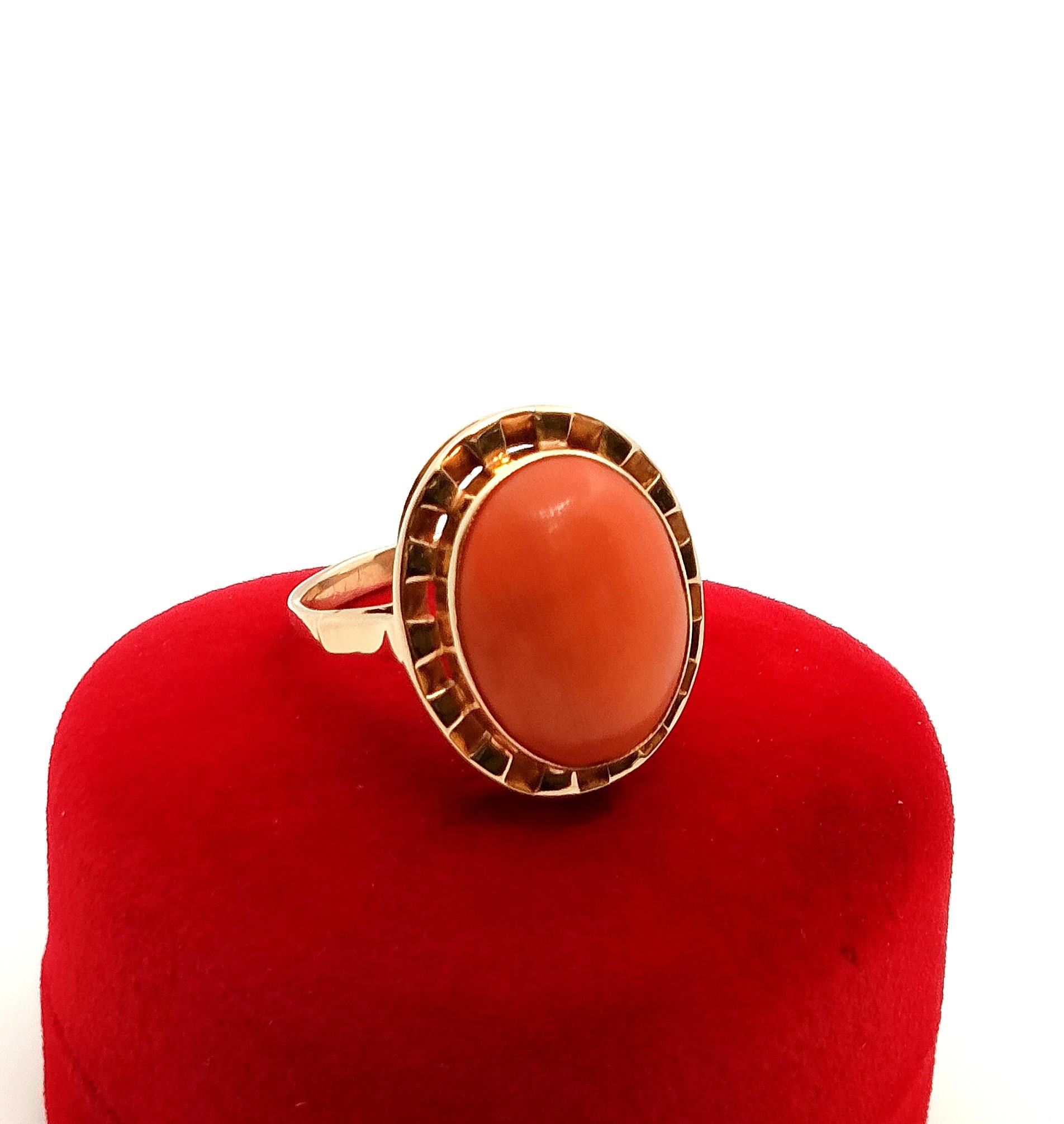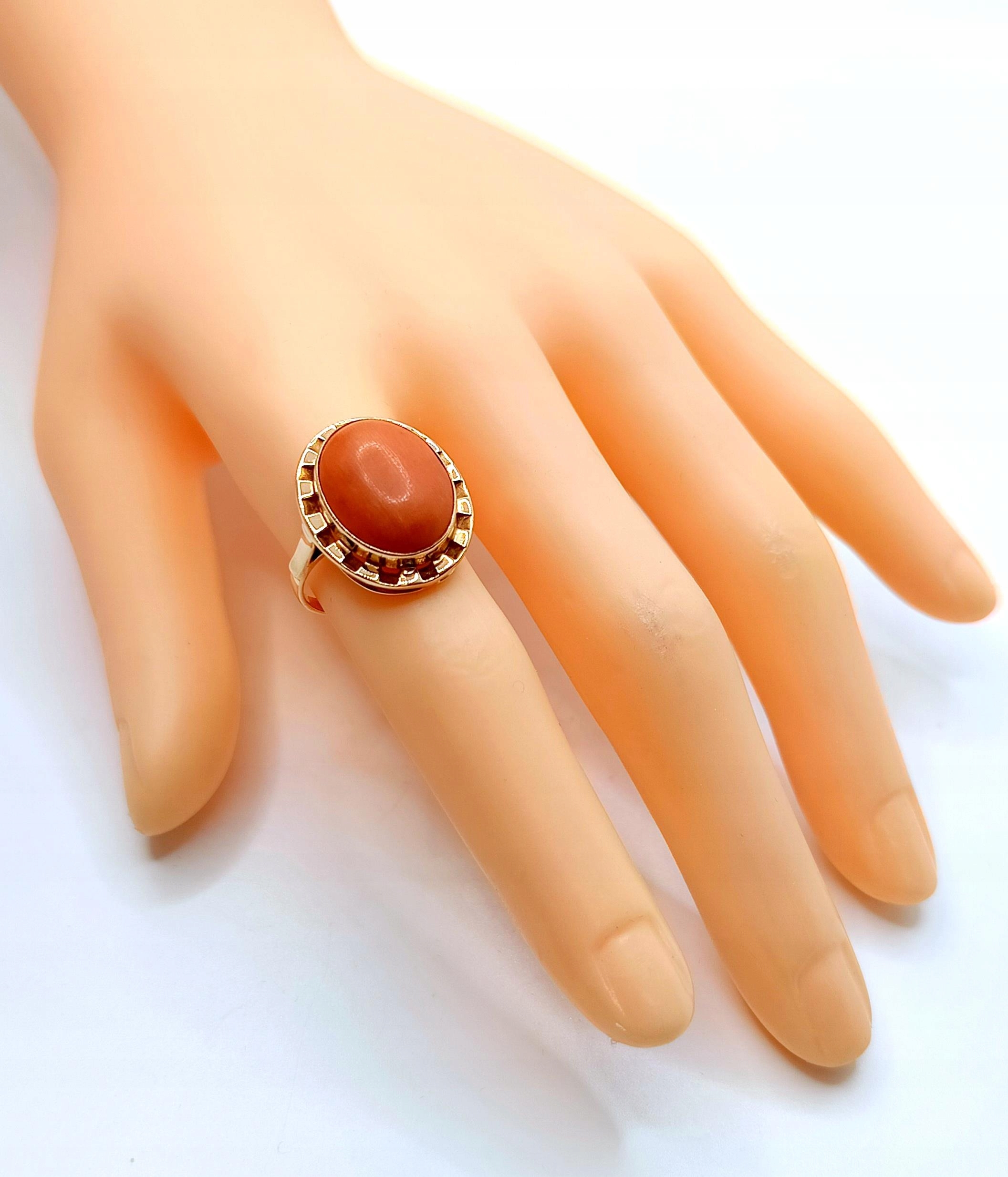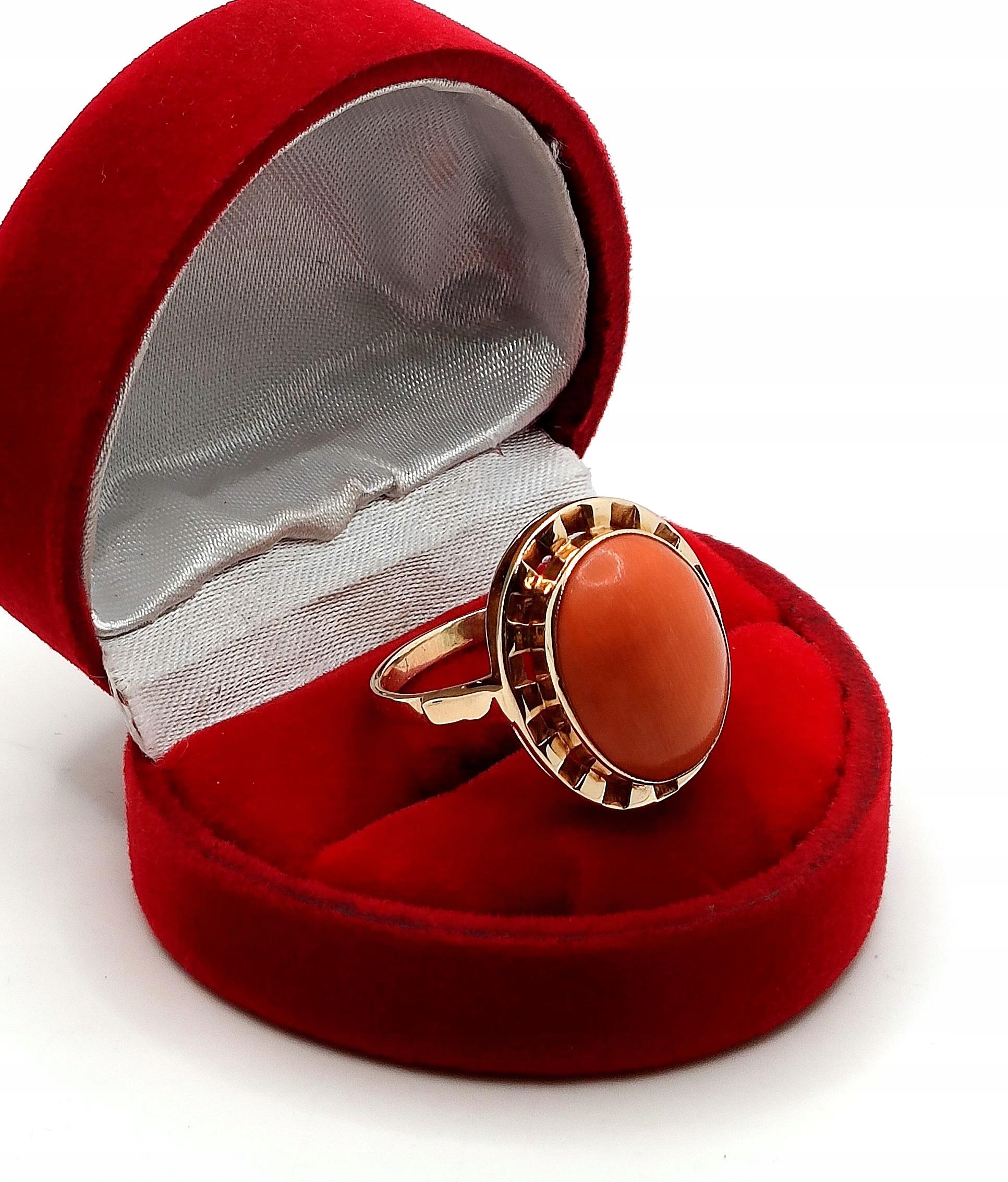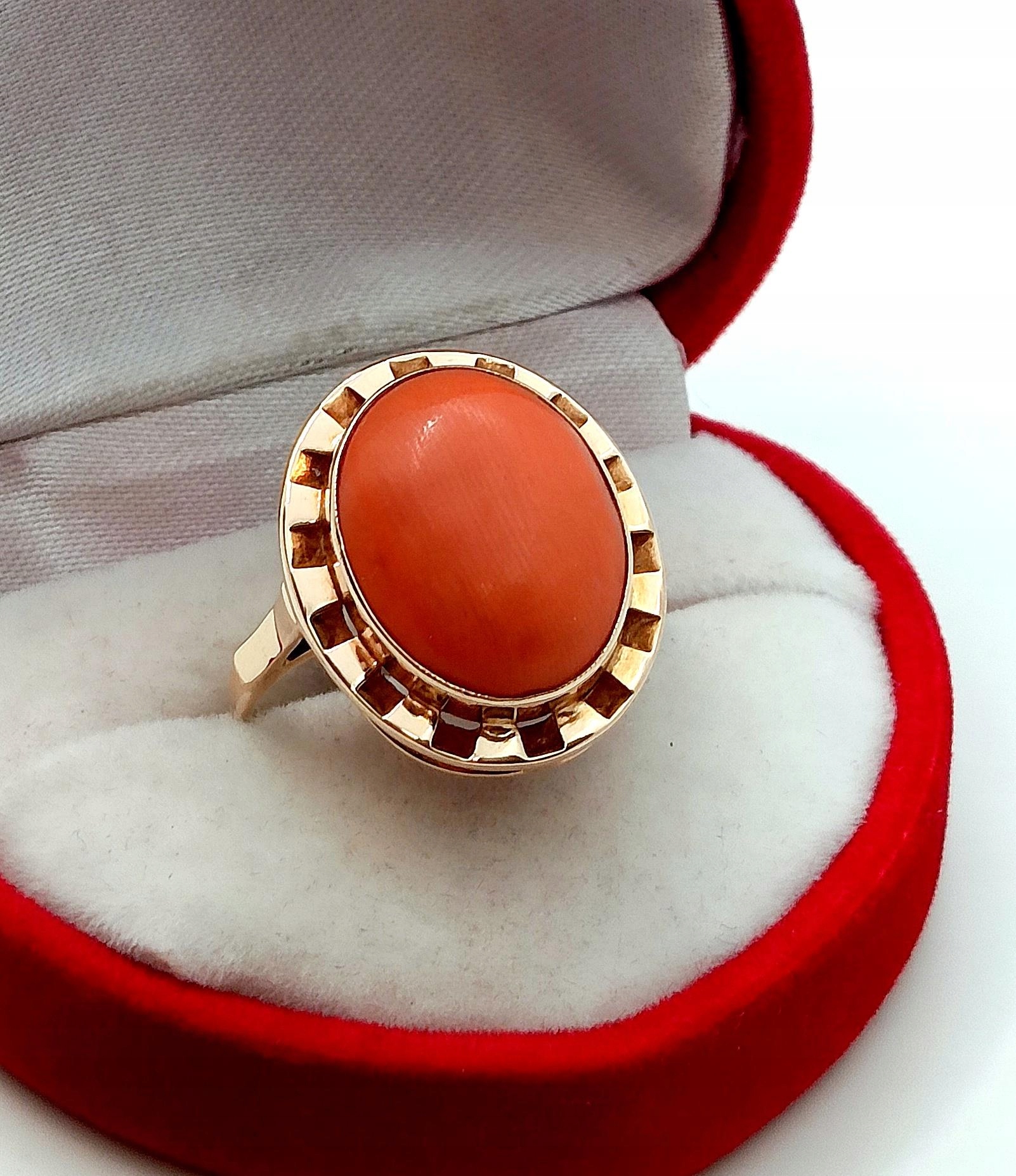 Oferujemy na sprzedaż złoty pierścionek zdobiony owalnym Koralem. Wokół Korala złoto z ząbkowanym wykończeniem.