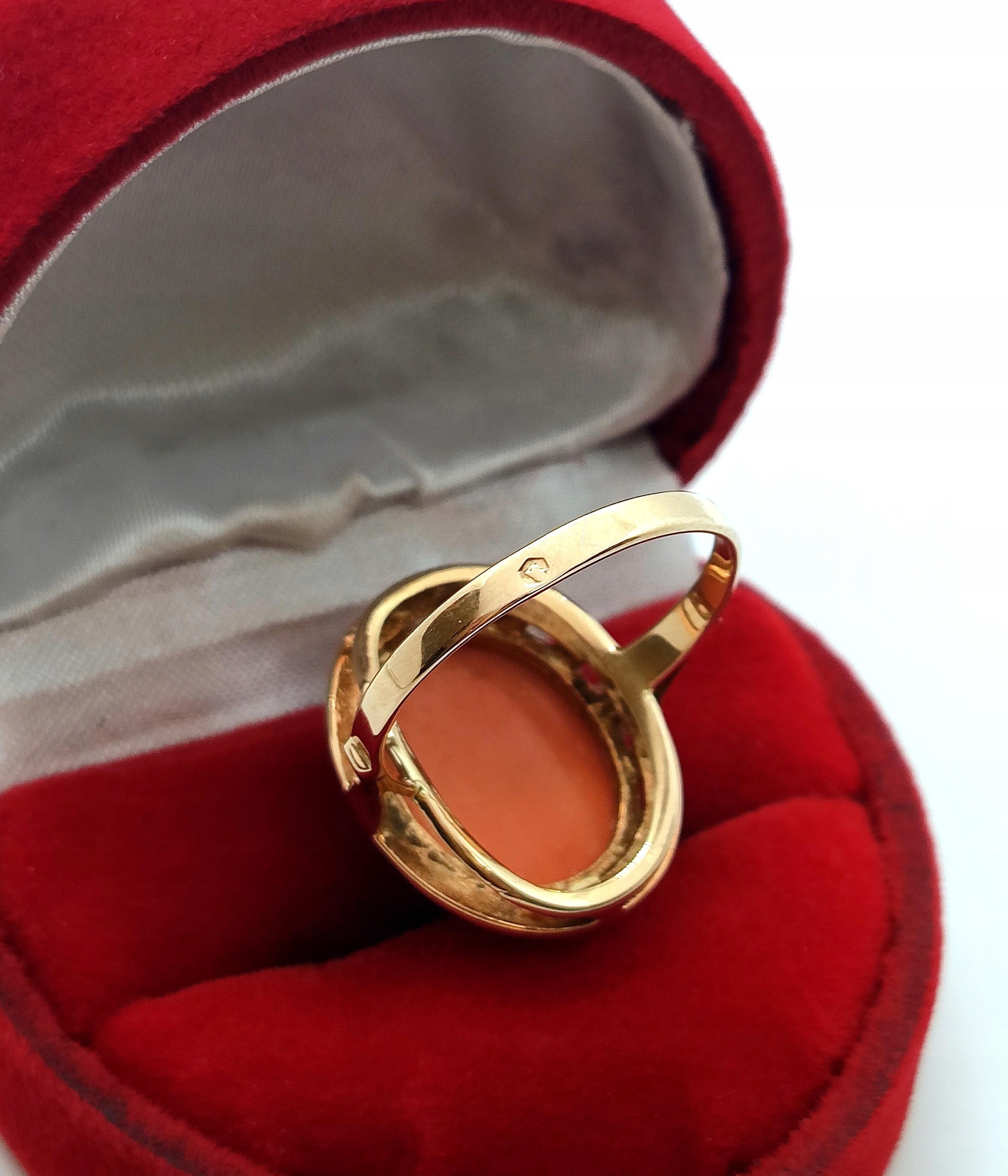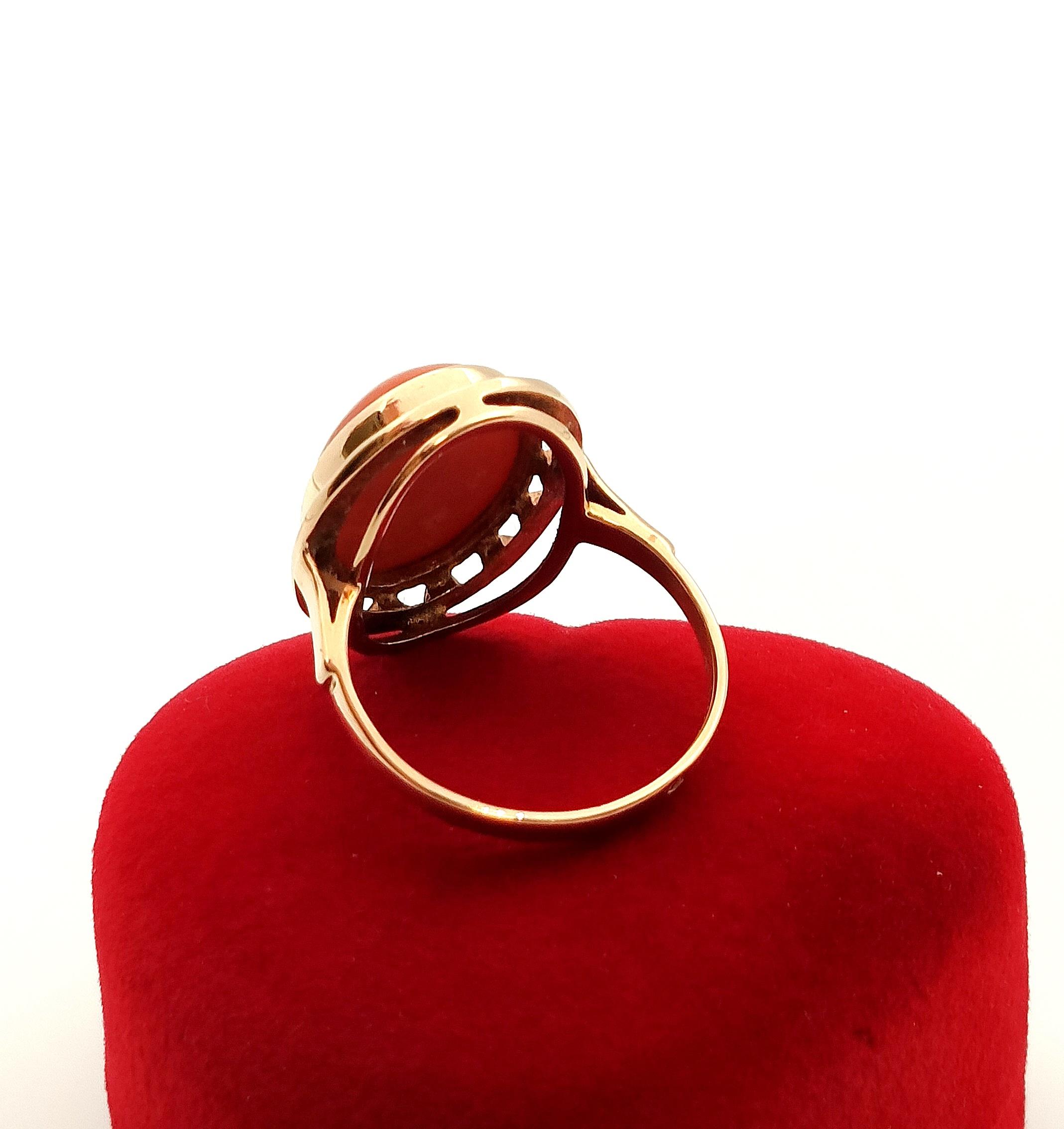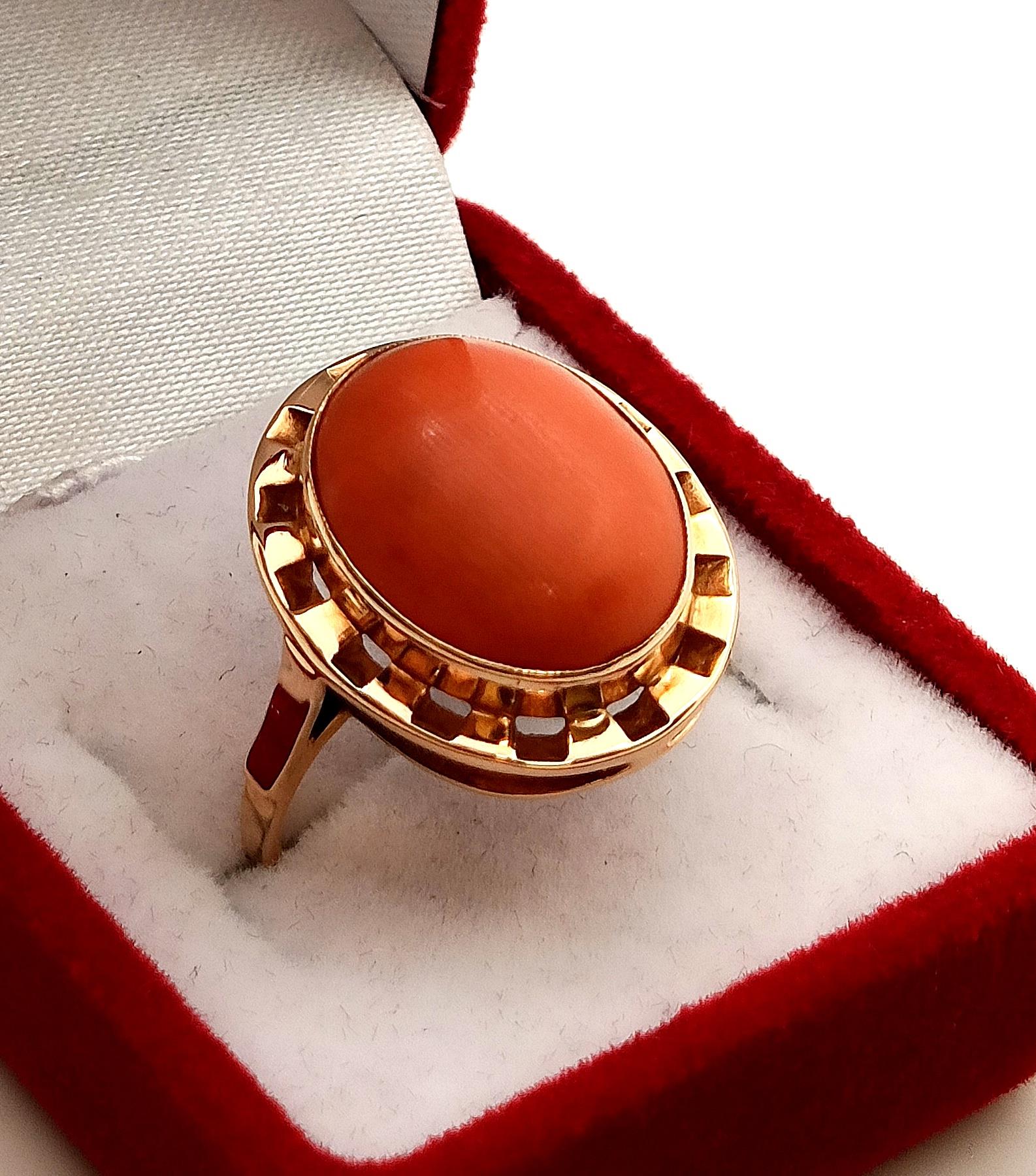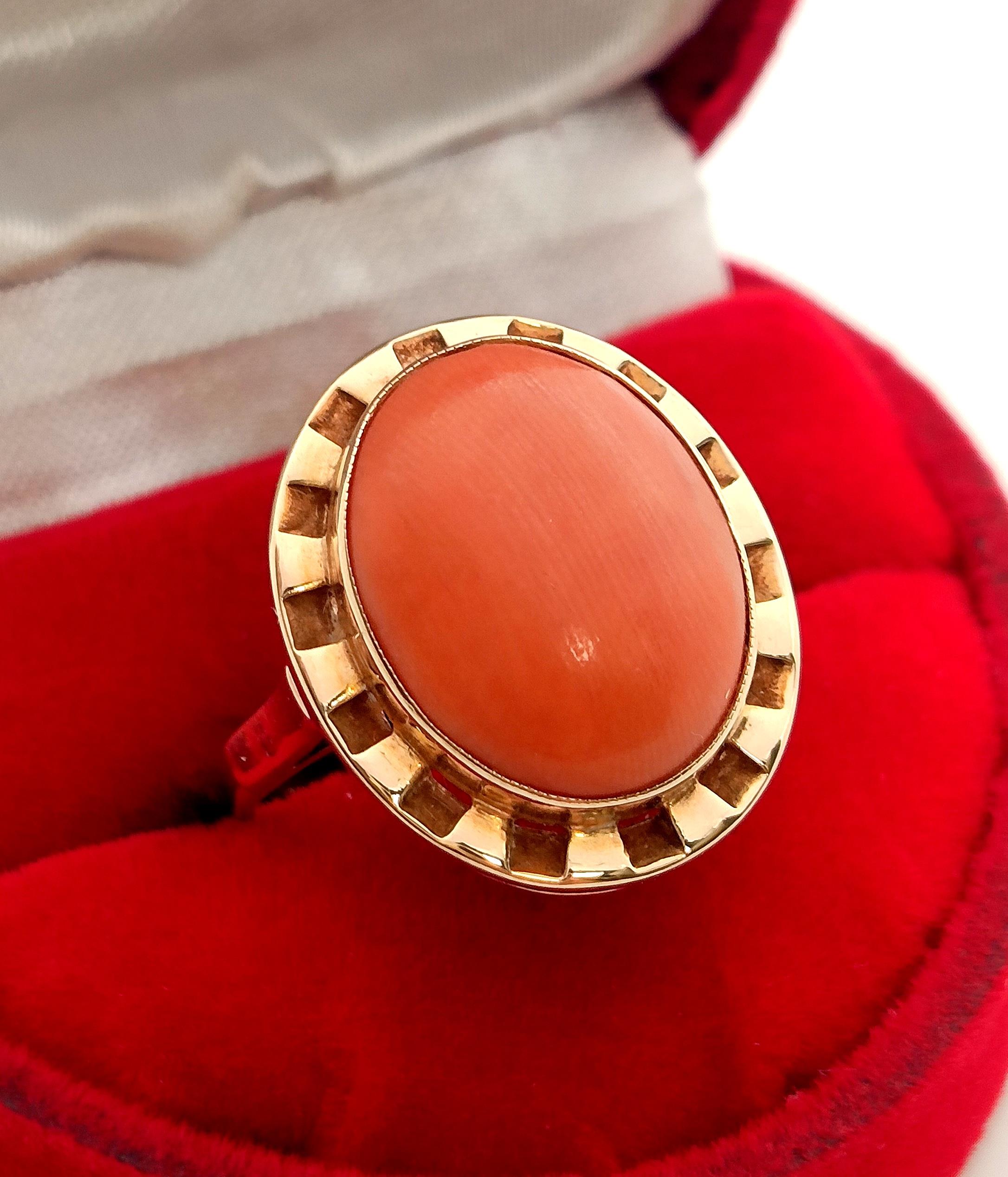 Oferujemy na sprzedaż złoty pierścionek zdobiony owalnym Koralem. Wokół Korala złoto z ząbkowanym wykończeniem.