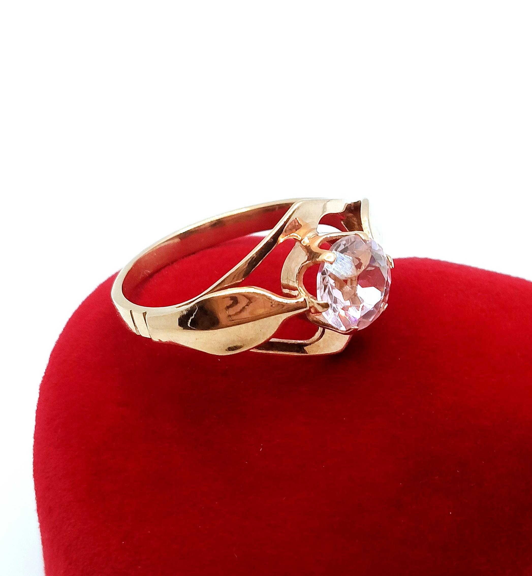 W ofercie na sprzedaż mamy dla państwa szeroki, złoty pierścionek zdobiony okrągłym Morganitem.