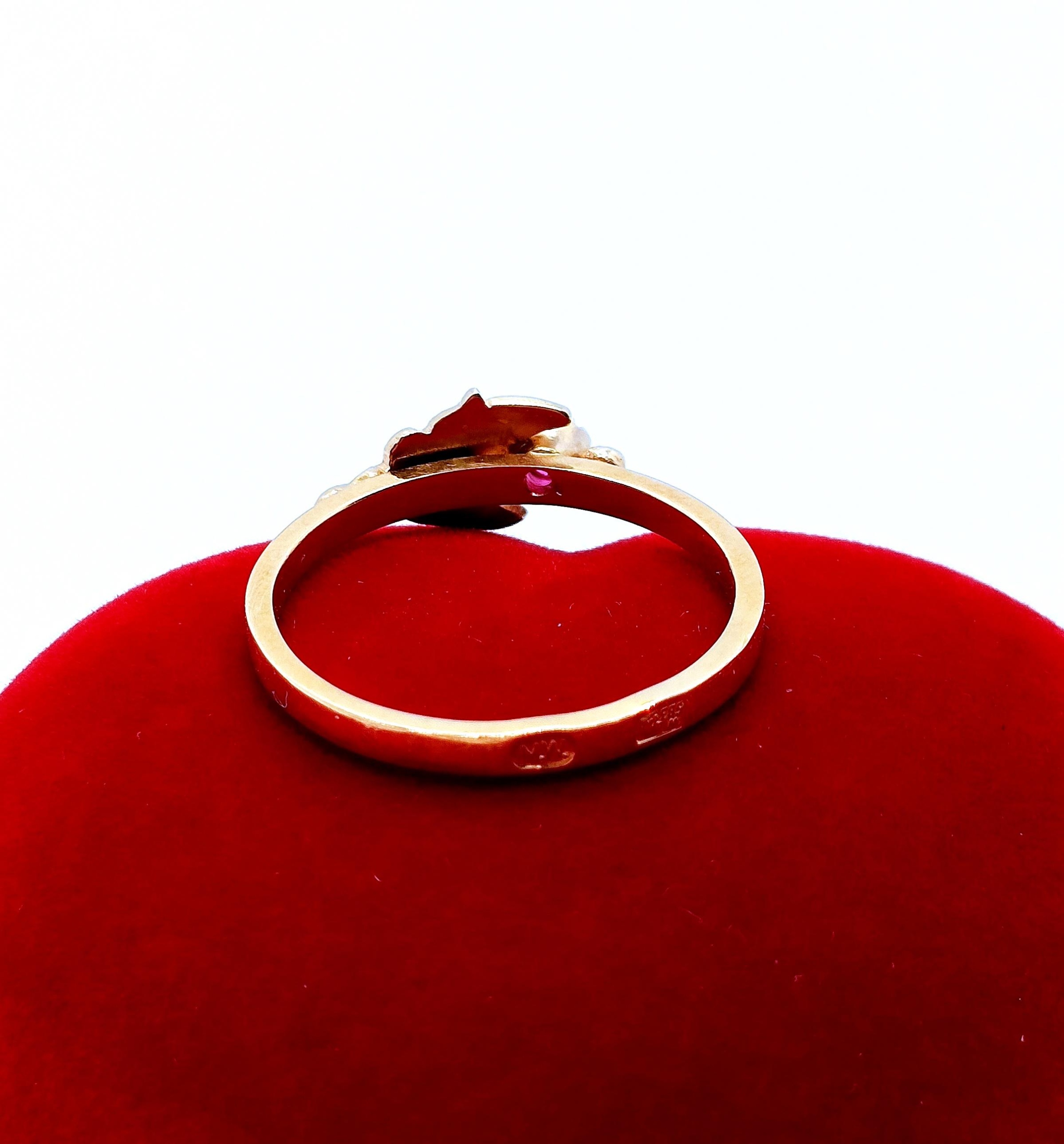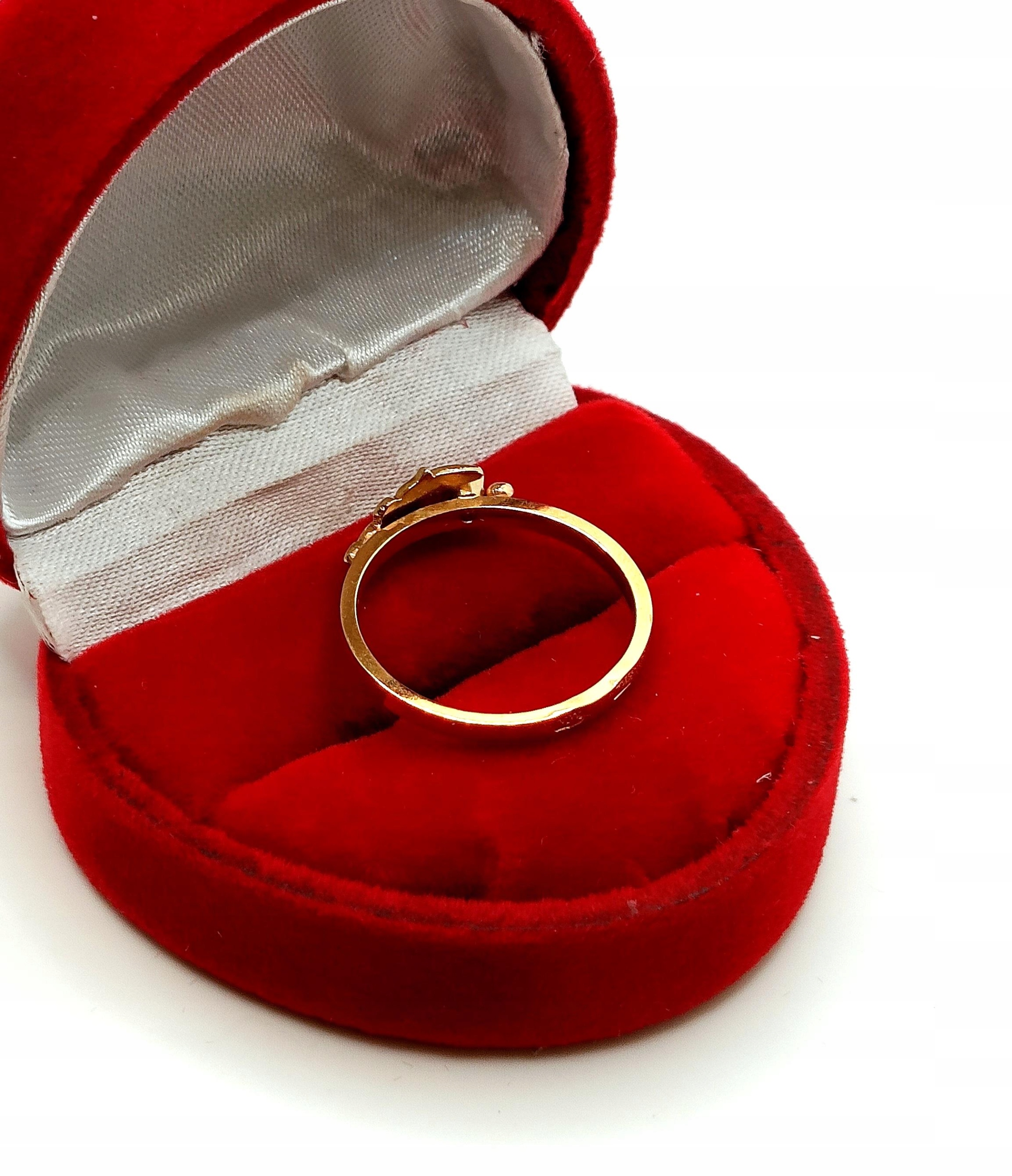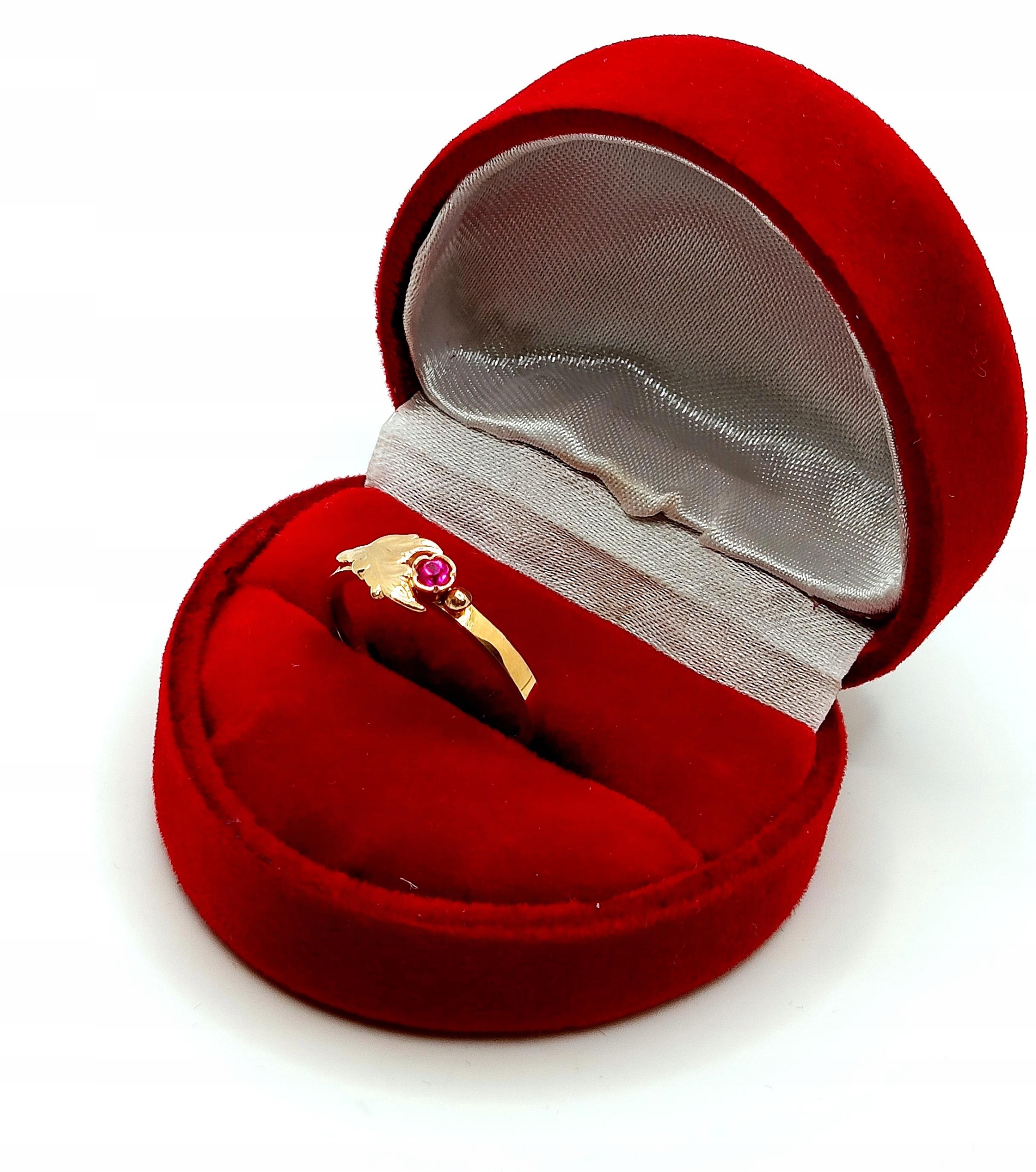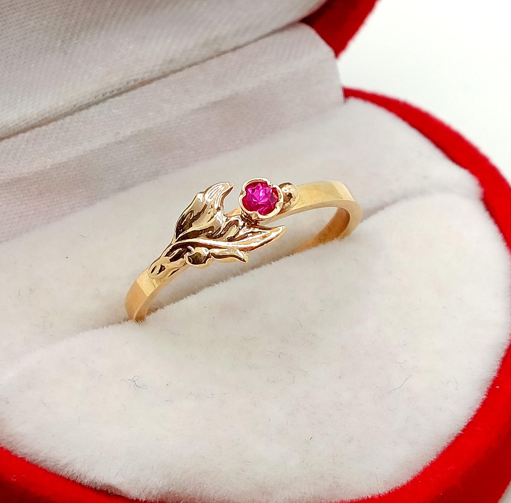 Oferujemy na sprzedaż złoty pierścionek z różową cyrkonią otuloną złotym listkiem.