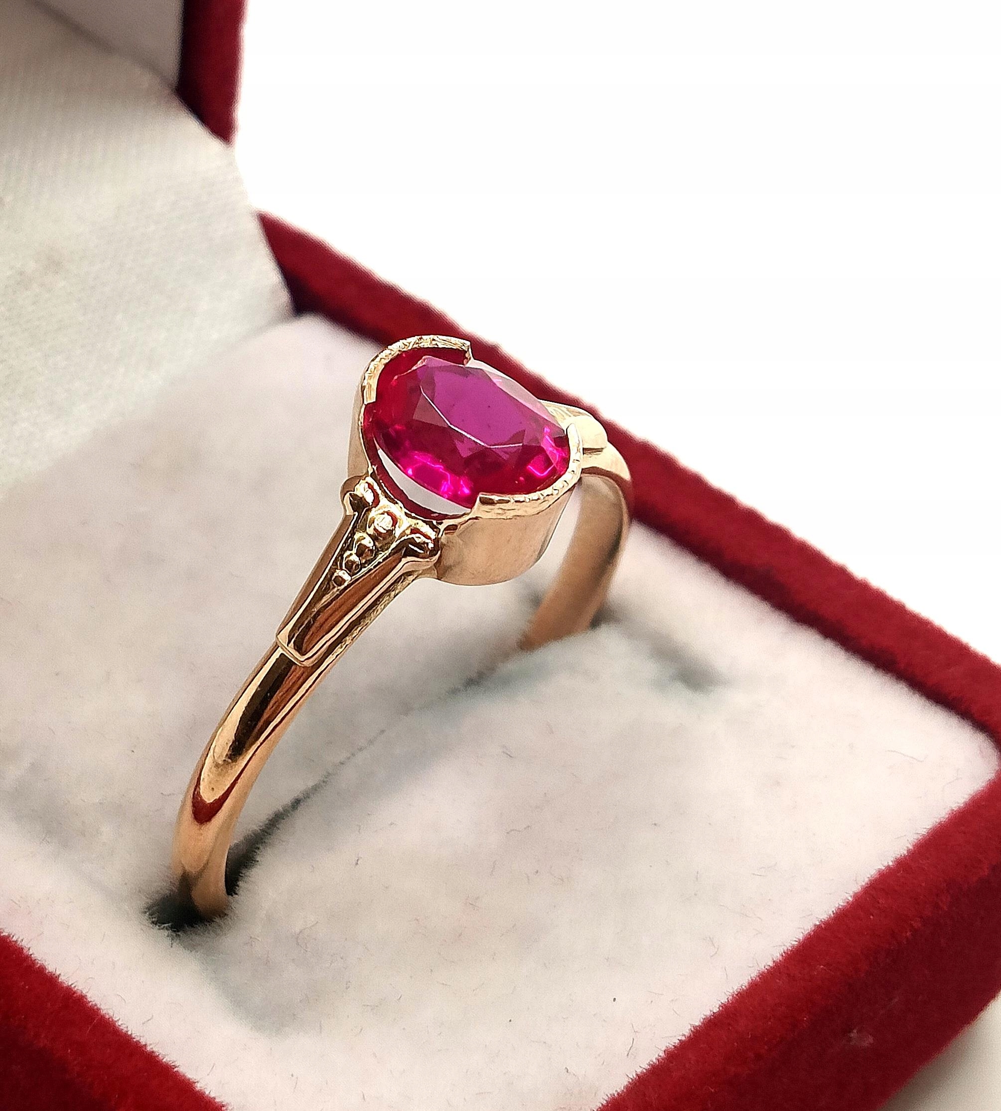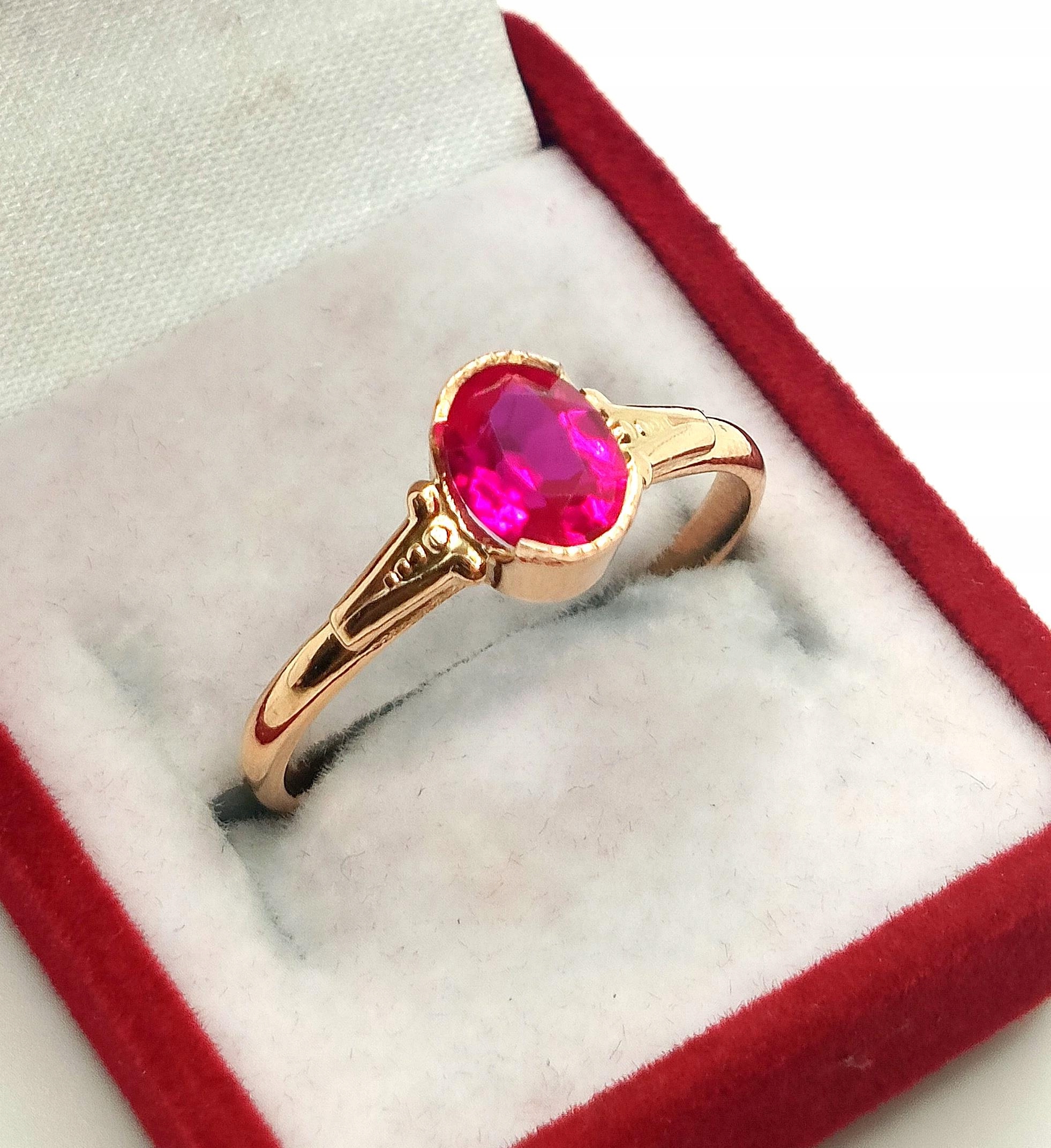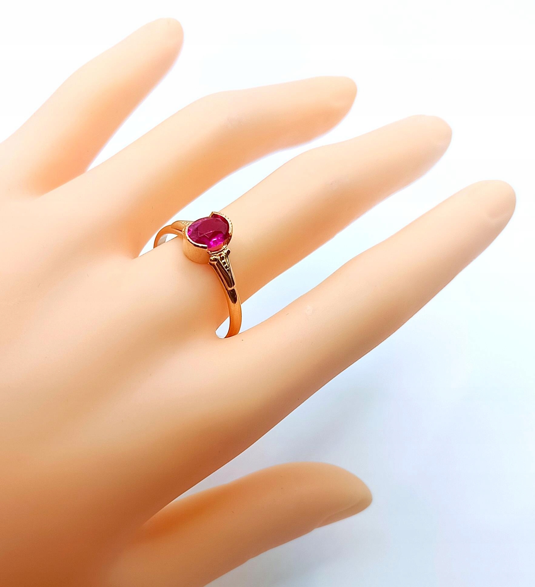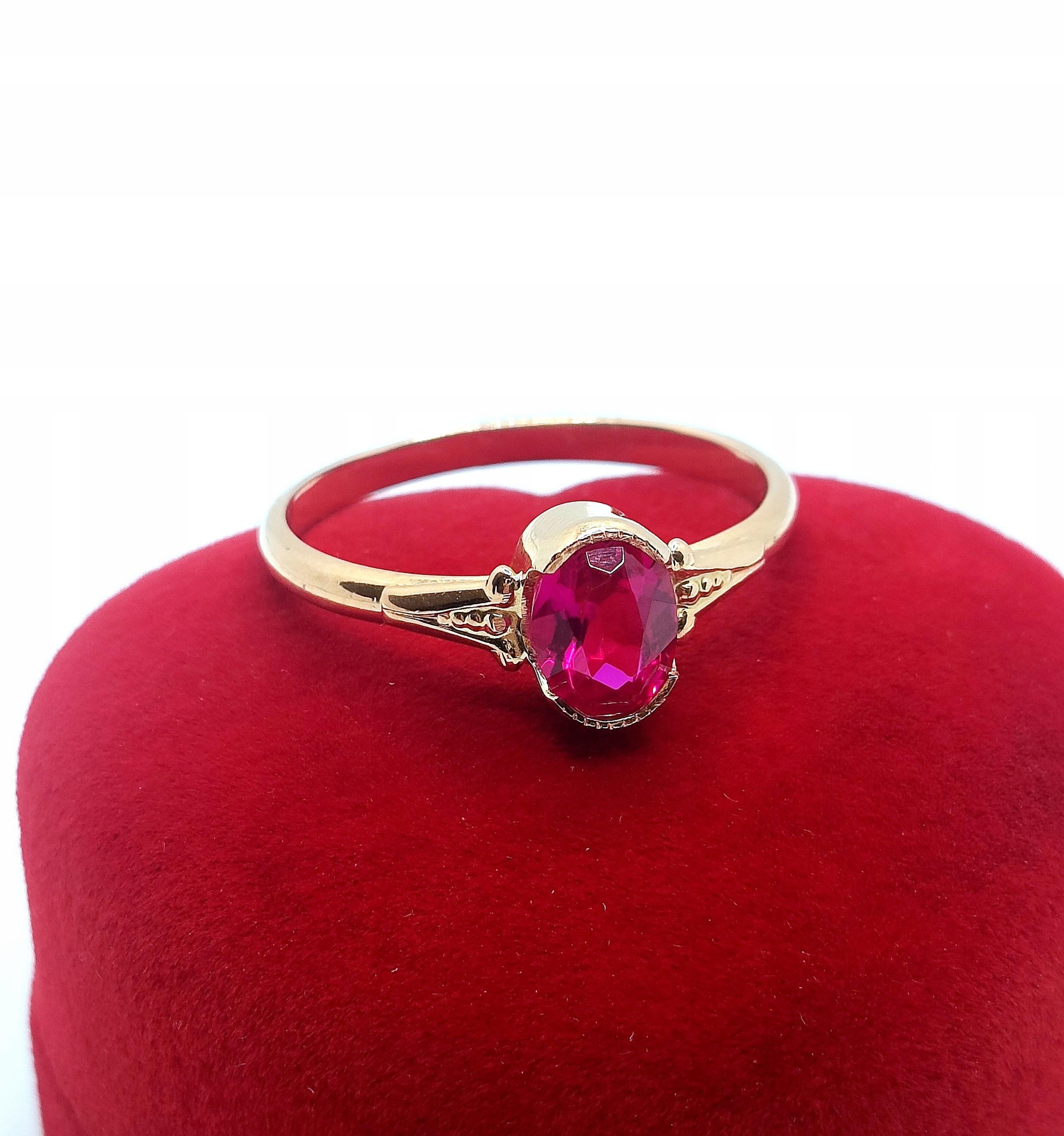 Oferujemy na sprzedaż piękny, złoty pierścionek, ozdobiony różowym kamieniem. Możliwe, że to amarant.