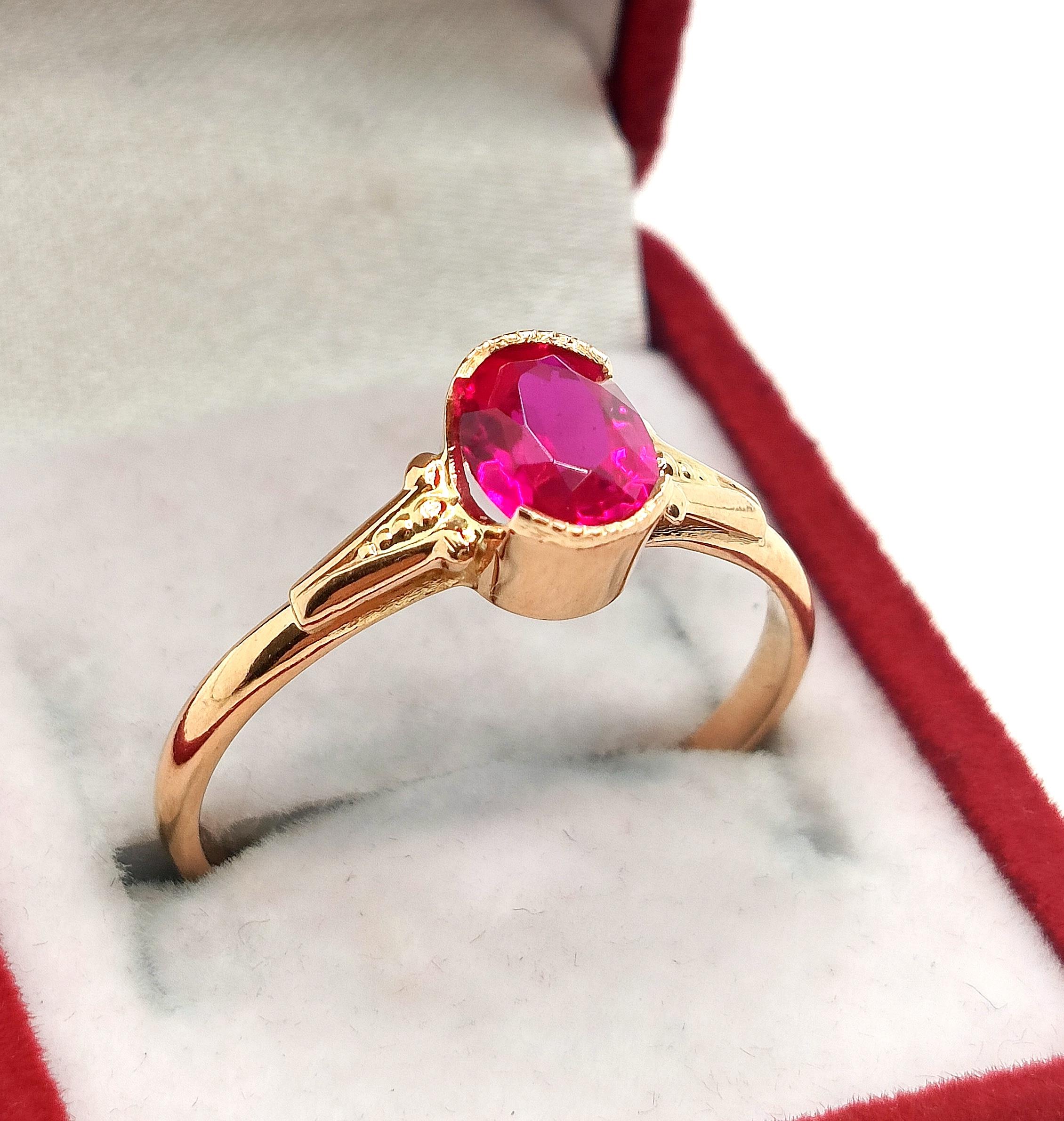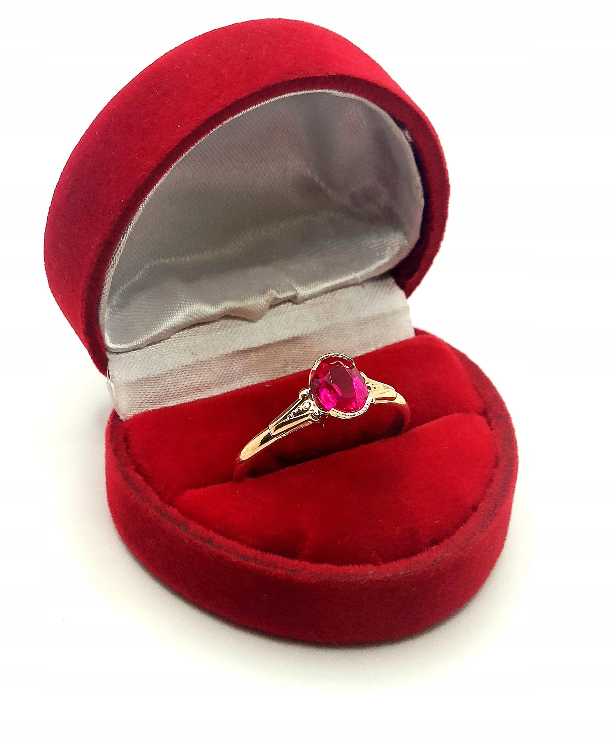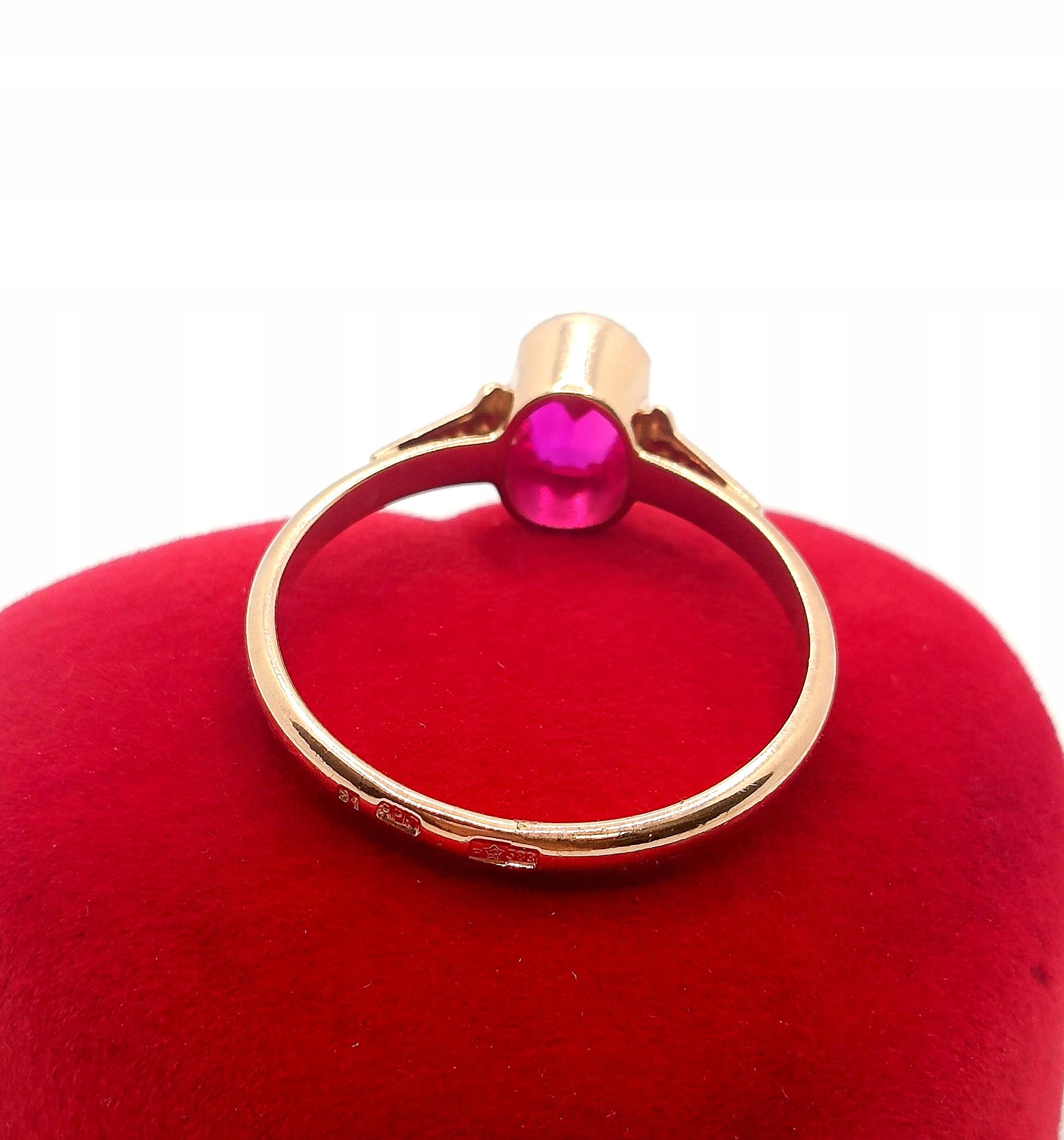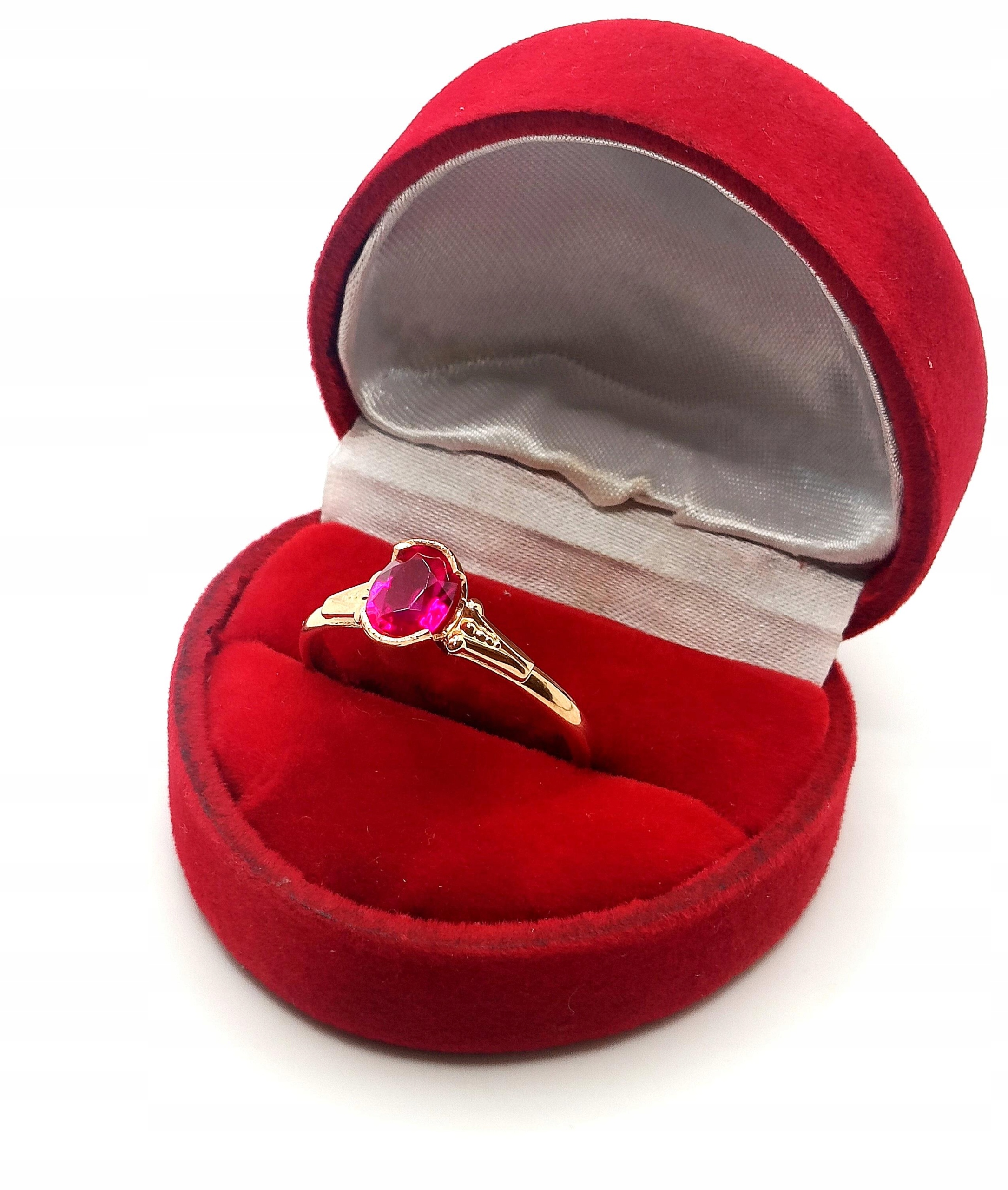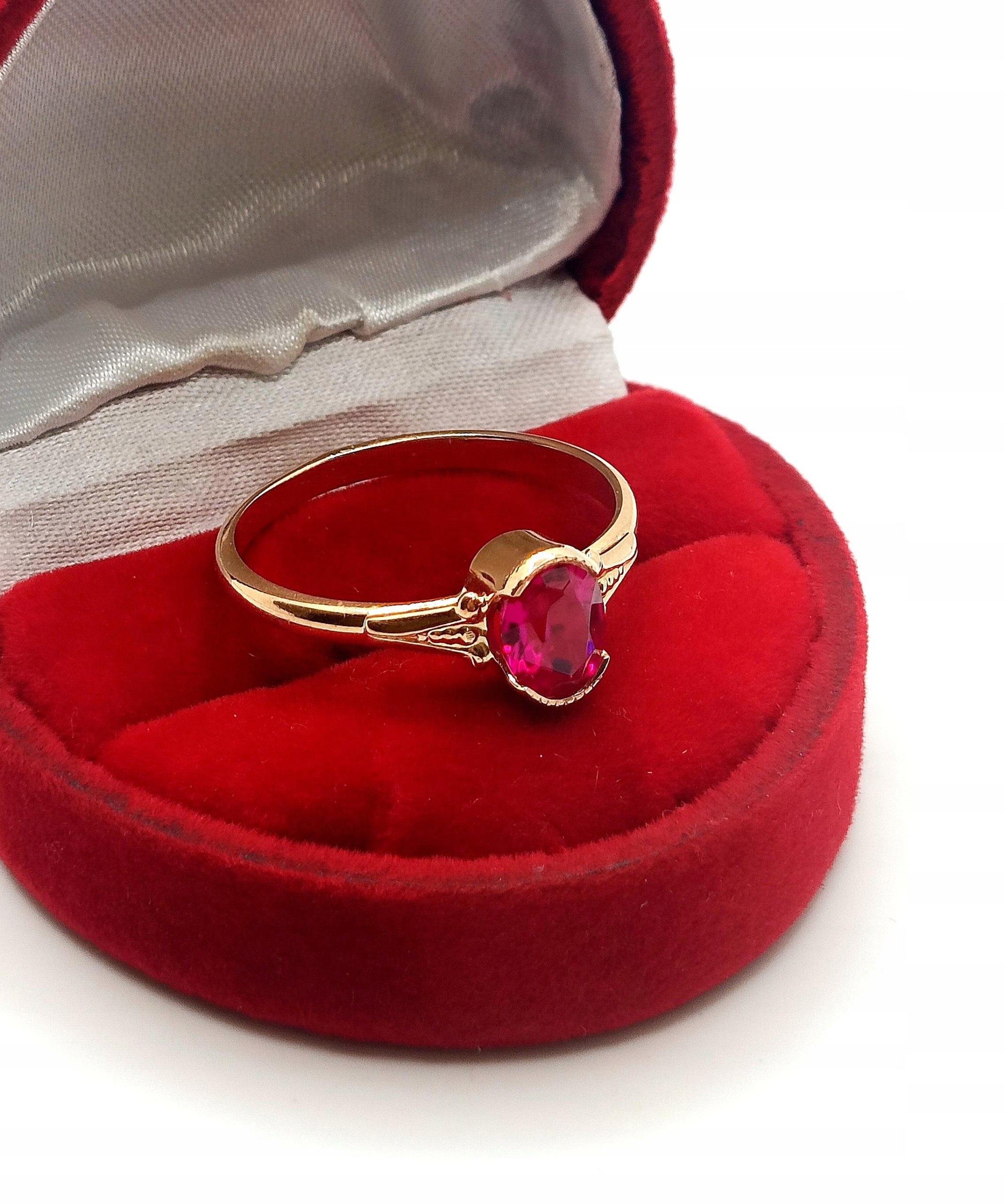 Oferujemy na sprzedaż piękny, złoty pierścionek, ozdobiony różowym kamieniem. Możliwe, że to amarant.