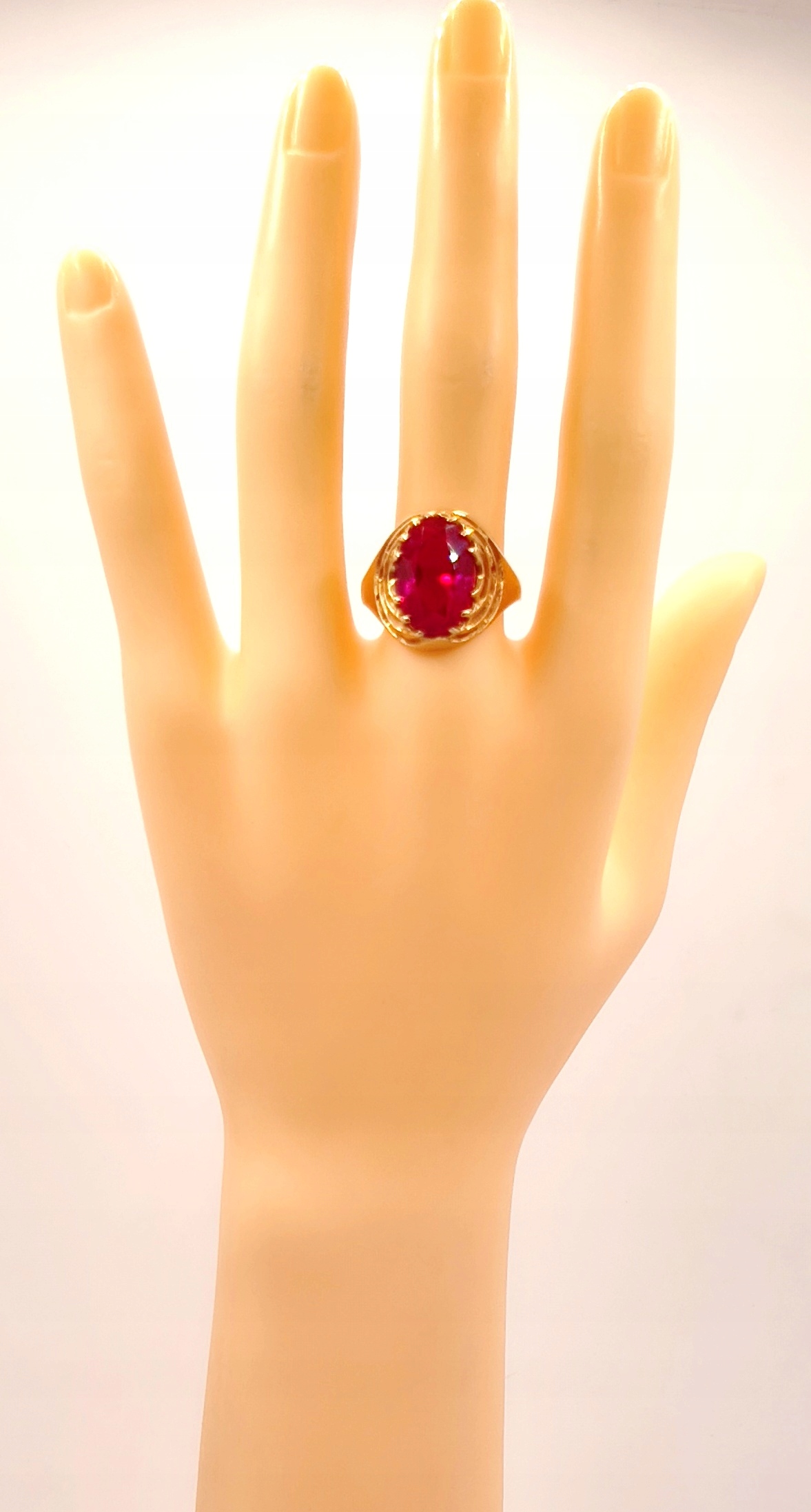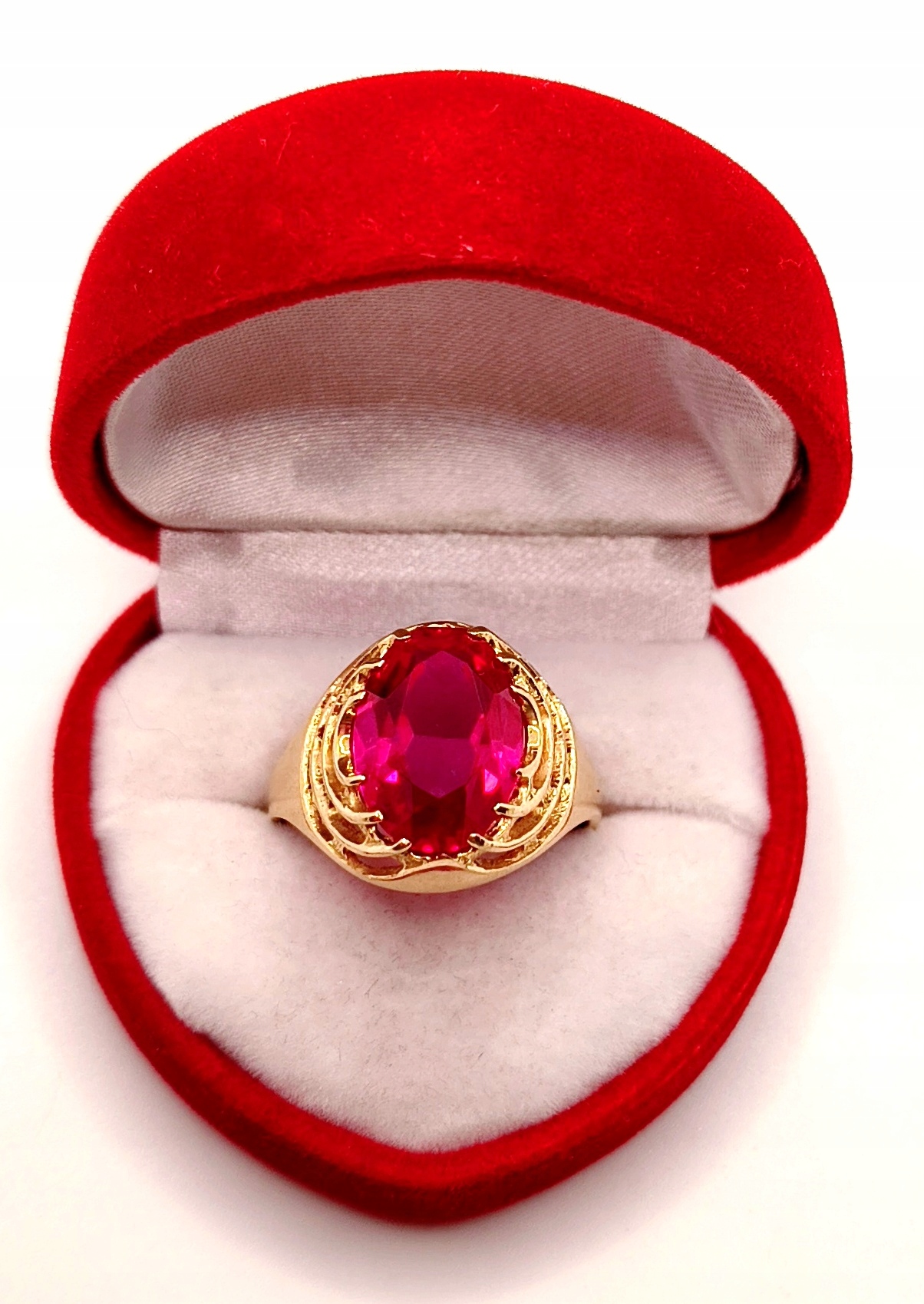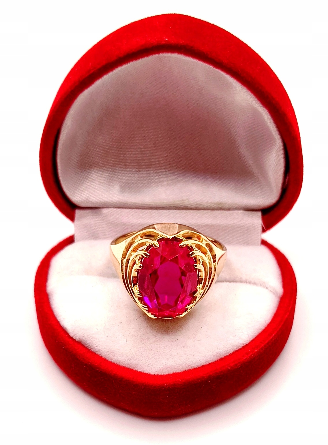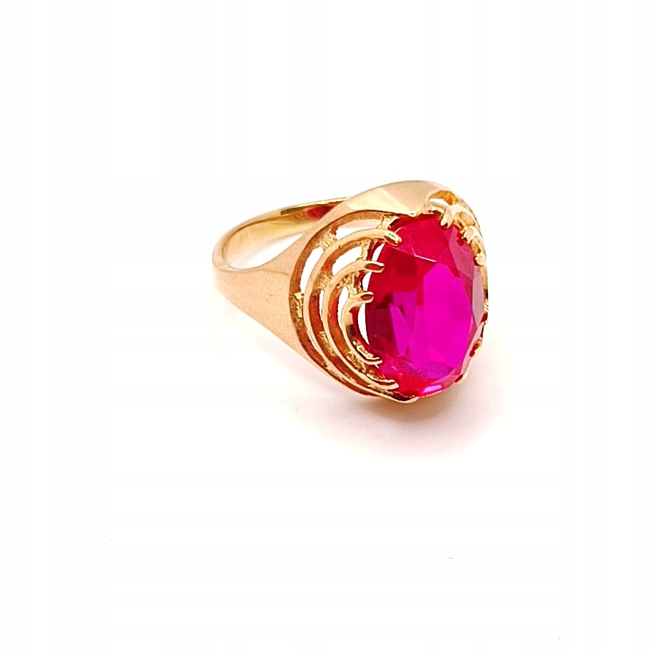 W ofercie na sprzedaż mamy dla państwa złoty pierścionek ozdobiony syntetycznym rubinem.