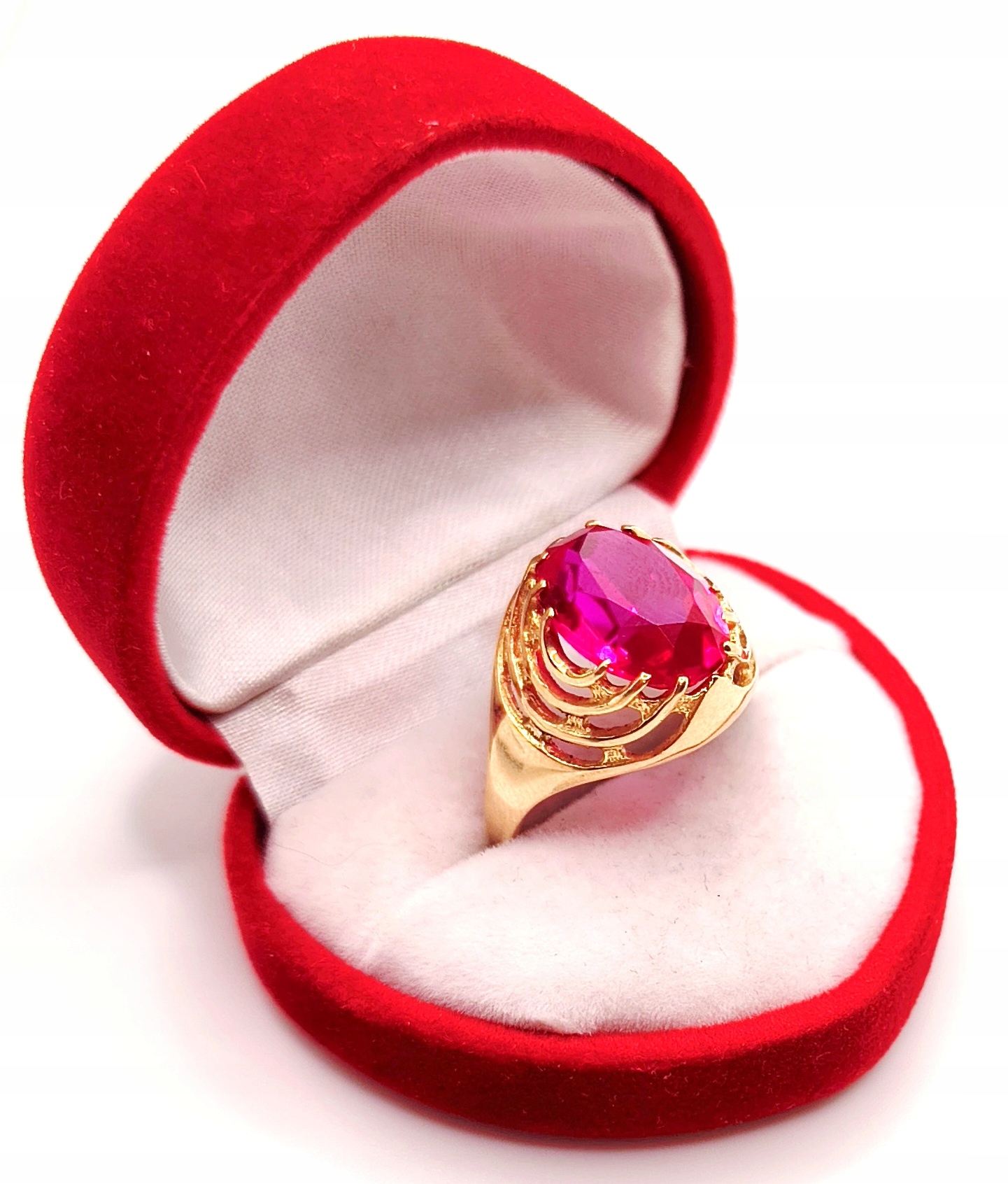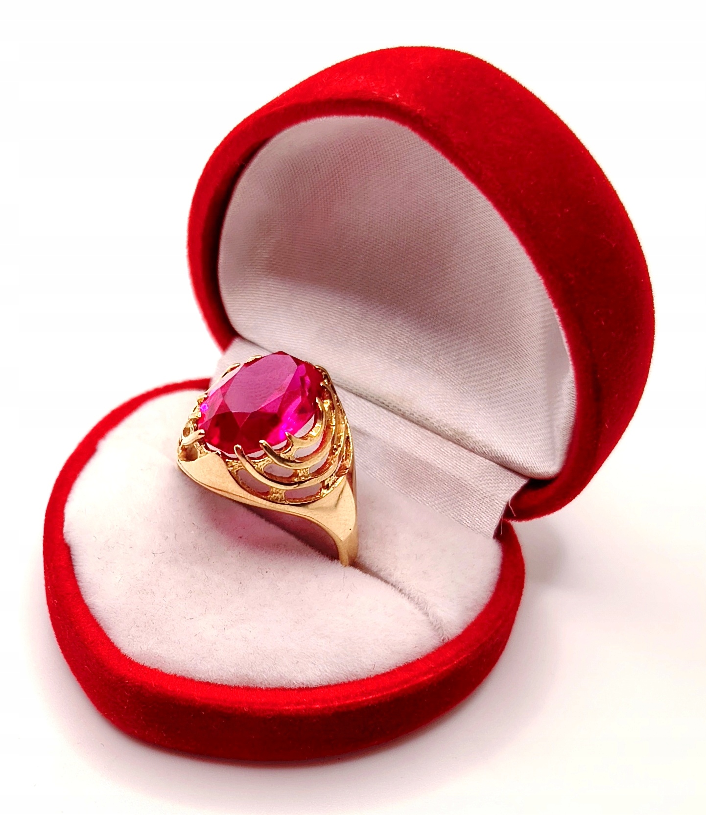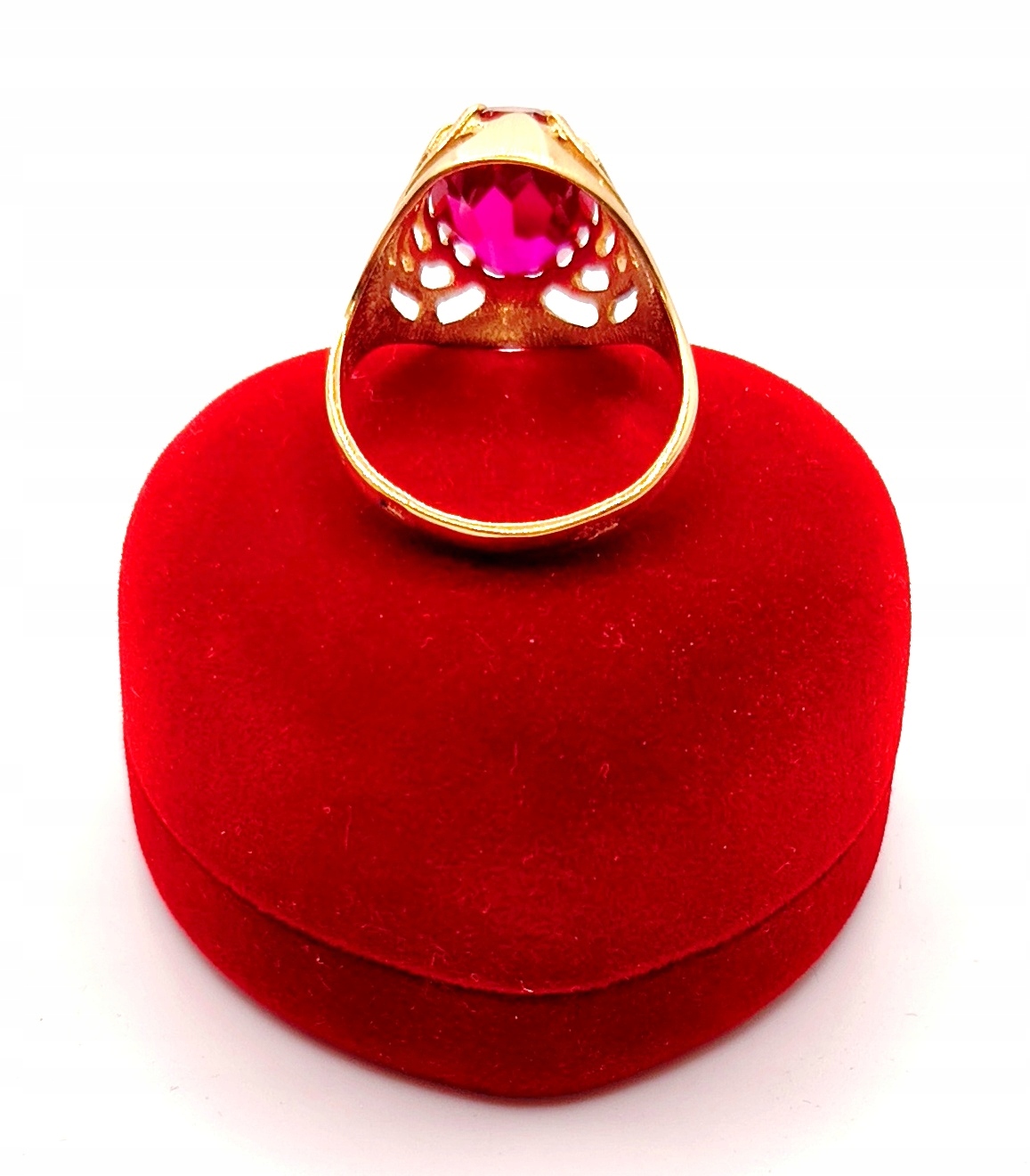 W ofercie na sprzedaż mamy dla państwa złoty pierścionek ozdobiony syntetycznym rubinem.