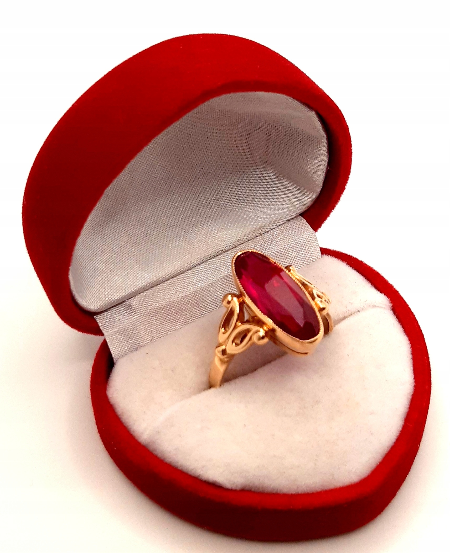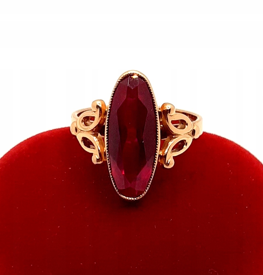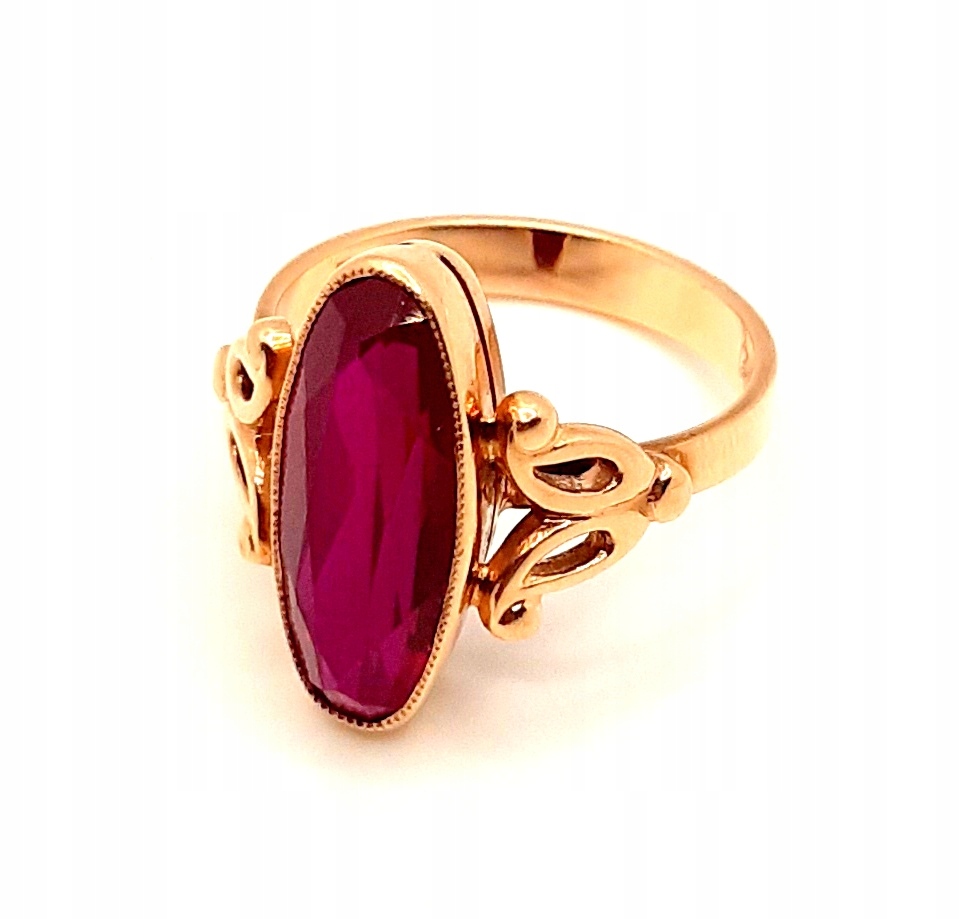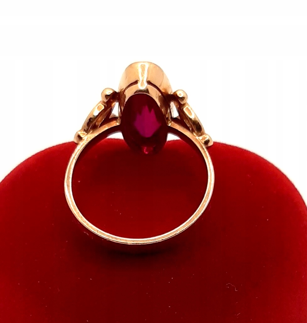 Oferujemy na sprzedaż złoty pierścionek ozdobiony syntetycznym rubinem.