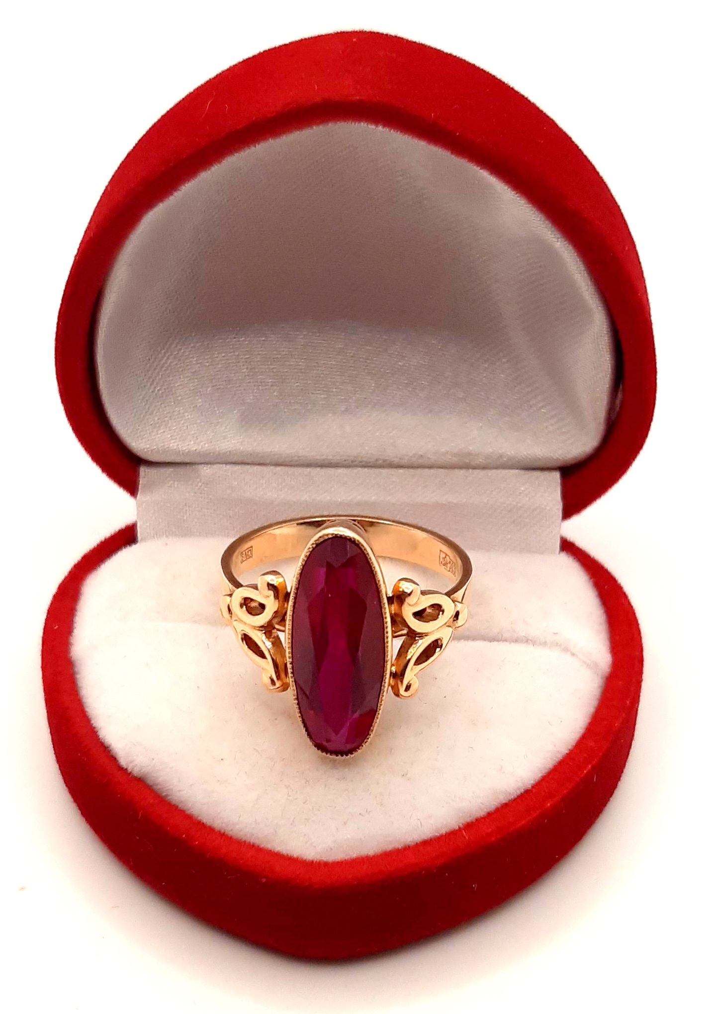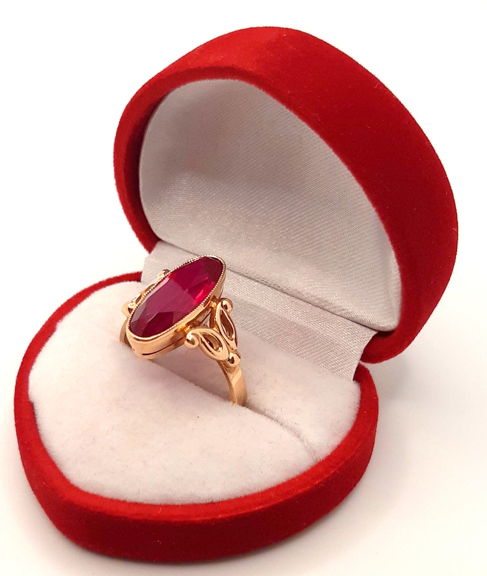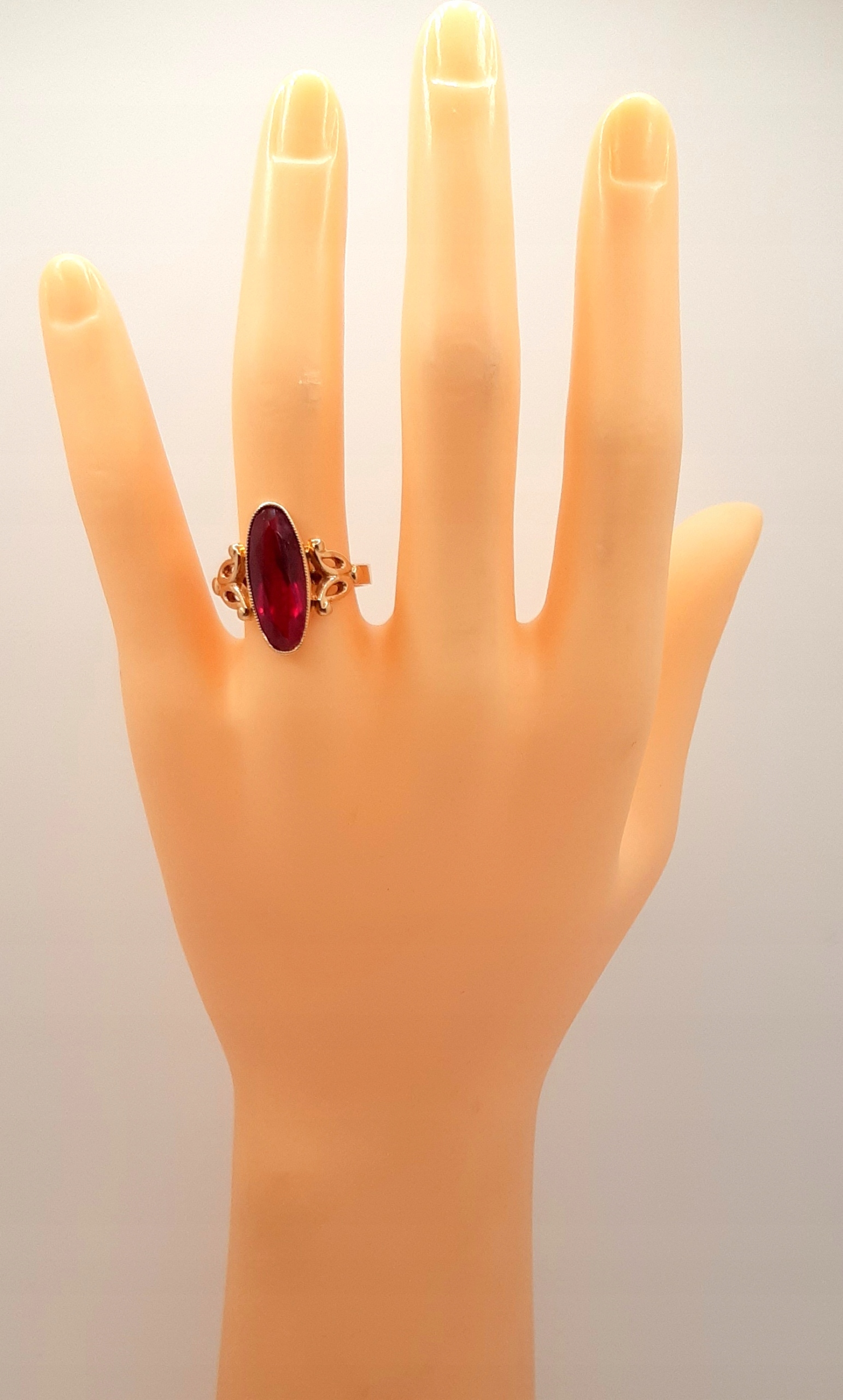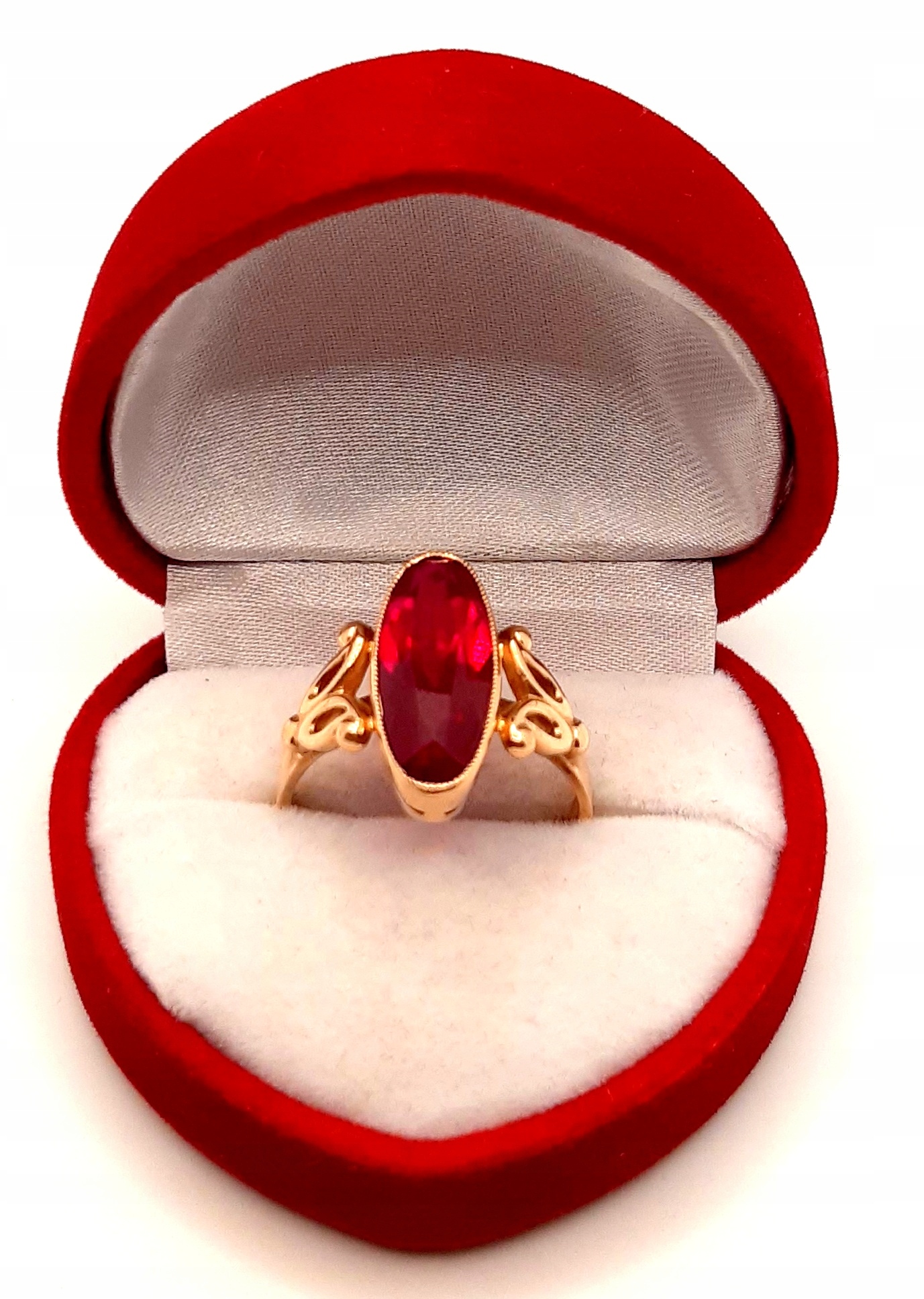 Oferujemy na sprzedaż złoty pierścionek ozdobiony syntetycznym rubinem.
