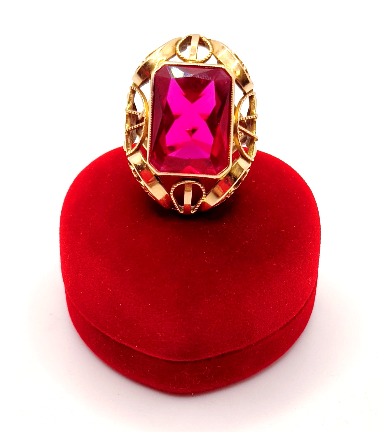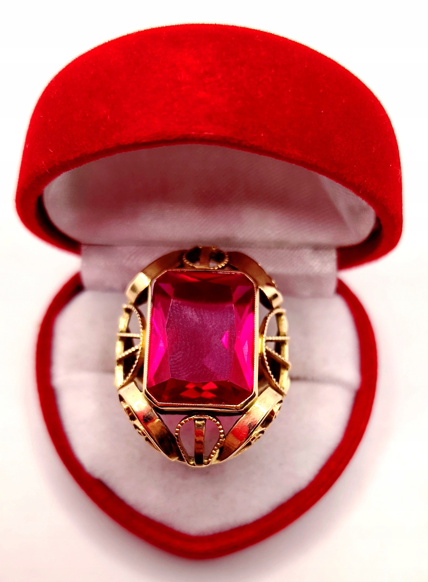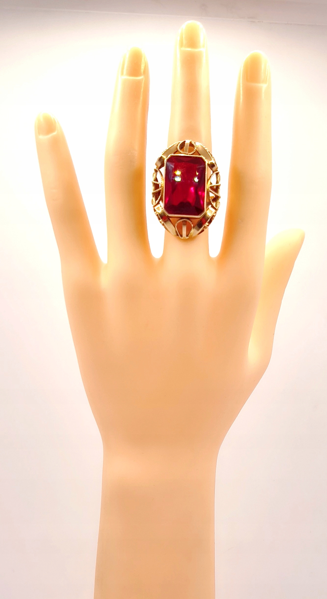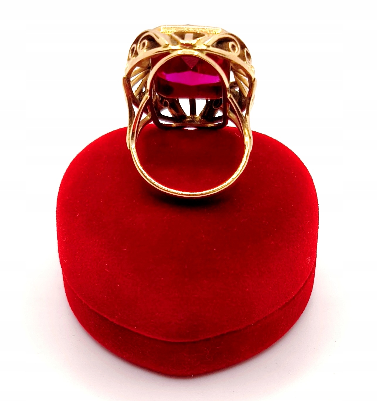 W ofercie na sprzedaż mamy dla Państwa złoty pierścionek ozdobiony syntetycznym rubinem.