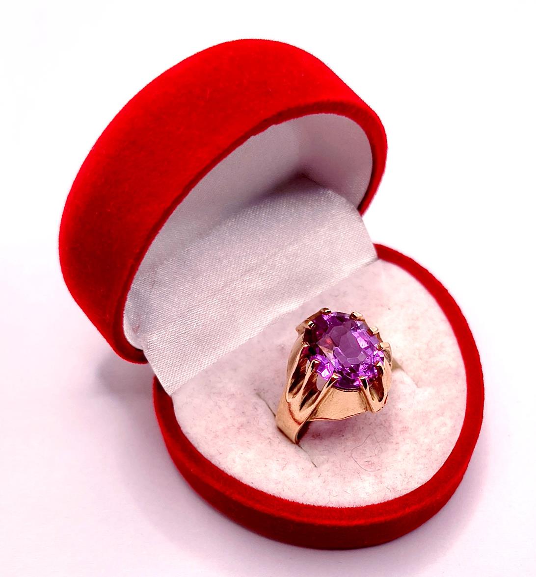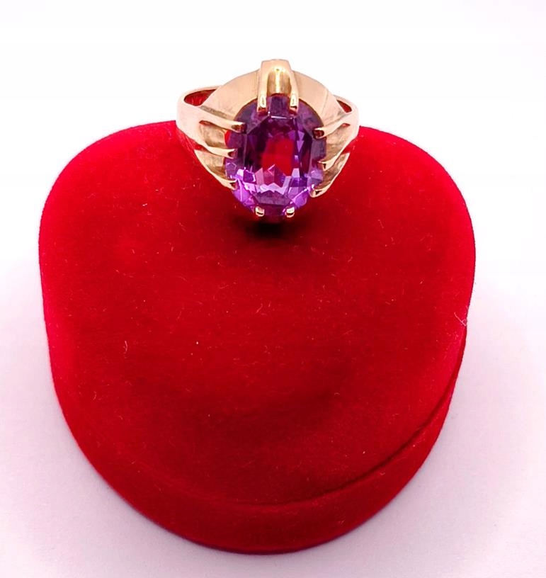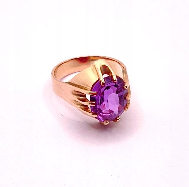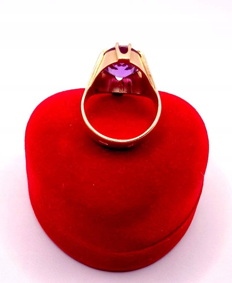 W ofercie sprzedaży posiadamy złoty sygnet damski ozdobiony syntetycznym ametystem.