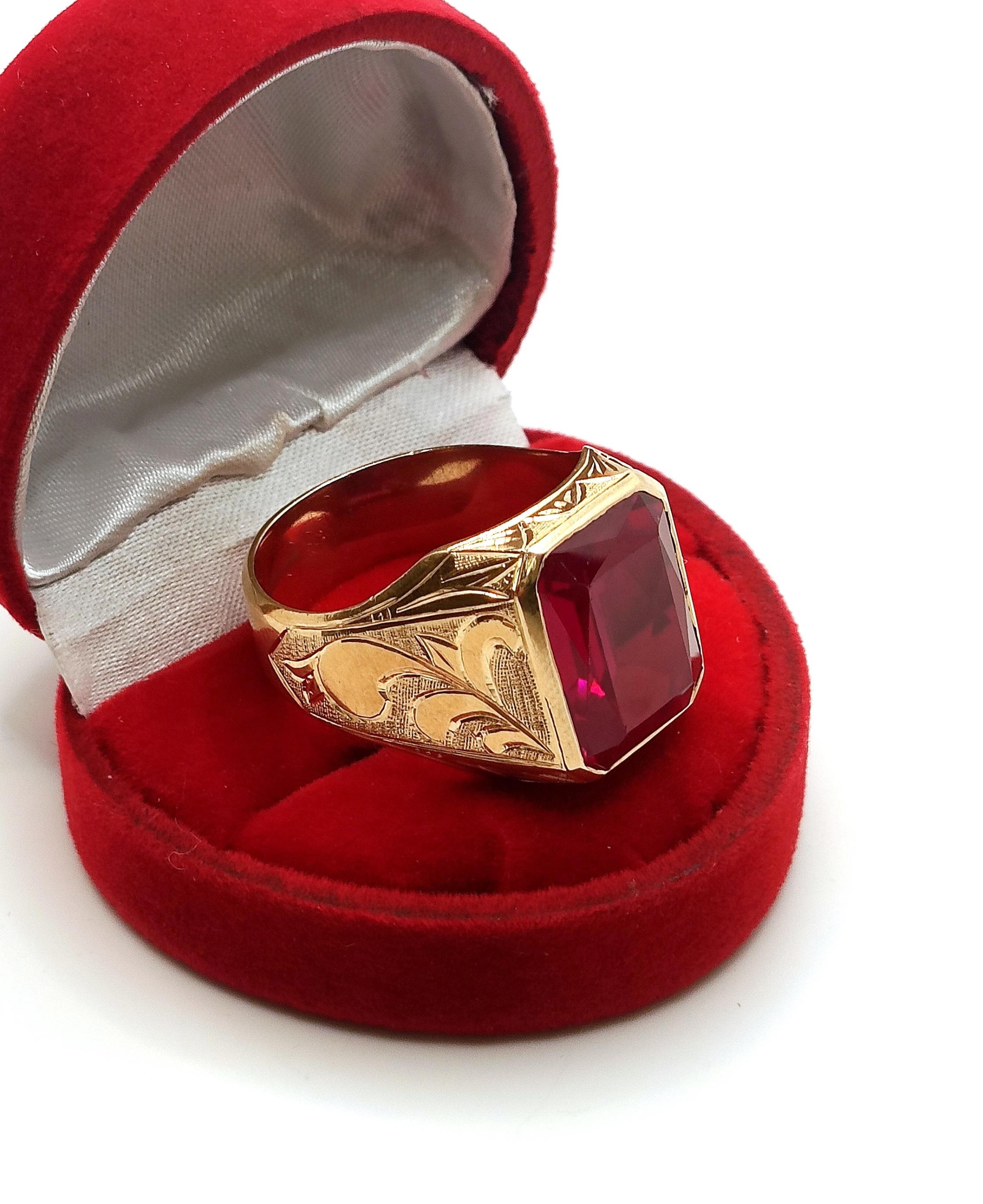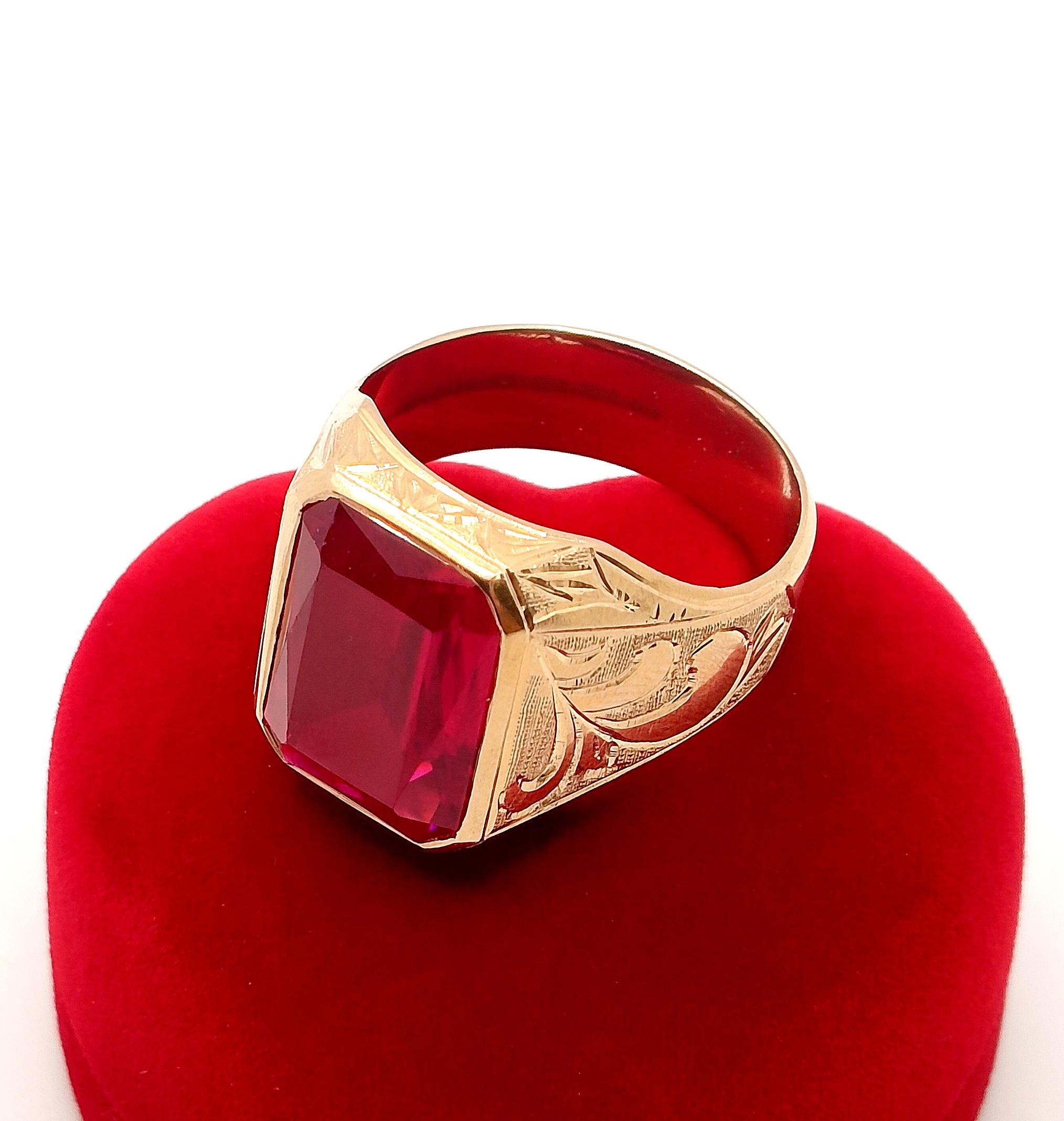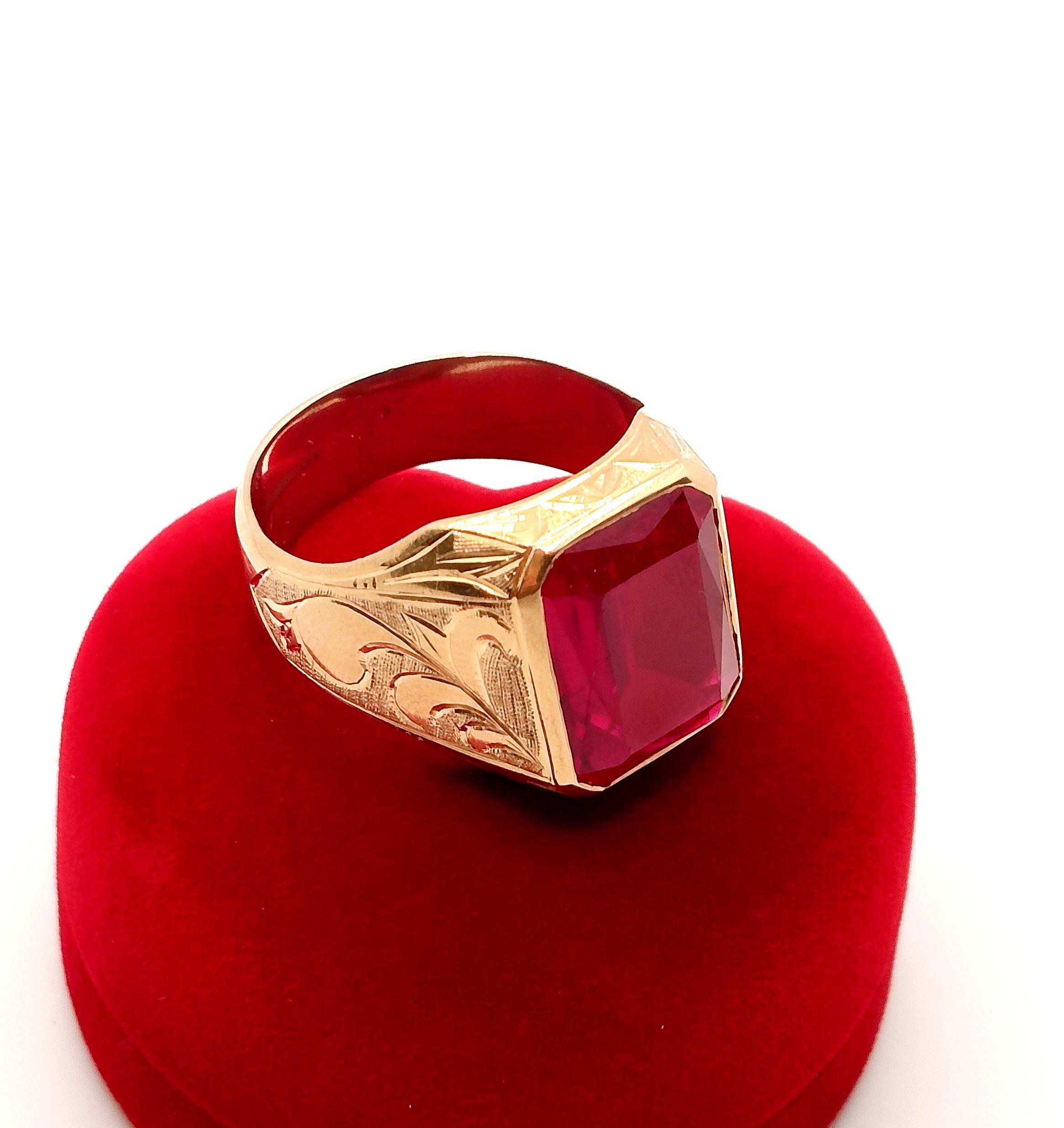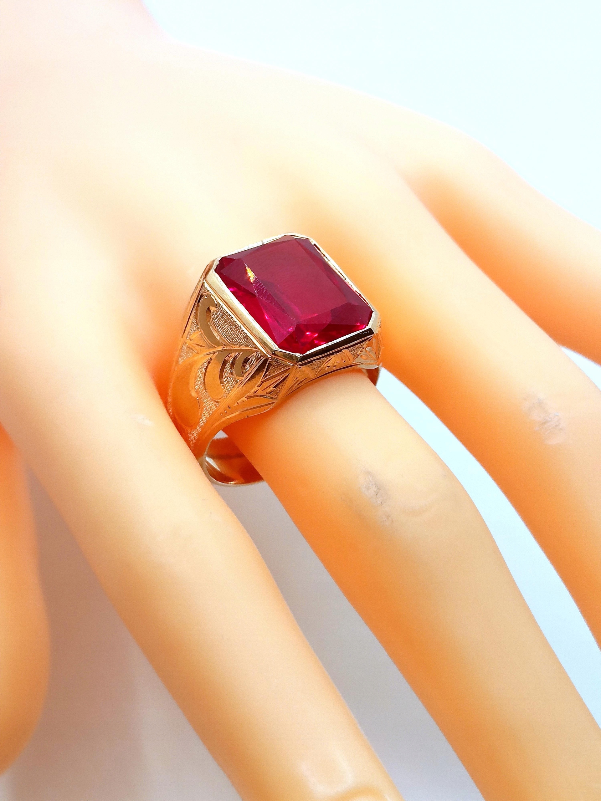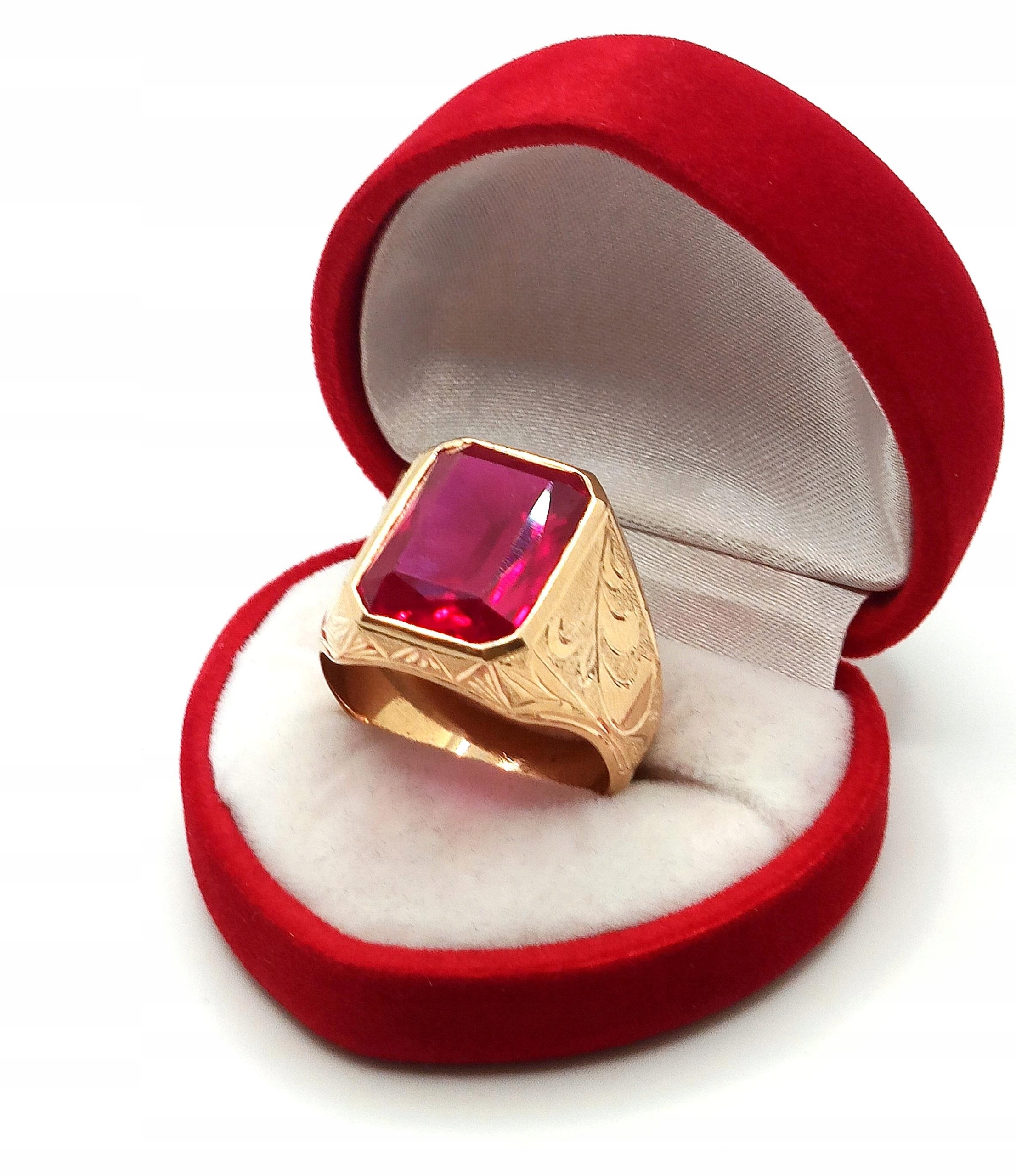 W ofercie na sprzedaż mamy dla Państwa piękny, okazały, złoty sygnet ozdobiony syntetycznym rubinem.
